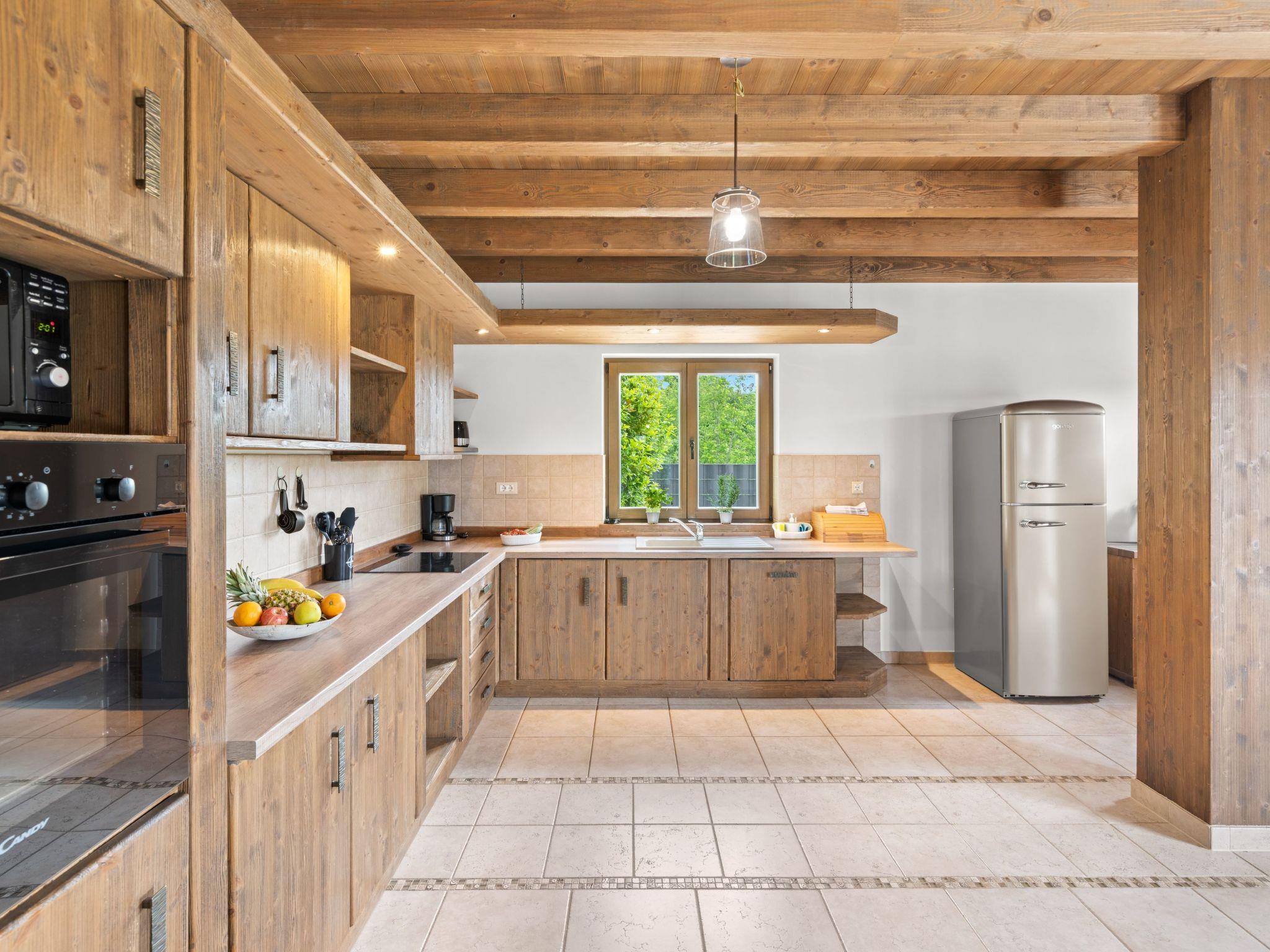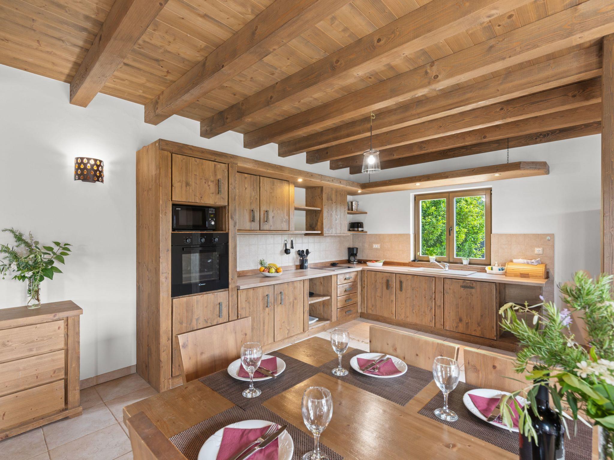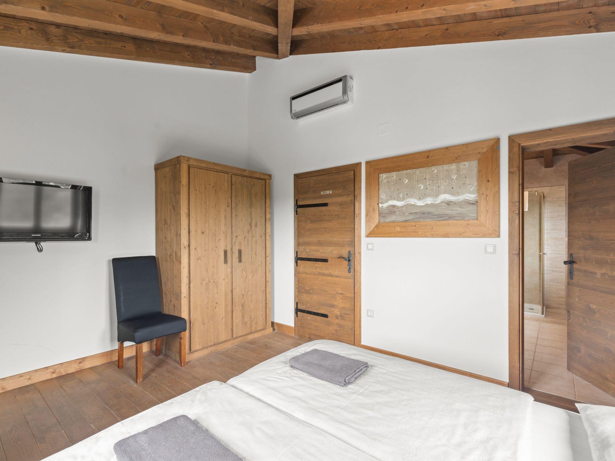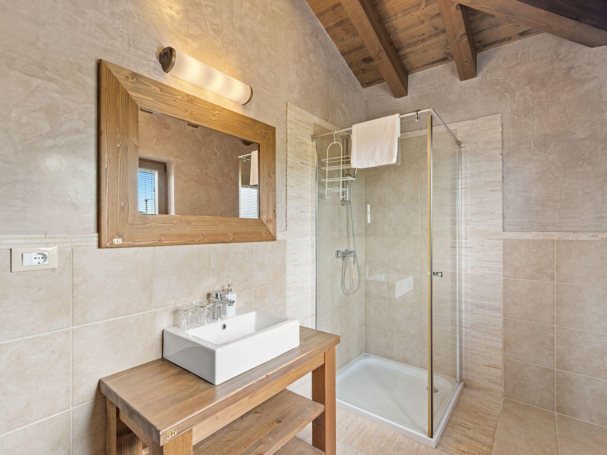 The interior of Villa Dante impresses with an open-plan living area that immediately casts a spell with its charming furnishings. The massive day beds, the tasteful coffee table, an LCD TV and the attractive corner fireplace are just some of the highlights of the living room. The adjoining, generously designed kitchen with modern amenities such as an oven, microwave, ceramic hob, dishwasher and much more, invites you to create culinary masterpieces. The massive dining table seats up to ten people, perfect for enjoying meals together.