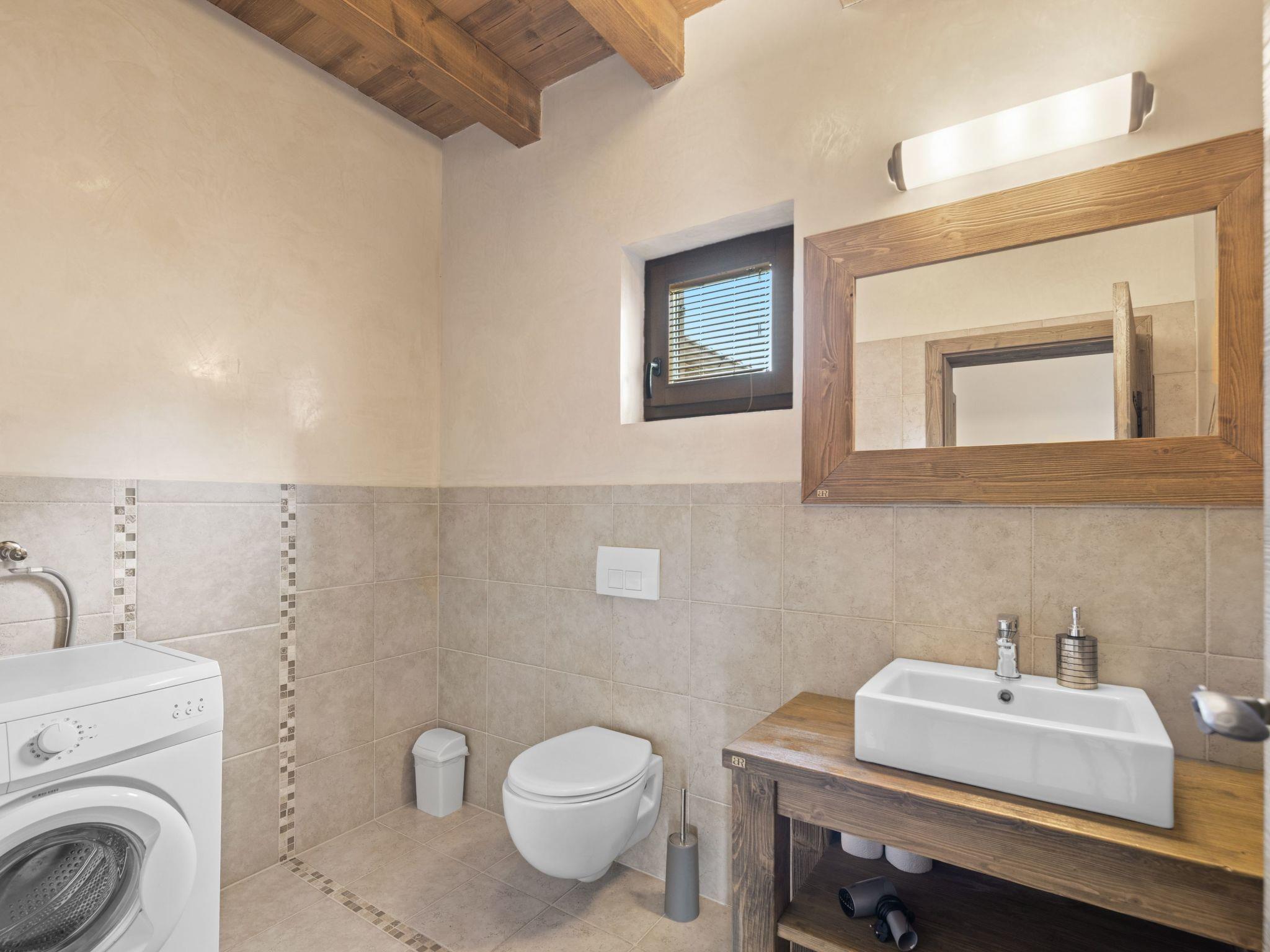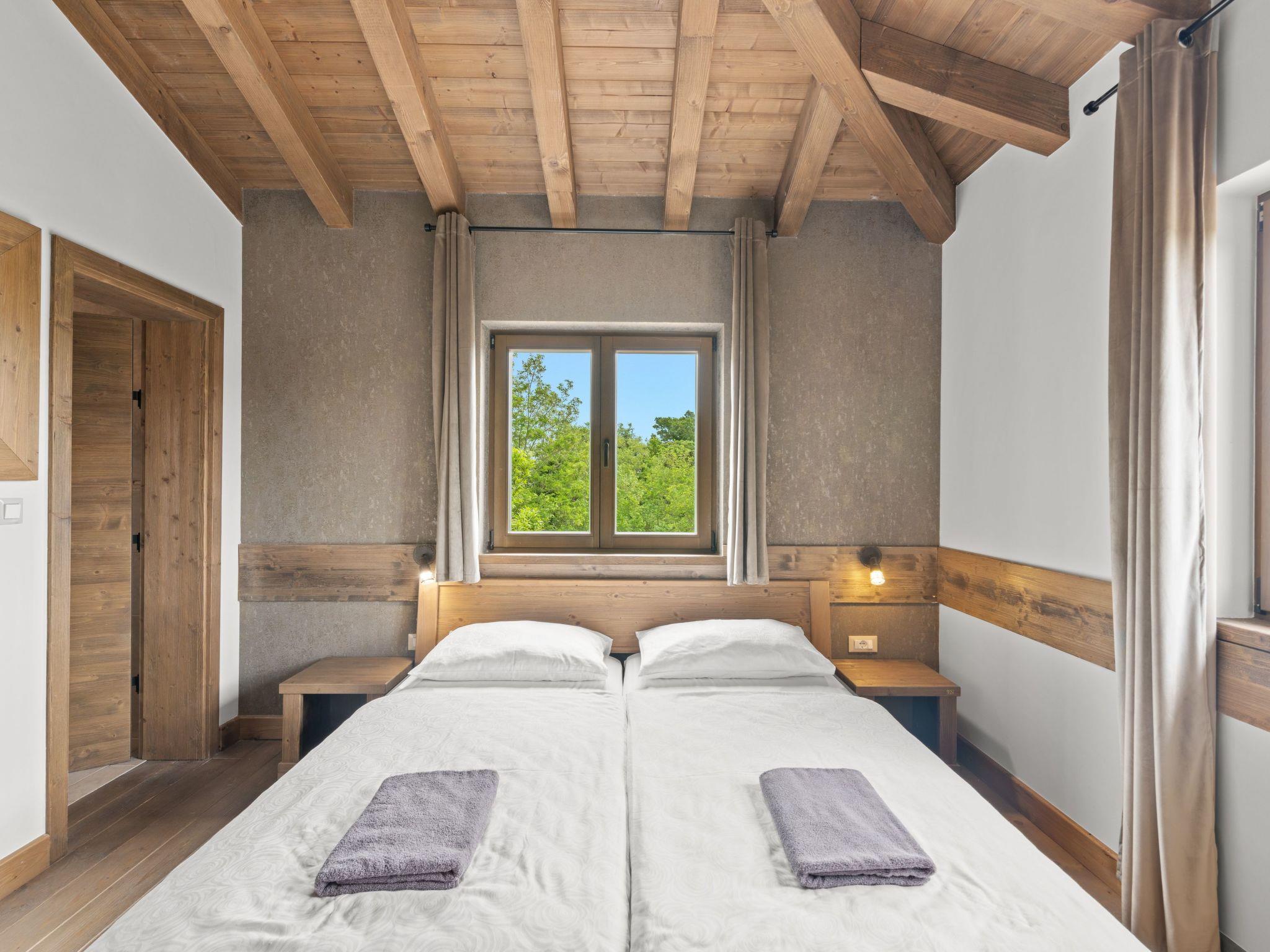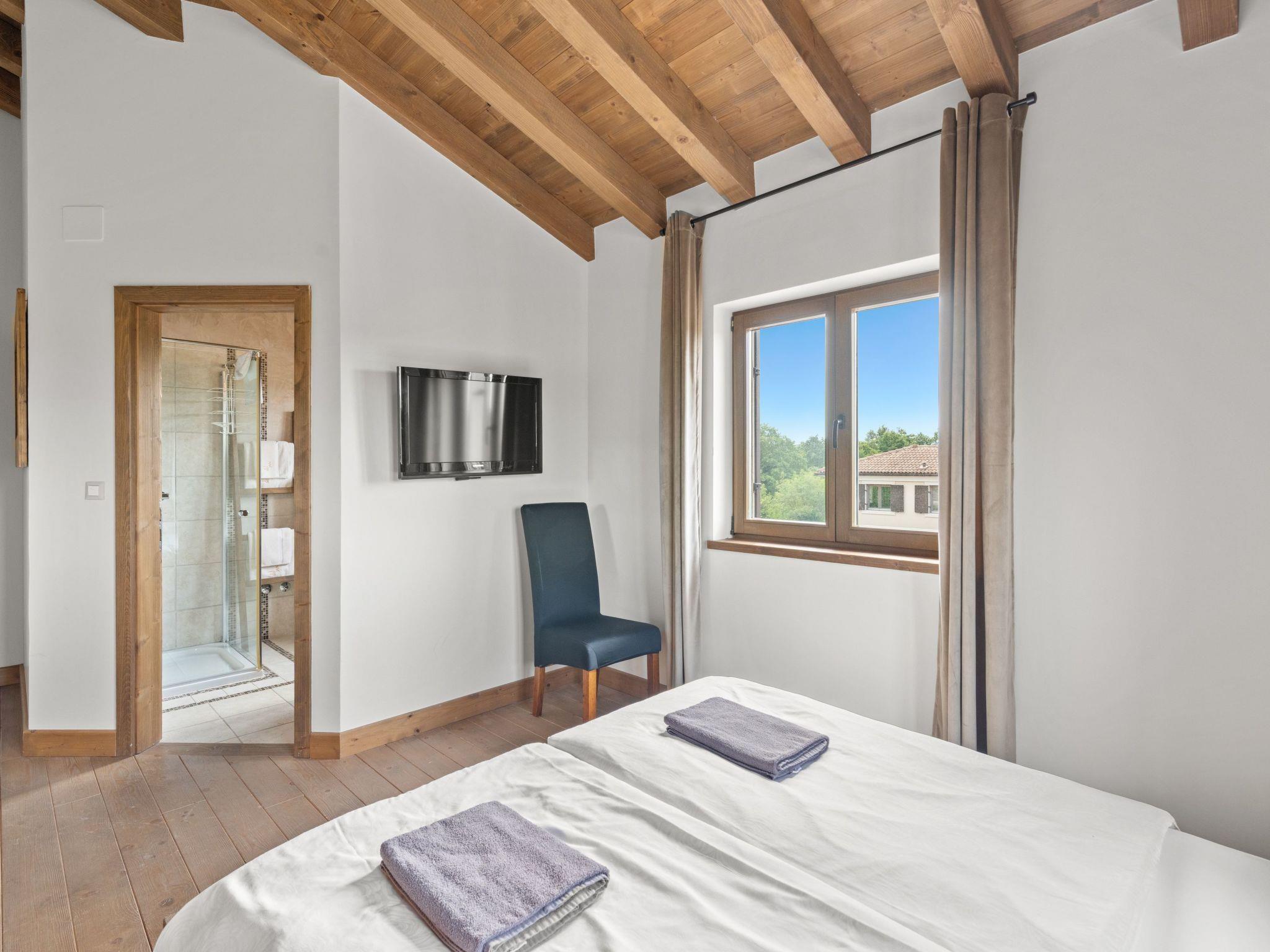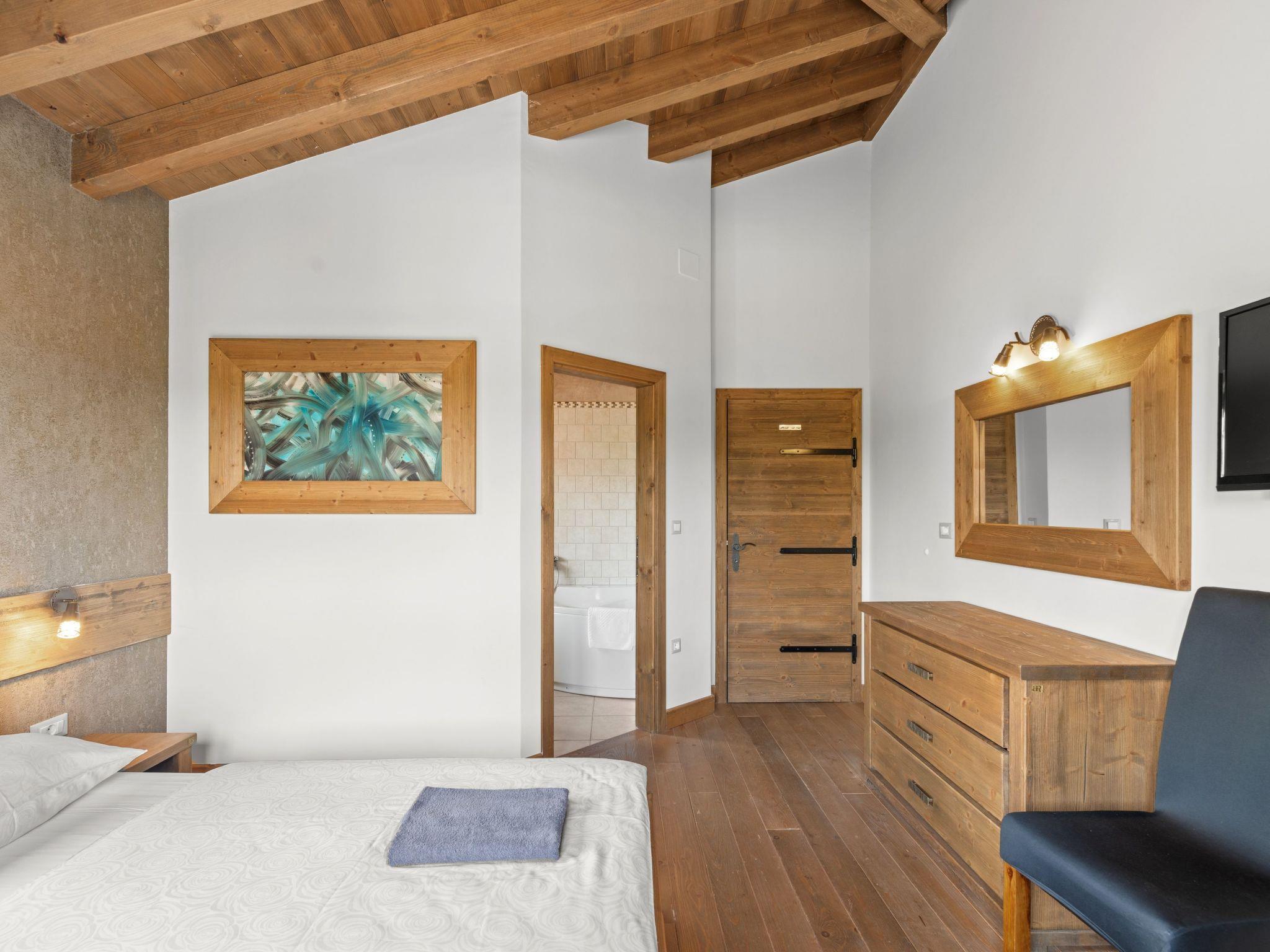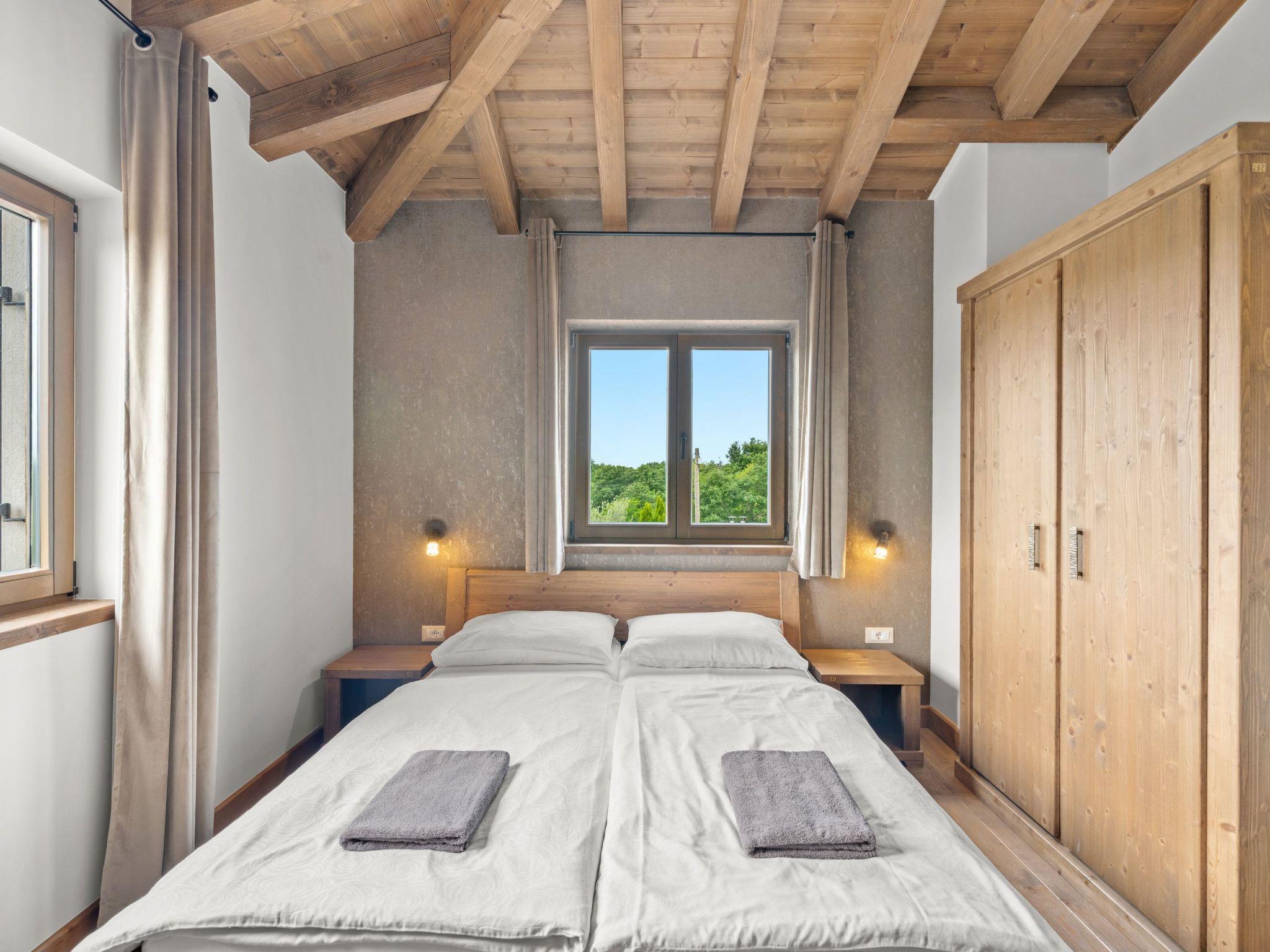 The interior of Villa Dante impresses with an open-plan living area that immediately casts a spell with its charming furnishings. The massive day beds, the tasteful coffee table, an LCD TV and the attractive corner fireplace are just some of the highlights of the living room. The adjoining, generously designed kitchen with modern amenities such as an oven, microwave, ceramic hob, dishwasher and much more, invites you to create culinary masterpieces. The massive dining table seats up to ten people, perfect for enjoying meals together.