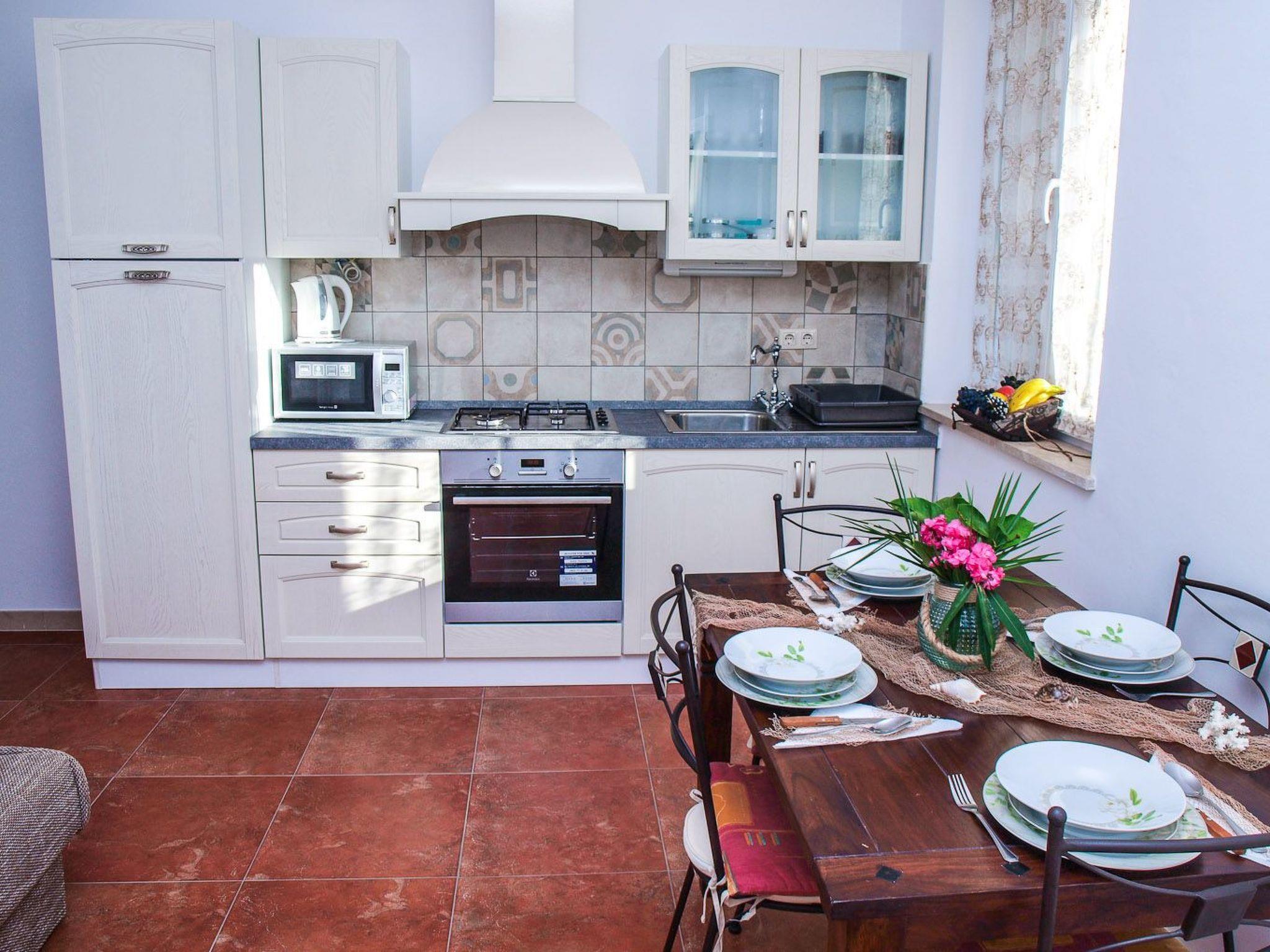 The apartment is located on the ground floor and is about 70 square meters in size. It consists of two bedrooms with separate entrances (separated by a yard) and an open living room, dining room and kitchen. Each bedroom has its own bathroom with shower. The apartment is fully equipped with air conditioning, satellite TV, Wi-Fi, stove and oven, refrigerator and washing machine. A baby cot is available on request.