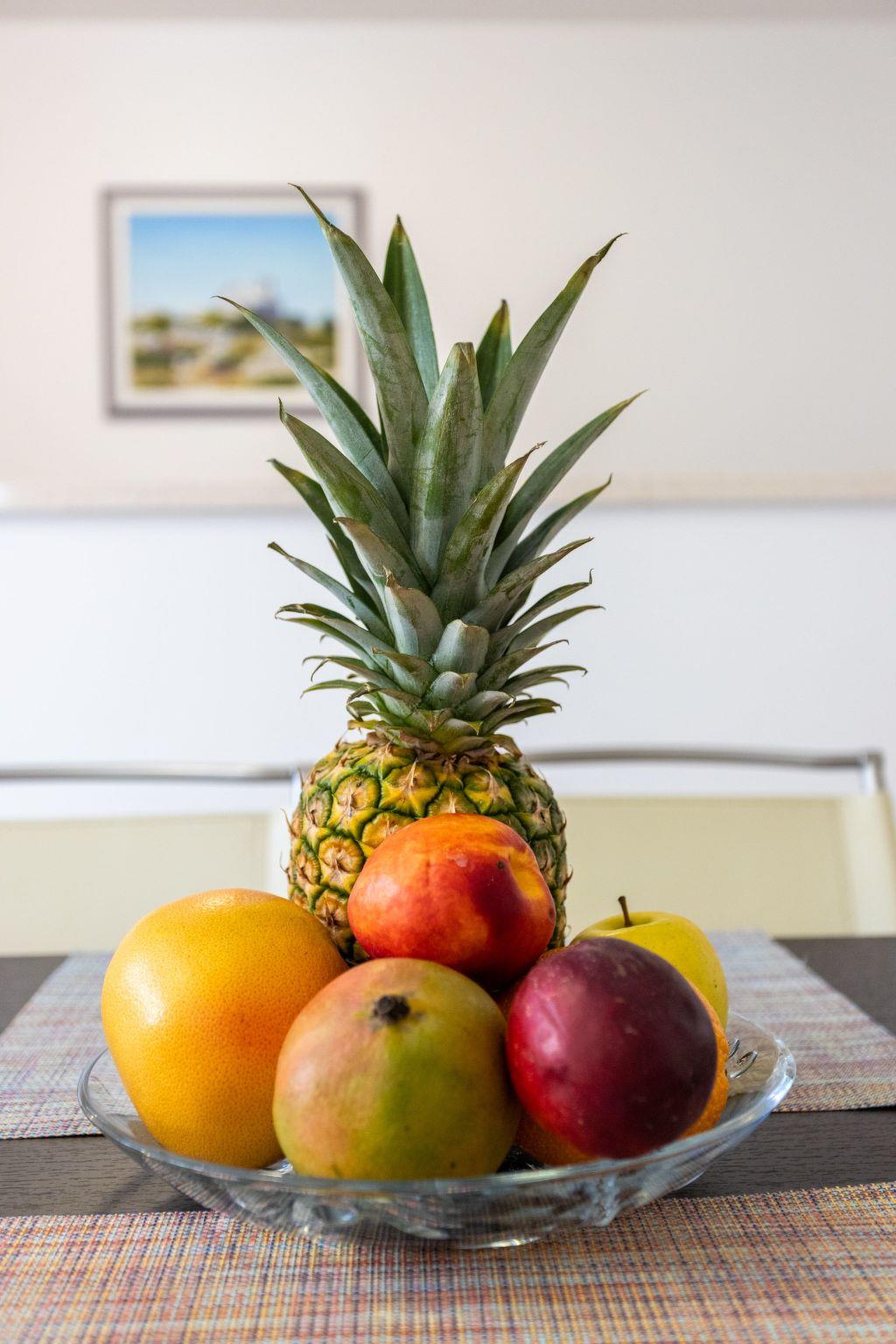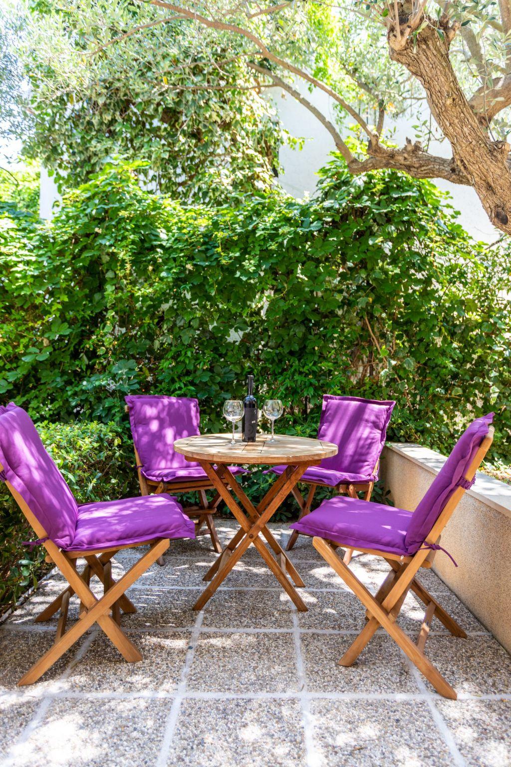 The living room opens directly onto your private sunny balcony, where you can enjoy leisurely holiday breakfasts at the table with chairs with an extensive panoramic view over the blue sea.