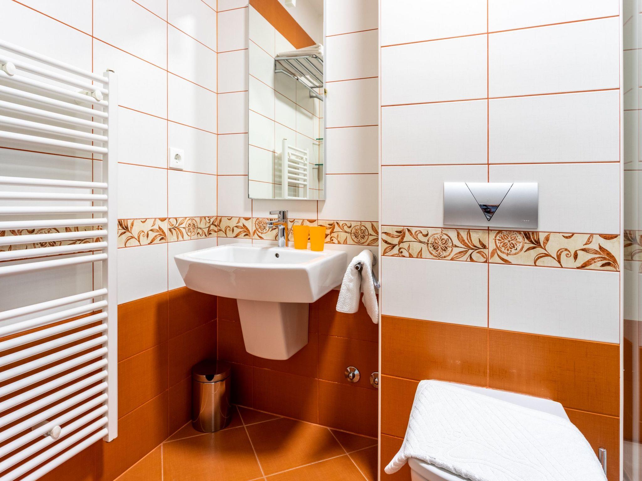 The 56m² apartment on the first floor consists of an open living and dining room with an integrated, fully-equipped kitchen, two bedrooms and a very modern daylight bathroom. The living room provides a comfortable sofa, an armchair, a flatscreen TV with satellite channels, a radio, a games console, a safe for your valuables and a dining table with six chairs. The black and white built-in kitchen next to it is equipped with a ceramic hob with a cooker hood, a microwave, a fridge with a freezer compartment, a kettle, a coffee machine and plenty of crockery and cutlery. The two bedrooms are furnished with a double bed (160 x 200cm) and two single beds (90 x 200cm) respectively. The bathroom is fitted with a spacious shower cubicle, a washbasin with a wall mirror, a toilet and even a washing machine with a dryer function. Plenty of bed linen and towels are provided and the wireless Internet connection is included in the rental price.