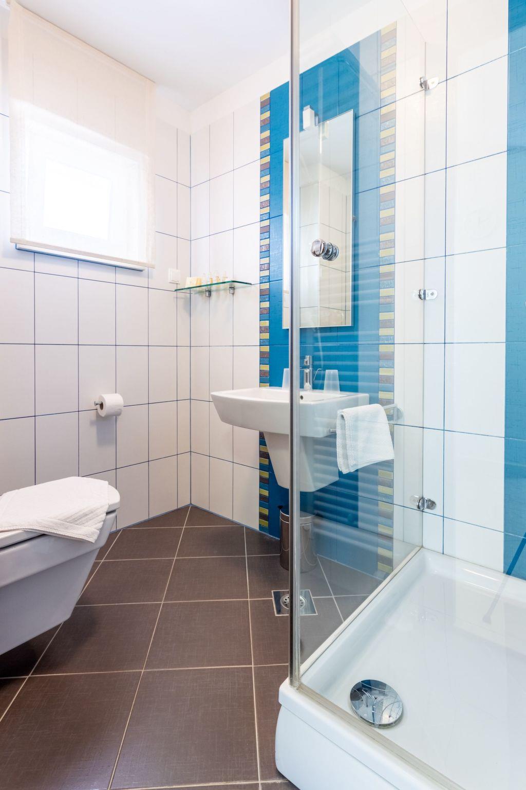 The 34m² studio apartment on the upper floor consists of an open living room and bedroom with an integrated, fully-equipped kitchen and a very modern daylight bathroom. The living room provides a double bed (160 x 200cm), an armchair, a flatscreen TV with satellite channels, a radio, a games console, a safe for your valuables and a dining table with two chairs. The brown and cream-coloured built-in kitchen next to it is equipped with a two-zone ceramic hob, a microwave, a fridge with a freezer compartment, a kettle, a coffee machine and plenty of crockery and cutlery. The bathroom is fitted with a spacious shower cubicle, a washbasin with a wall mirror, a toilet and even a washing machine with a dryer function. Plenty of bed linen and towels are provided and the wireless Internet connection is included in the rental price.