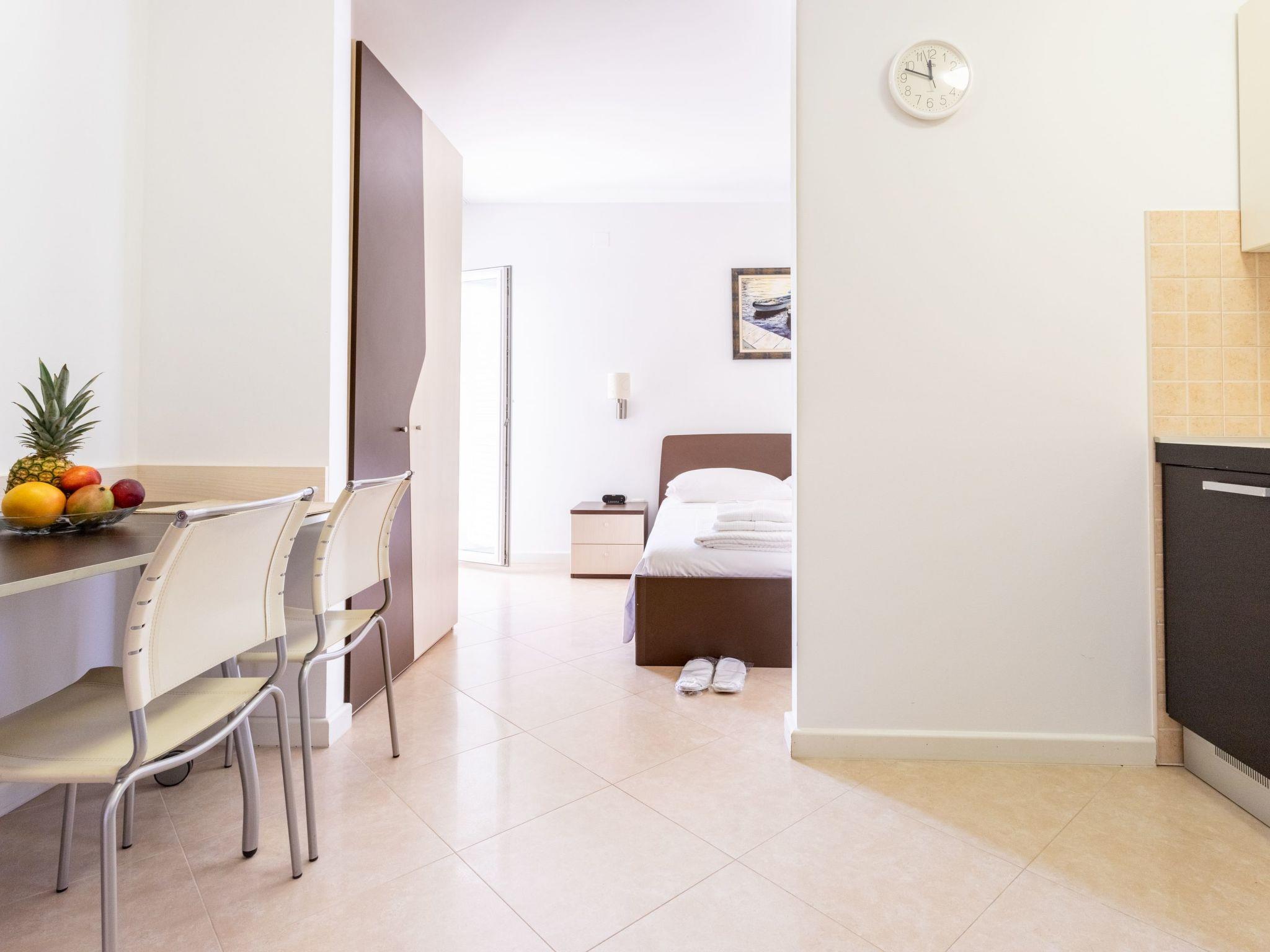 The living room opens directly onto your private sunny balcony, where you can enjoy leisurely holiday breakfasts at the table with chairs with an extensive panoramic view over the blue sea.