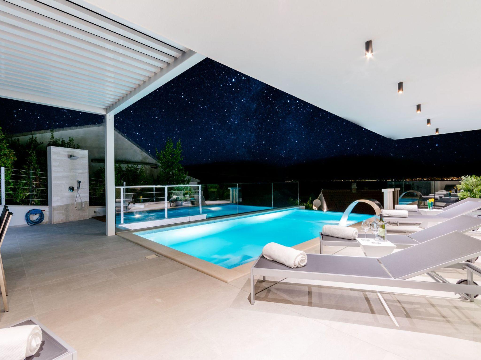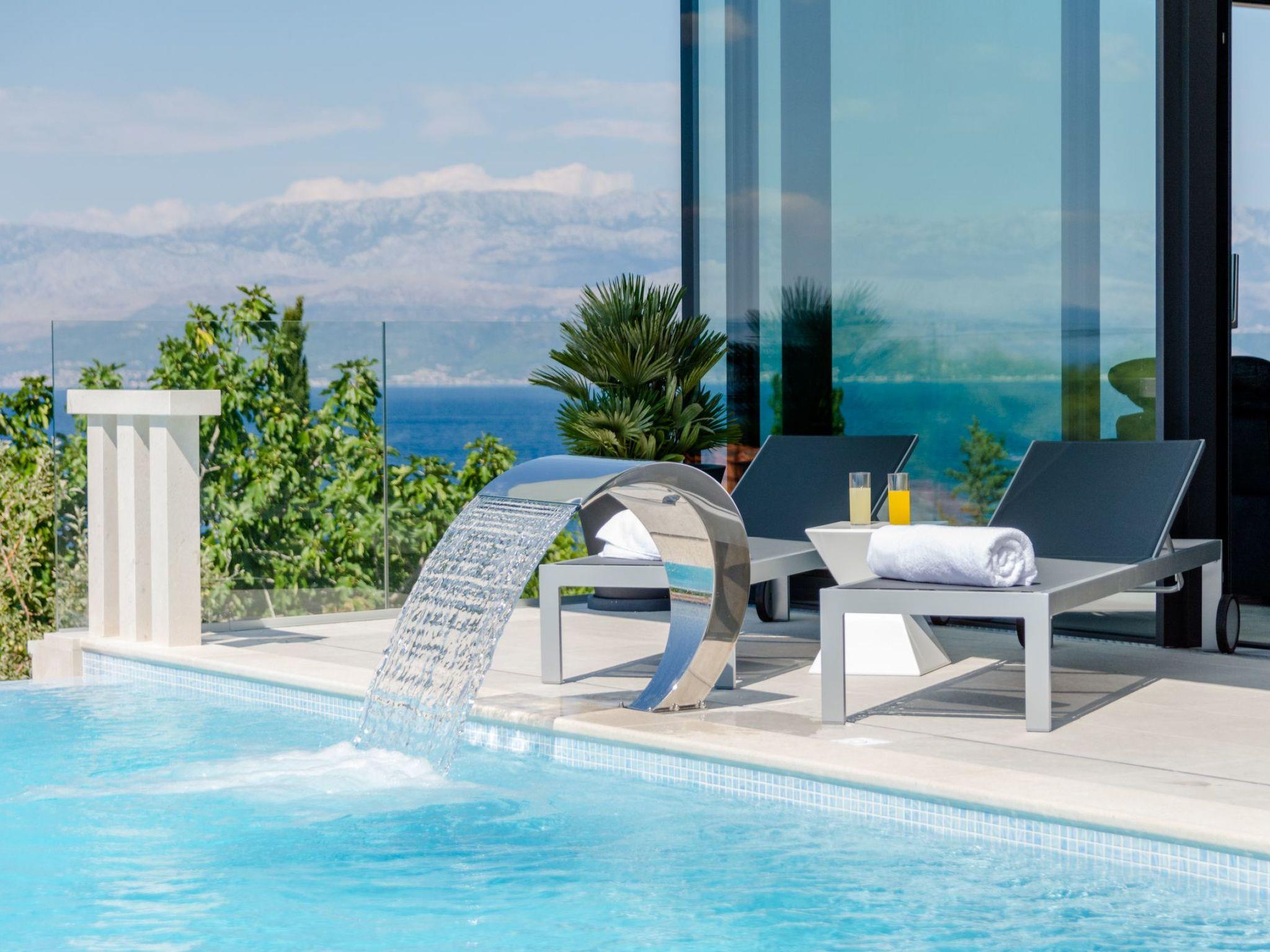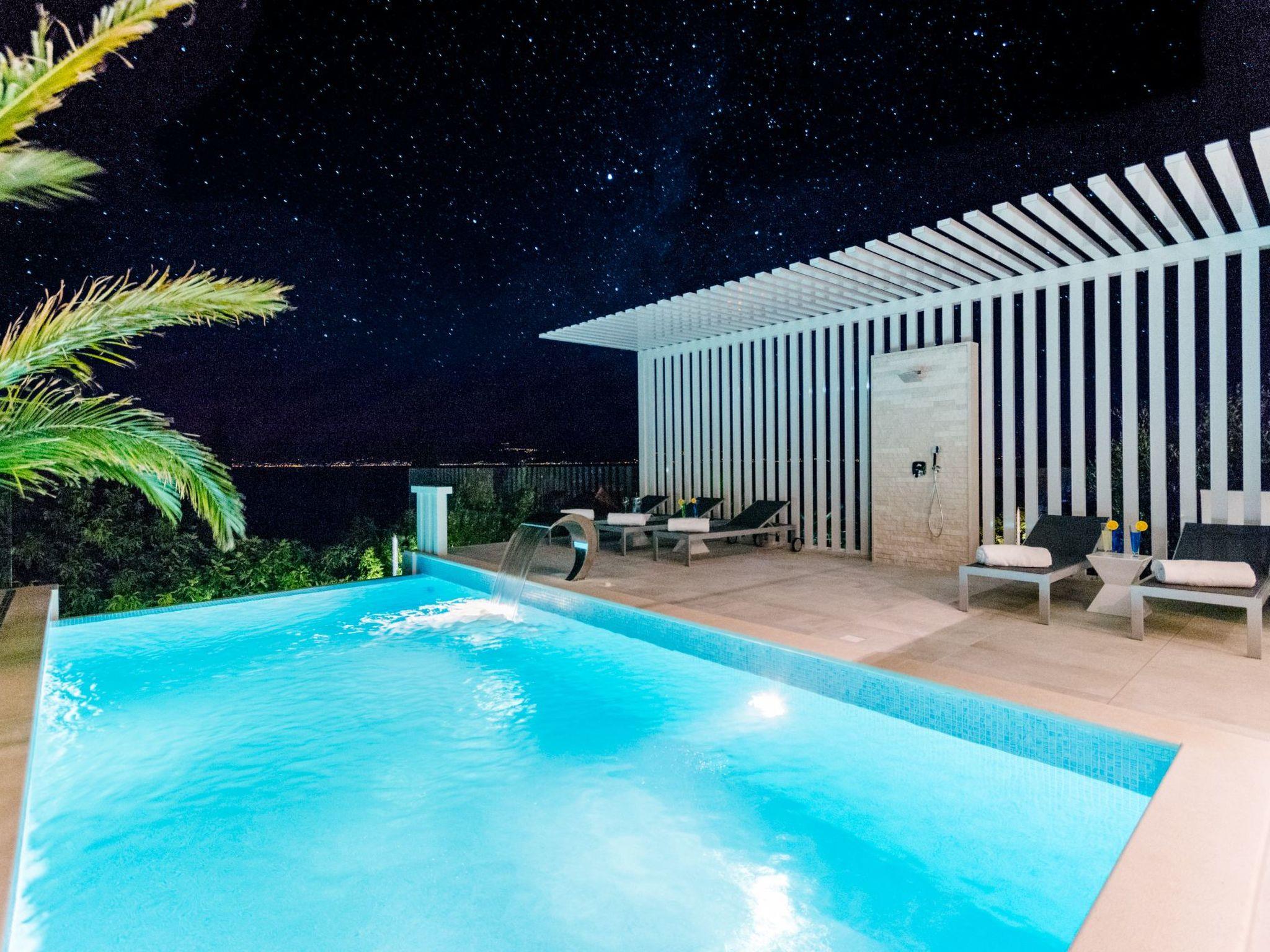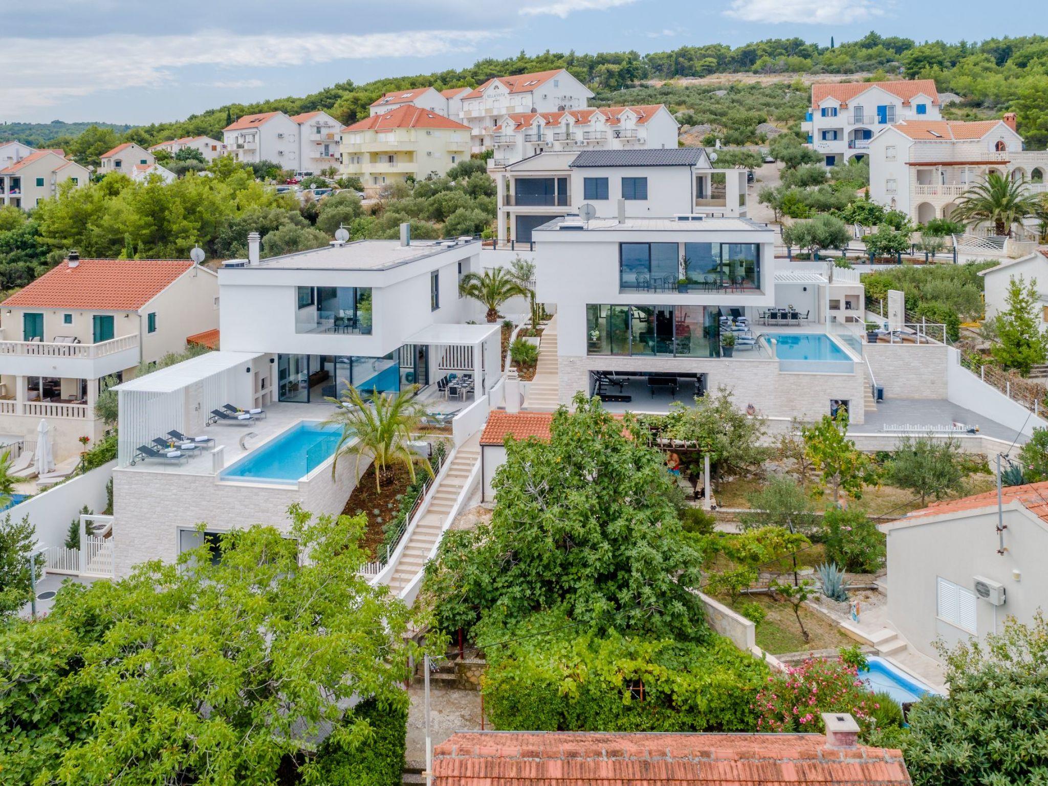 Our estate with a direct view of the Adriatic Sea was built in 2018 in compliance with cutting edge building standards, and it merges together state-of-the-art architecture and elegant luxury. You can observe the starry night sky from the seemingly edgeless heated infinity swimming pools, or enjoy the sunrise while having a delicious breakfast on one of our spacious terraces. Our stylishly furnished 620 m2 villa complex offers you two fitness rooms, as well as two ping pong tables. Six exclusively furnished bedrooms with private bathrooms and king-size beds welcome you to dreamland. We also provide you with free high-speed wireless Internet, as well as with LED smart TVs in every bedroom and in the living room.
