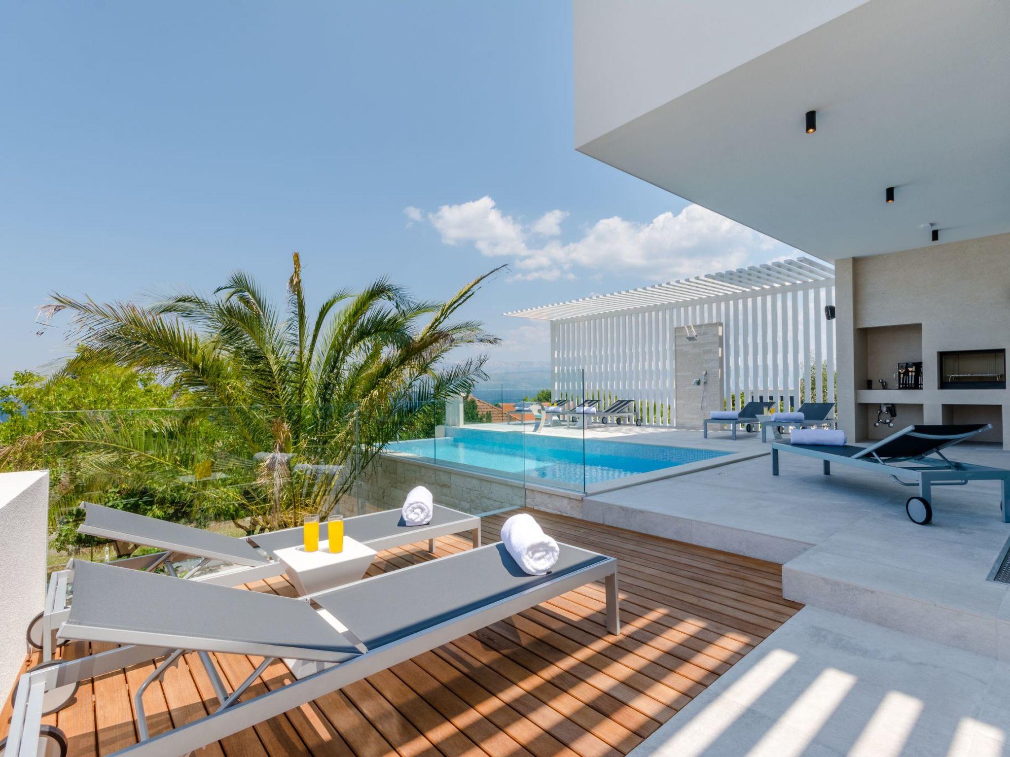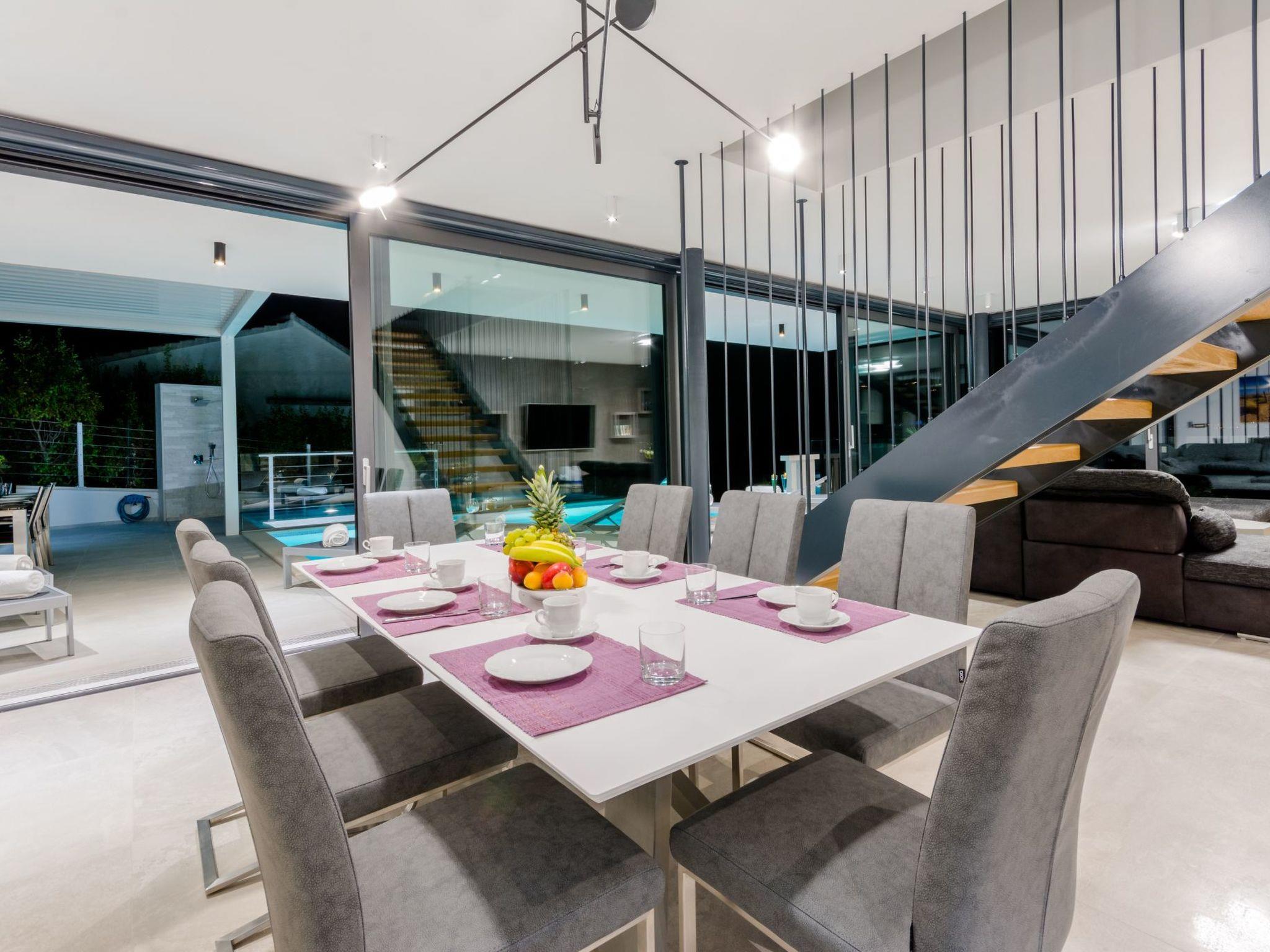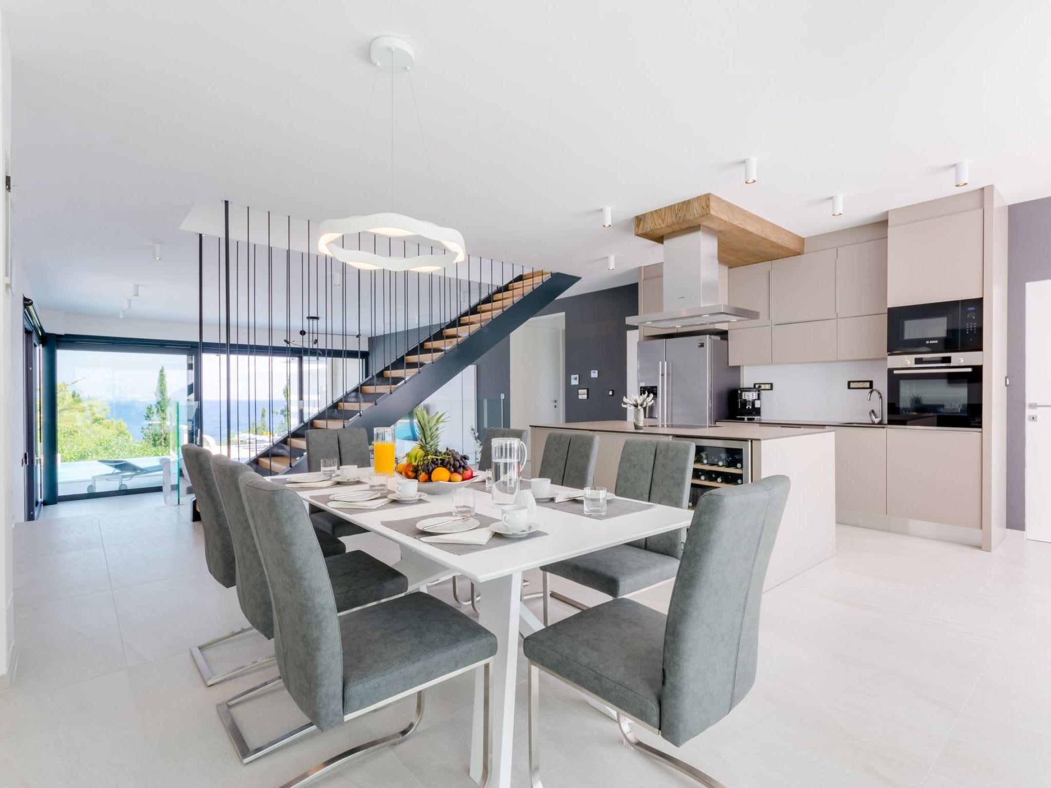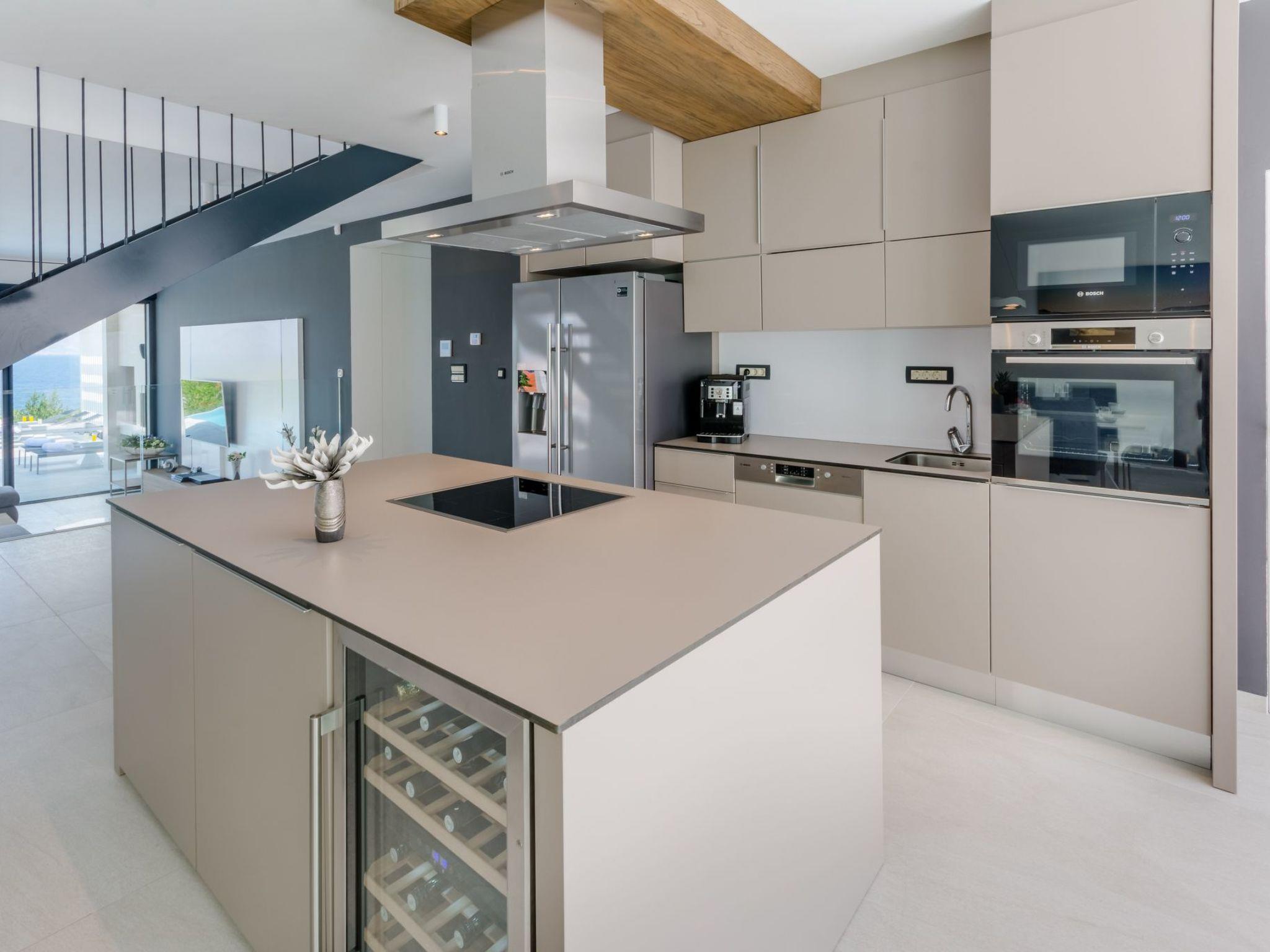 Our estate with a direct view of the Adriatic Sea was built in 2018 in compliance with cutting edge building standards, and it merges together state-of-the-art architecture and elegant luxury. You can observe the starry night sky from the seemingly edgeless heated infinity swimming pools, or enjoy the sunrise while having a delicious breakfast on one of our spacious terraces. Our stylishly furnished 620 m2 villa complex offers you two fitness rooms, as well as two ping pong tables. Six exclusively furnished bedrooms with private bathrooms and king-size beds welcome you to dreamland. We also provide you with free high-speed wireless Internet, as well as with LED smart TVs in every bedroom and in the living room.