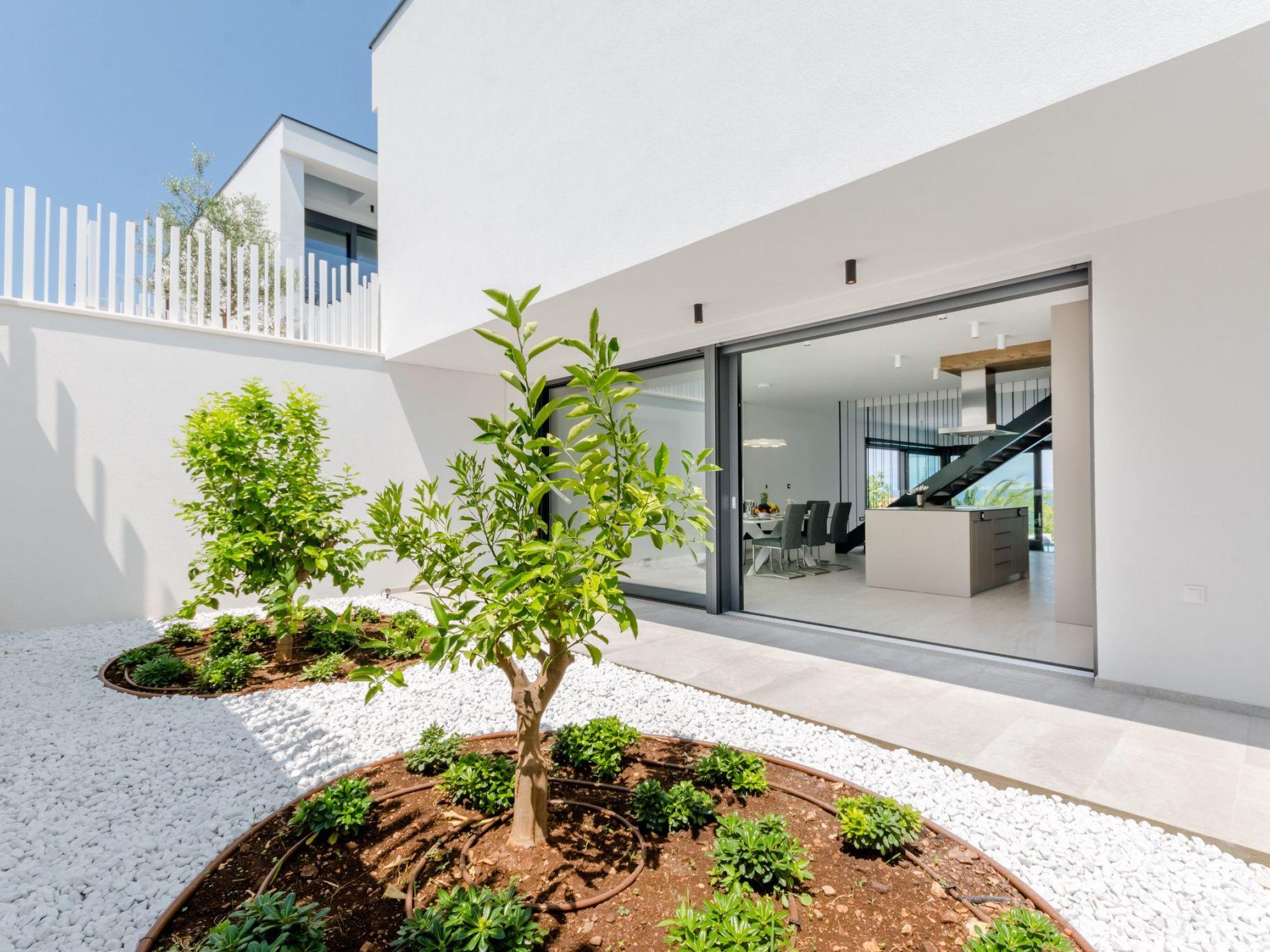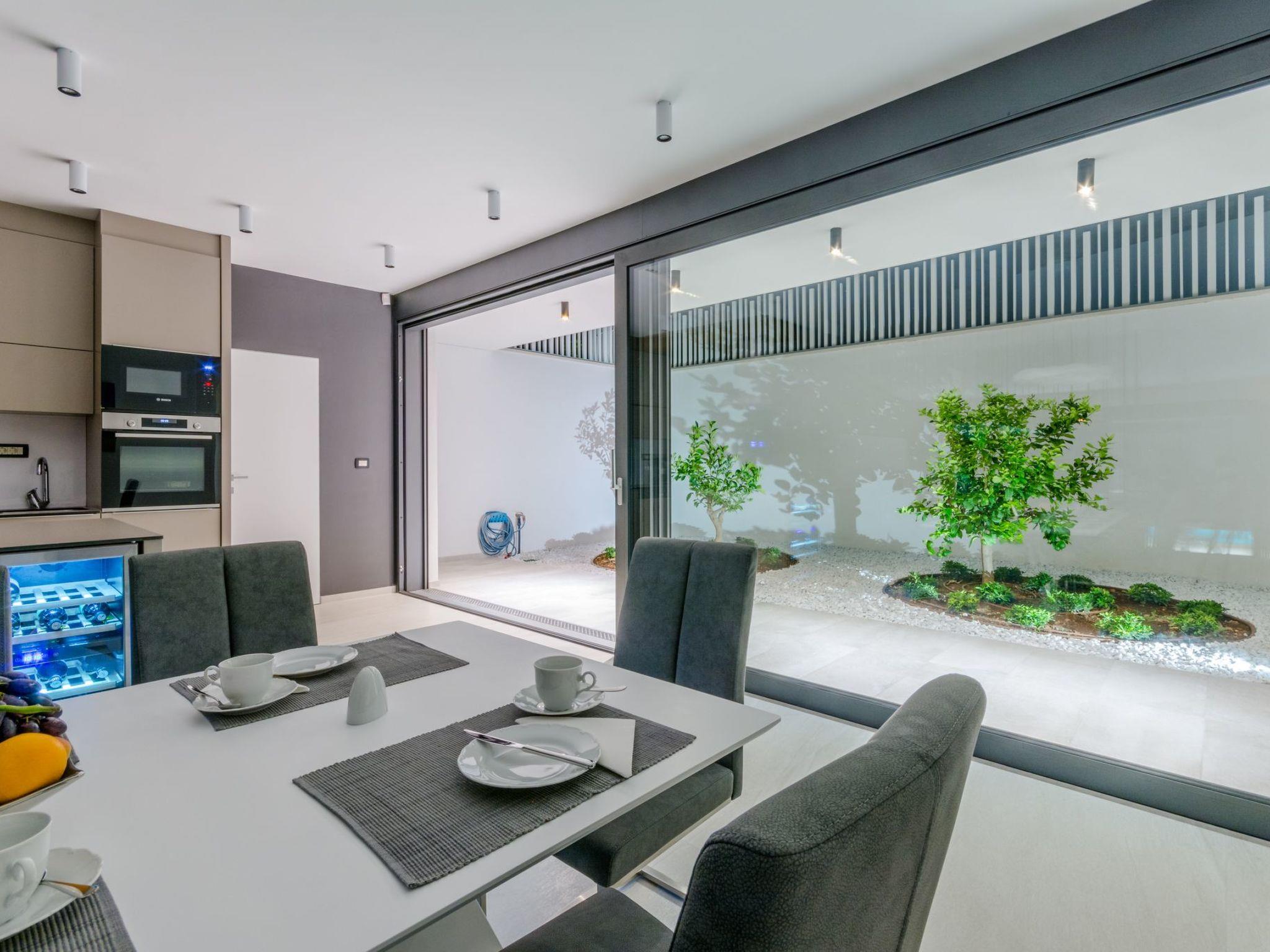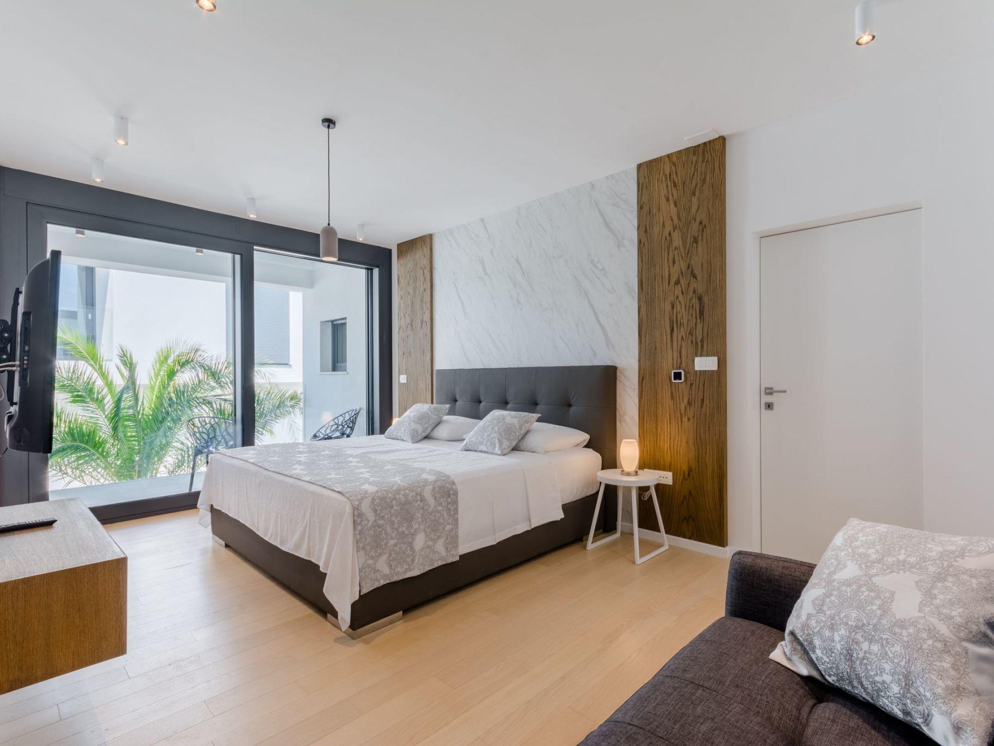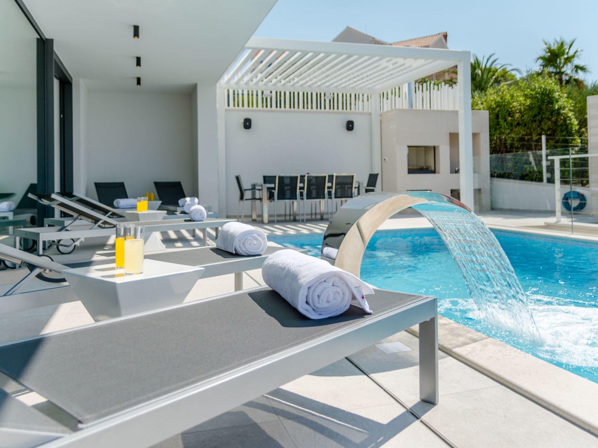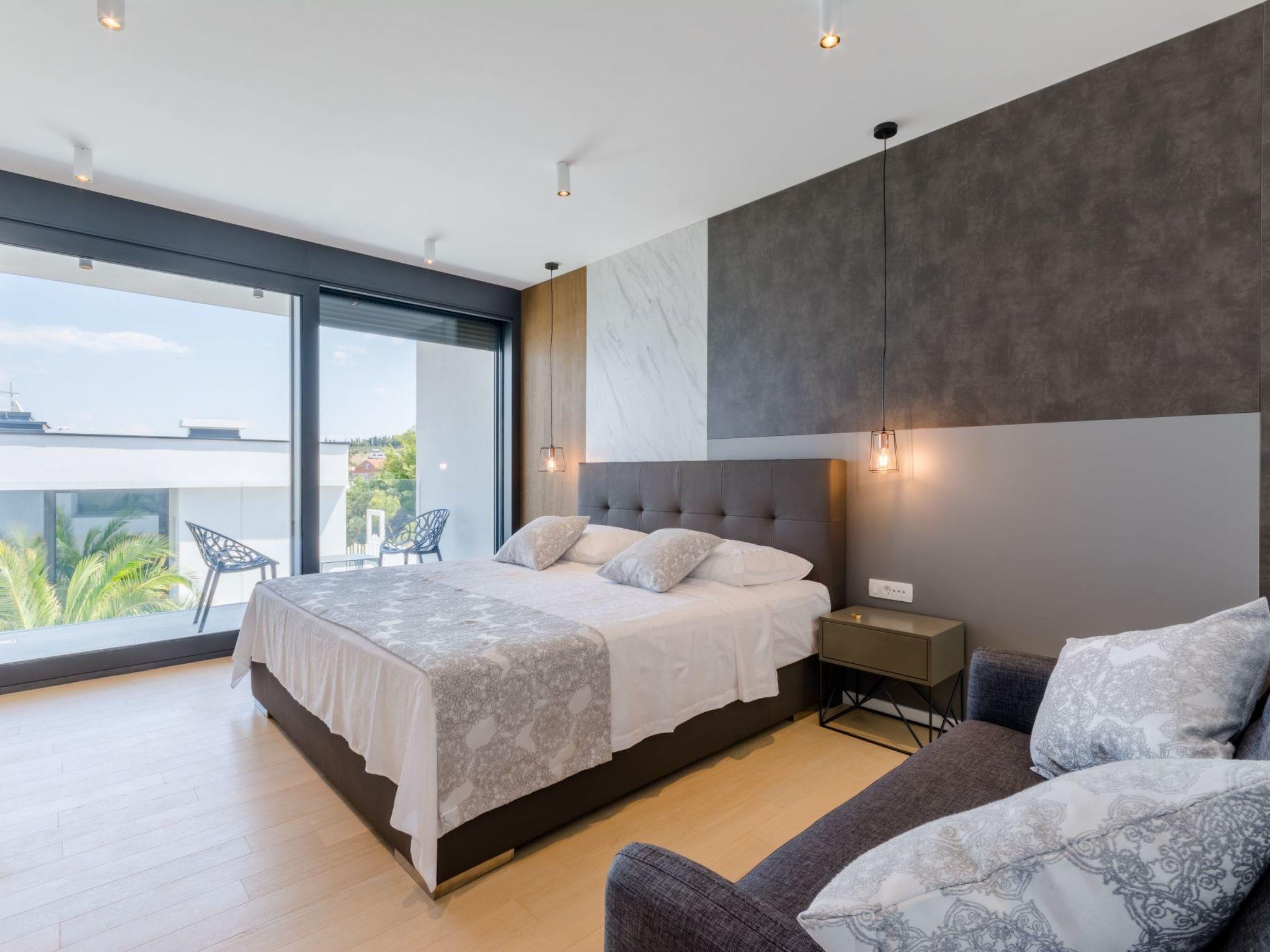 Our estate with a direct view of the Adriatic Sea was built in 2018 in compliance with cutting edge building standards, and it merges together state-of-the-art architecture and elegant luxury. You can observe the starry night sky from the seemingly edgeless heated infinity swimming pools, or enjoy the sunrise while having a delicious breakfast on one of our spacious terraces. Our stylishly furnished 620 m2 villa complex offers you two fitness rooms, as well as two ping pong tables. Six exclusively furnished bedrooms with private bathrooms and king-size beds welcome you to dreamland. We also provide you with free high-speed wireless Internet, as well as with LED smart TVs in every bedroom and in the living room.
