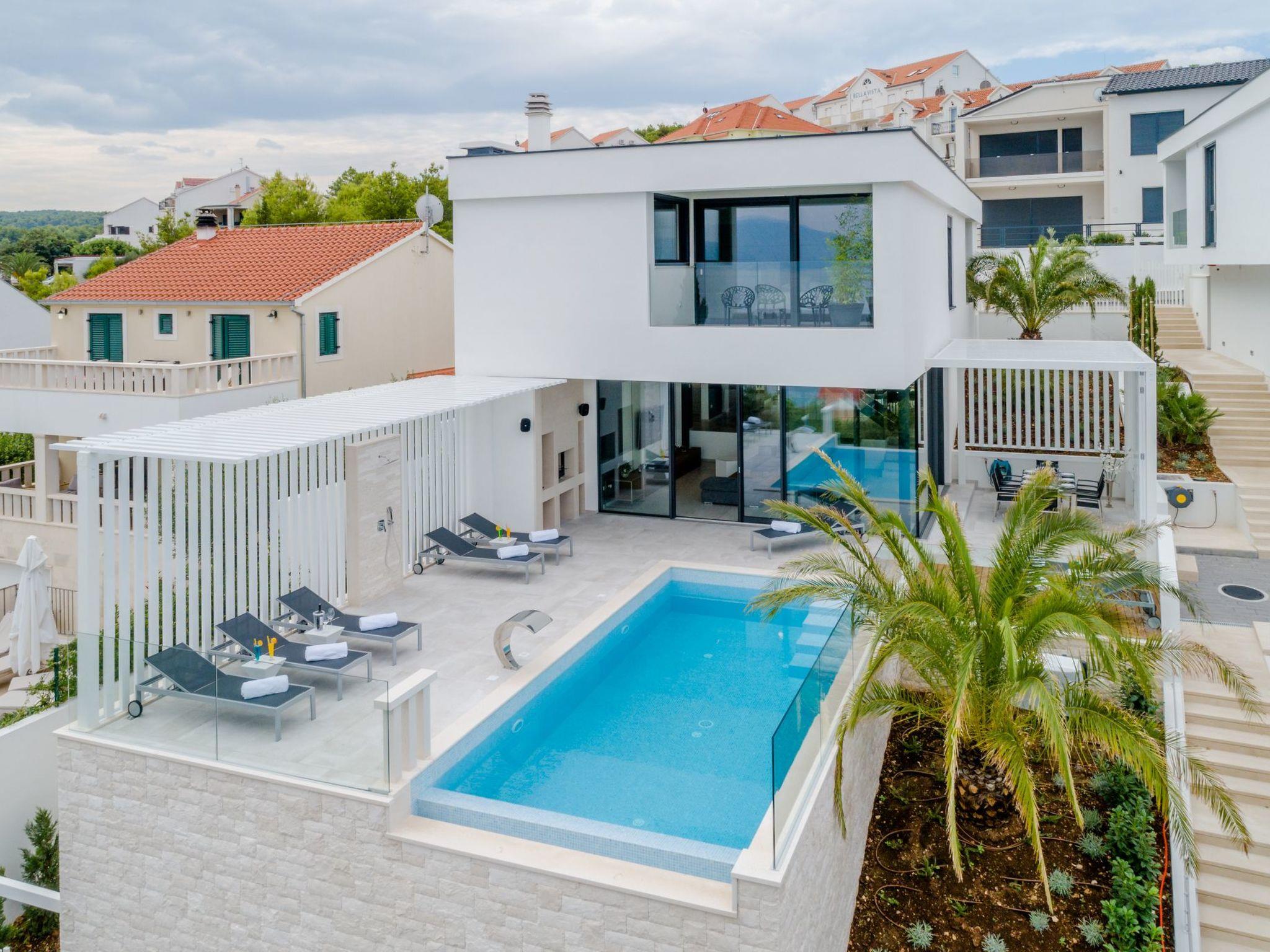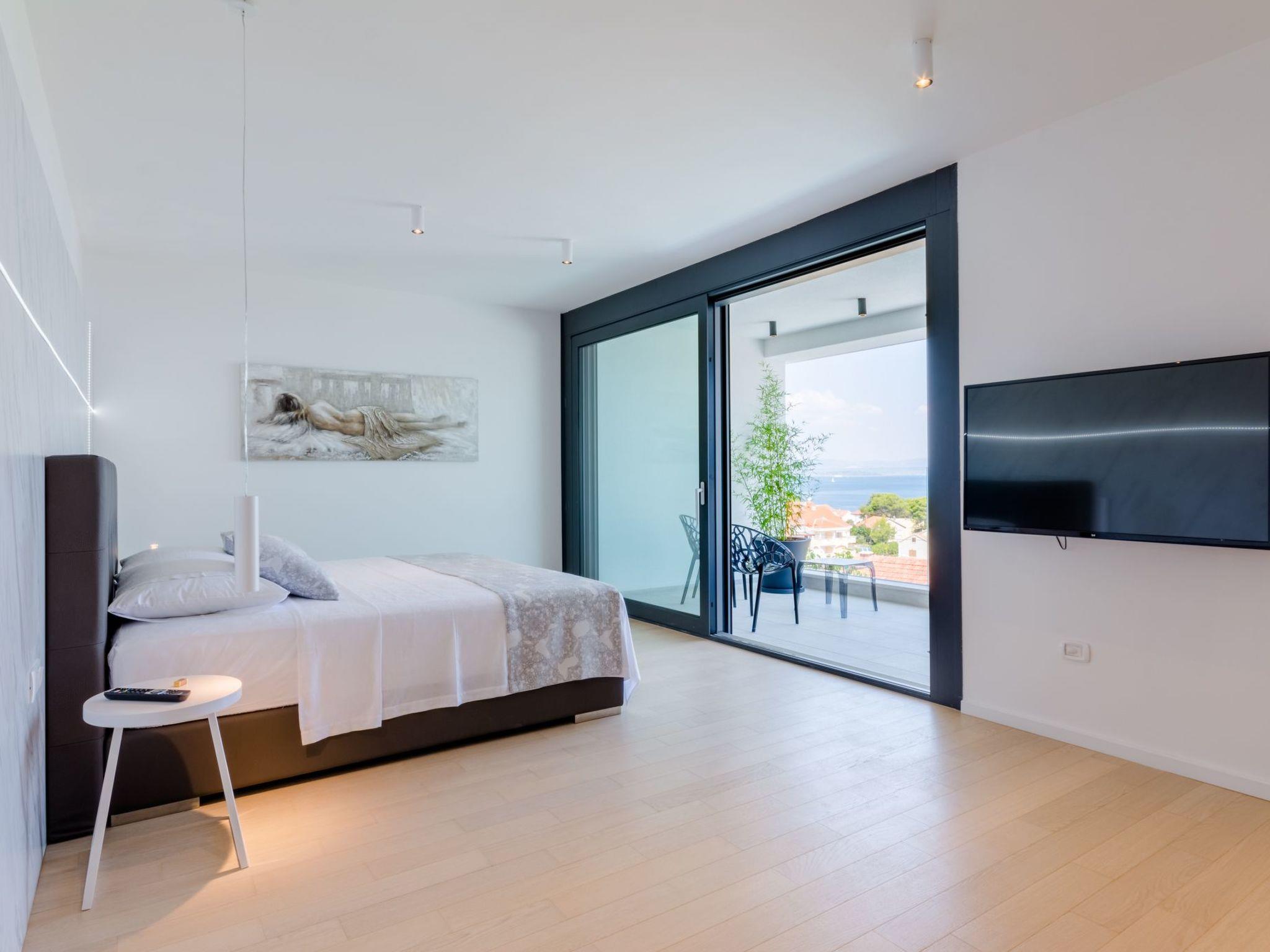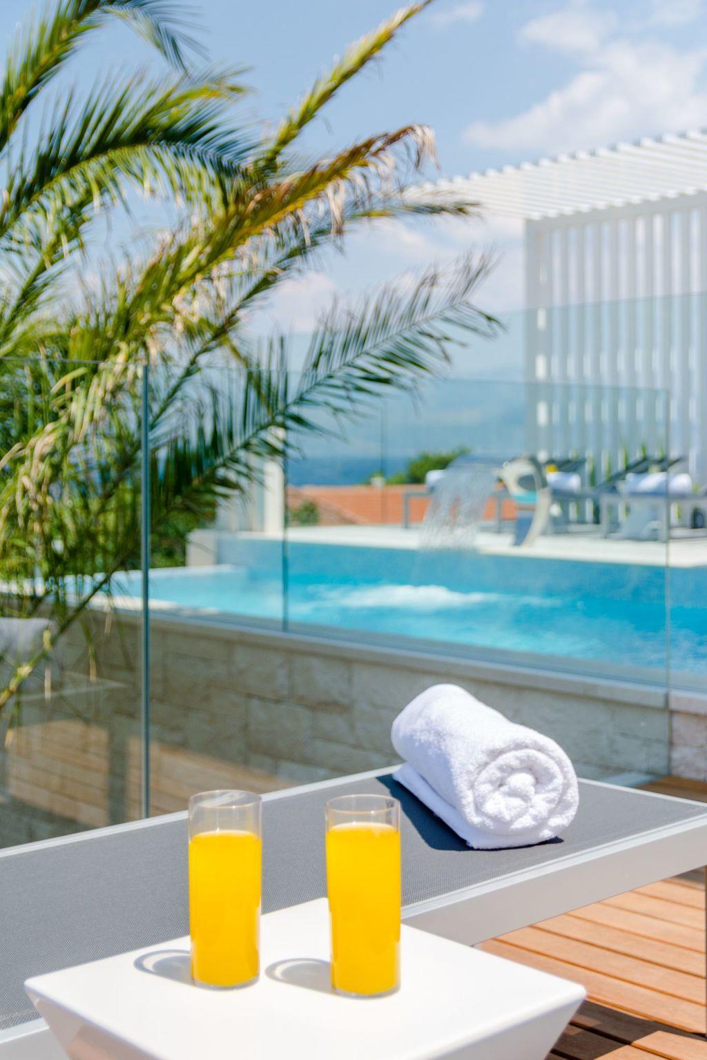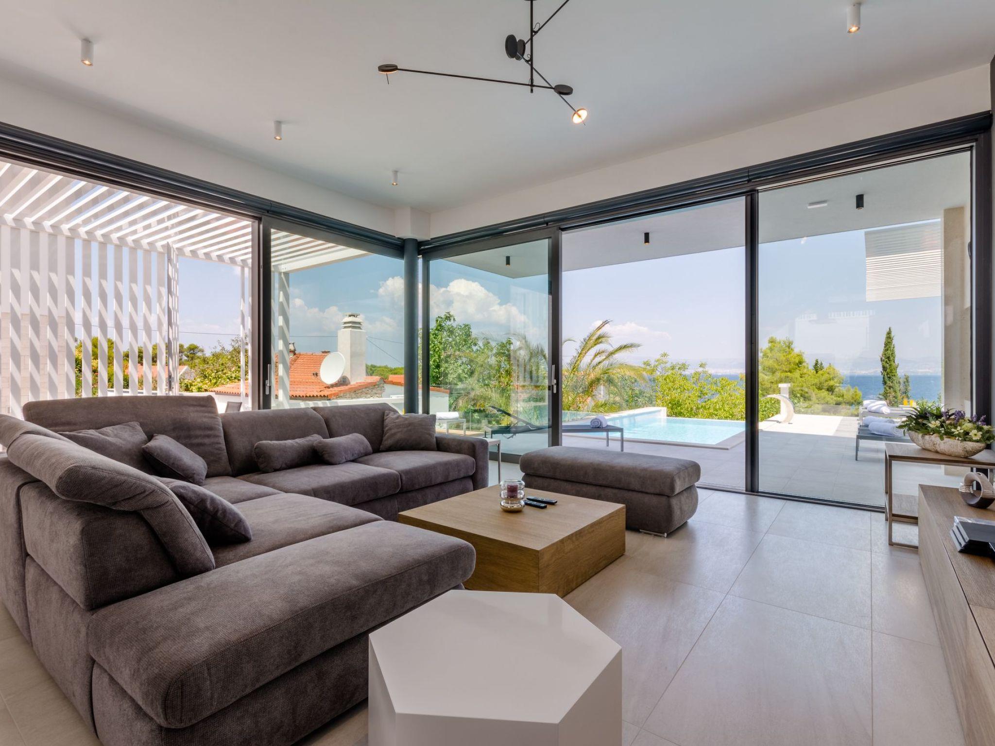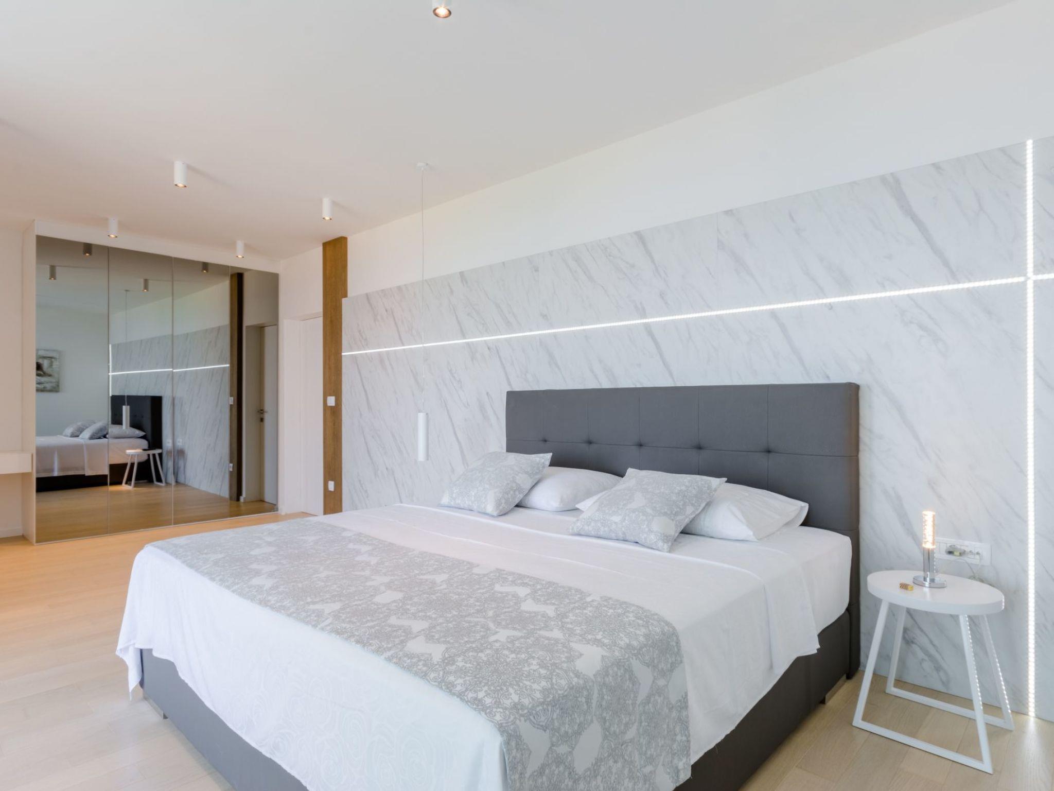Our estate with a direct view of the Adriatic Sea was built in 2018 in compliance with cutting edge building standards, and it merges together state-of-the-art architecture and elegant luxury. You can observe the starry night sky from the seemingly edgeless heated infinity swimming pool, or enjoy the sunrise while having a delicious breakfast on the spacious terrace. Our stylishly furnished 320 m2 villa offers you a fitness room, as well as a ping pong table. Three exclusively furnished bedrooms with private bathrooms and king-size beds welcome you to dreamland. We also provide you with free high-speed wireless Internet, as well as with LED smart TVs in every bedroom and in the living room.