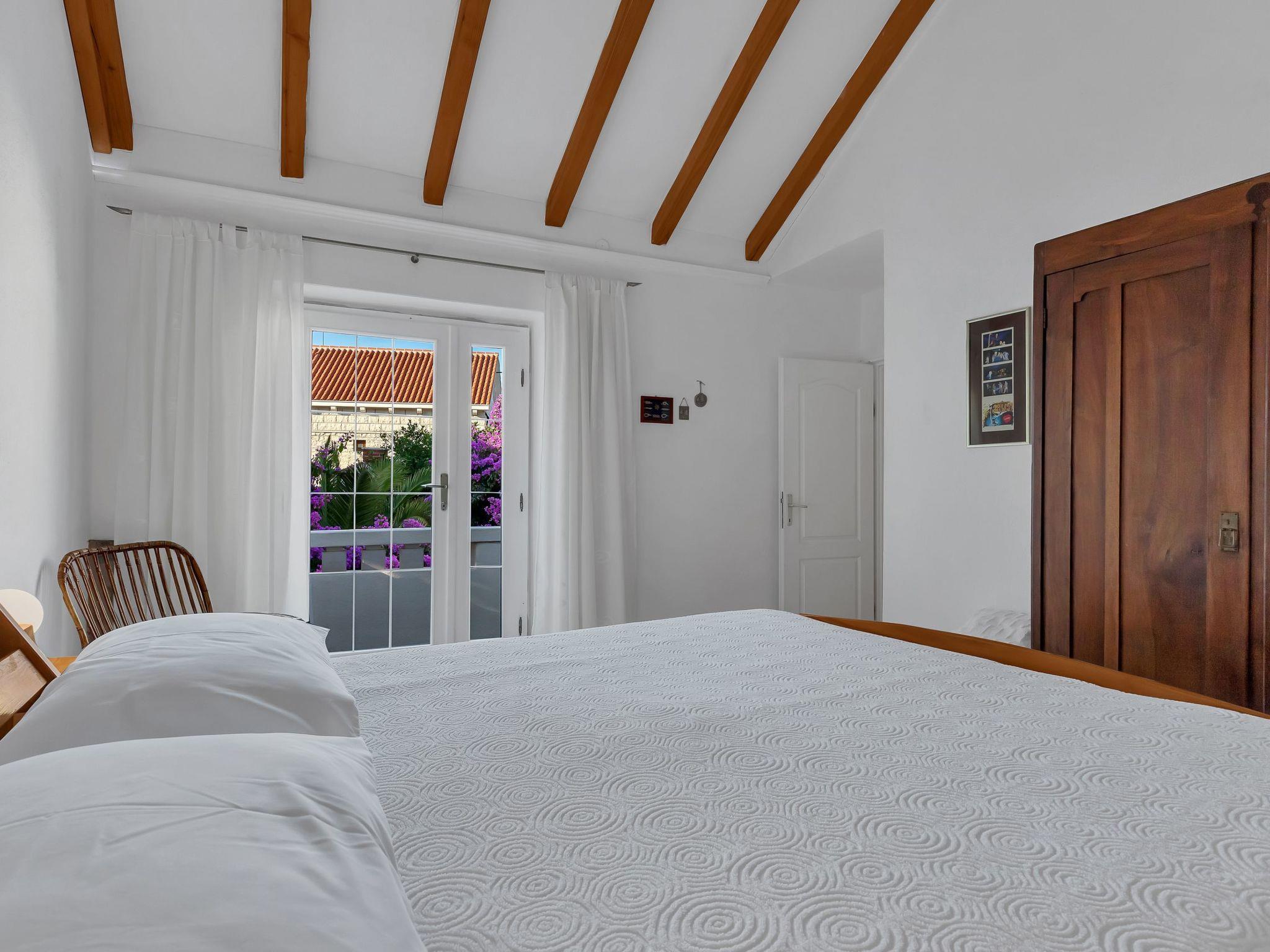 The interior of the house features a cosy, open-plan living area with two attractive seating areas, a dining table for 6 people and a fully equipped kitchen in a charming country house style with white fronts. The kitchen has everything you need for a personalised stay, from an oven and dishwasher to a coffee machine and toaster. Not forgetting the pretty crockery, which invites you to prepare a delicious meal with fresh ingredients from the local fish market in Sutivan.
