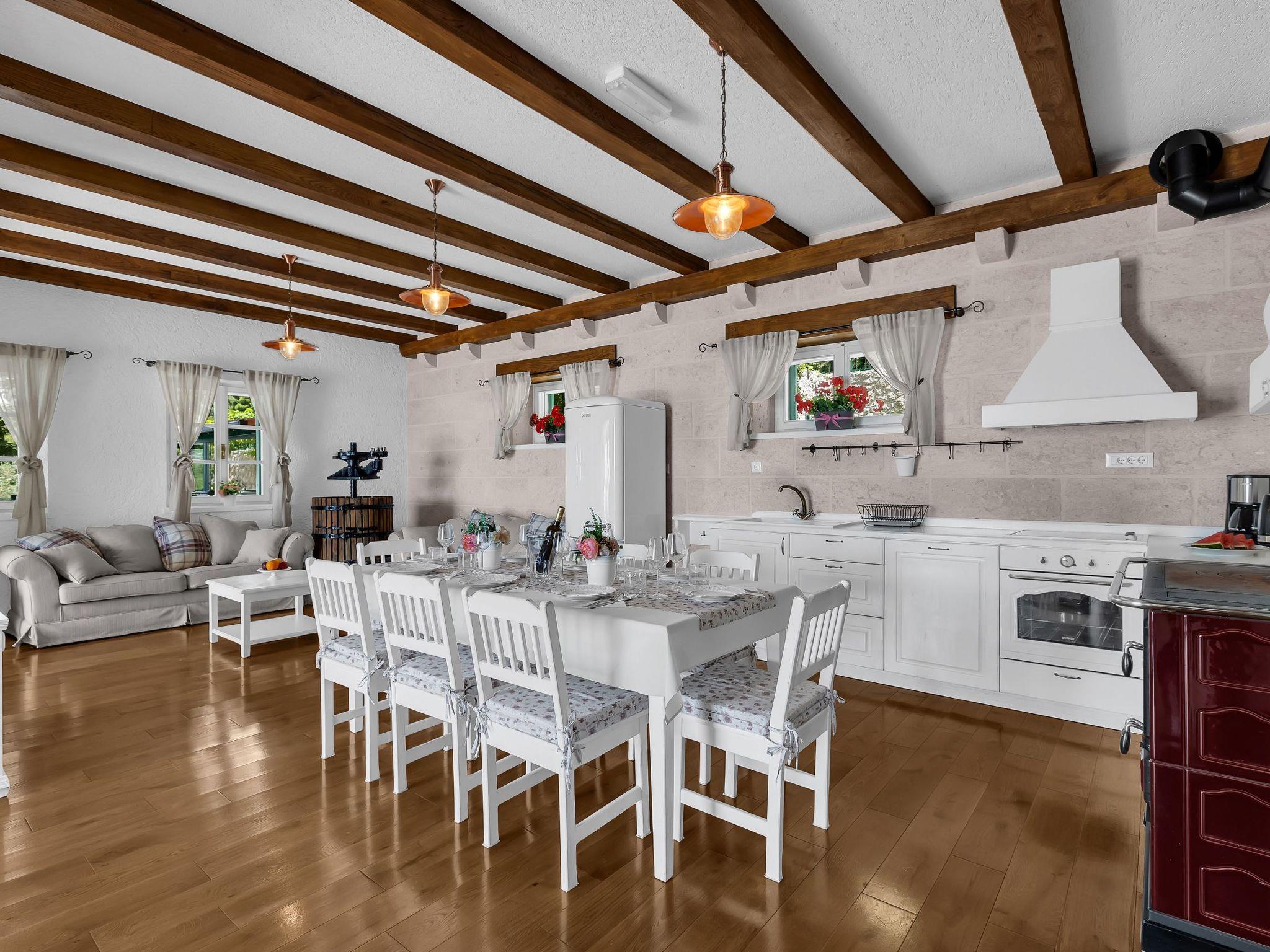 The exterior of the holiday home is characterised by a spacious terrace and a balcony, which invite you to spend cosy hours outdoors. The garden for exclusive use and the private pool promise refreshing moments and relaxation under the Dalmatian sun. A fully fenced area makes the house safe and secure, ideal for guests seeking peace and quiet.