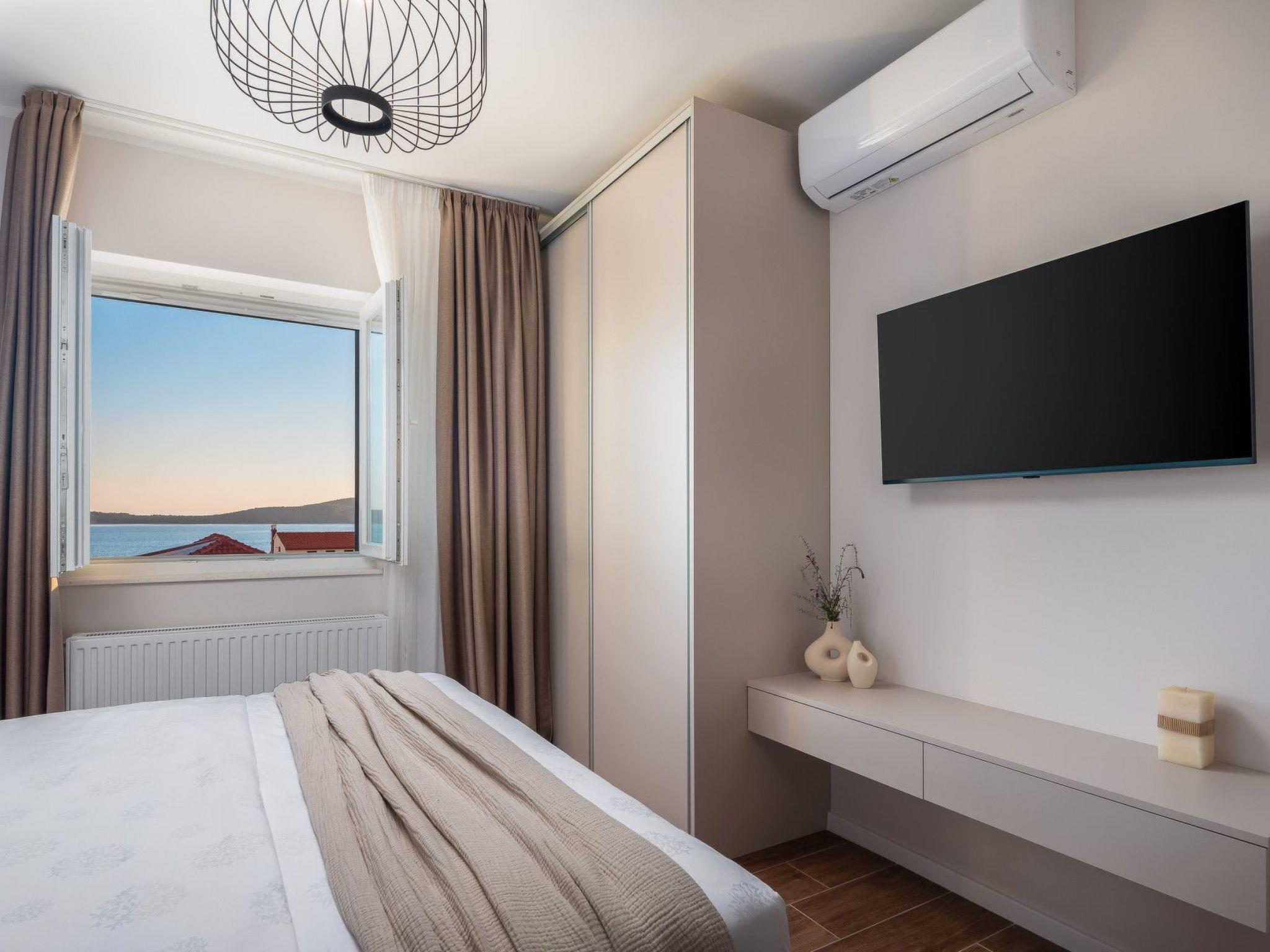 Inside, Villa Bianca Šibenik spreads its charm over two meticulously planned floors, providing ample space and privacy. The villa is equipped with six comfortable bedrooms and nine well-appointed bathrooms, ensuring every guest experiences ultimate comfort and convenience. The presence of air conditioning throughout the house guarantees a pleasant stay regardless of the season. Functional amenities like a washing machine, clothes dryer, coffee machine, dishwasher, electric kettle, and a fireplace add to the homely and inviting atmosphere, making every moment inside as enjoyable as possible.