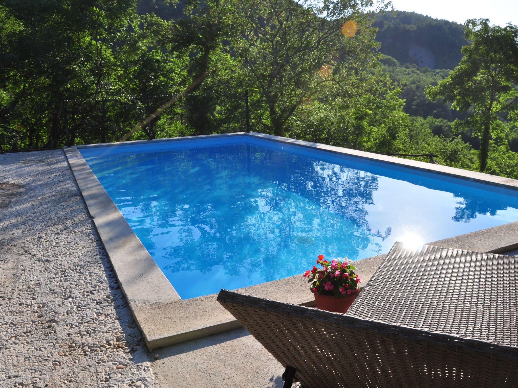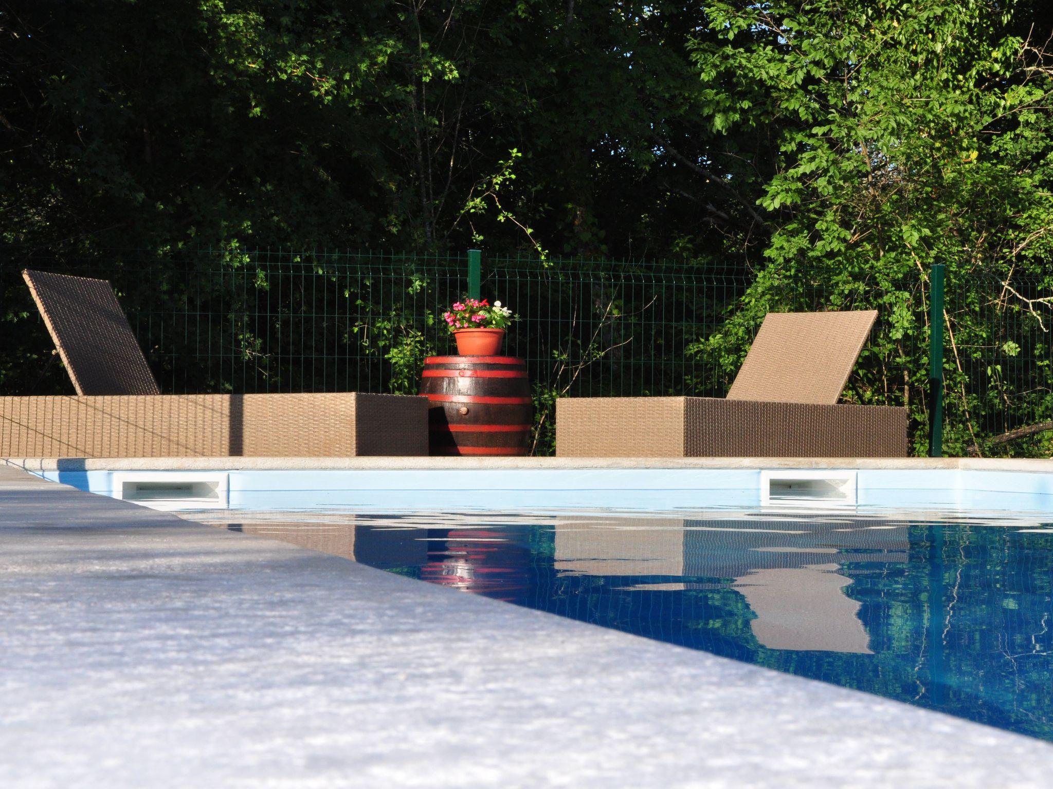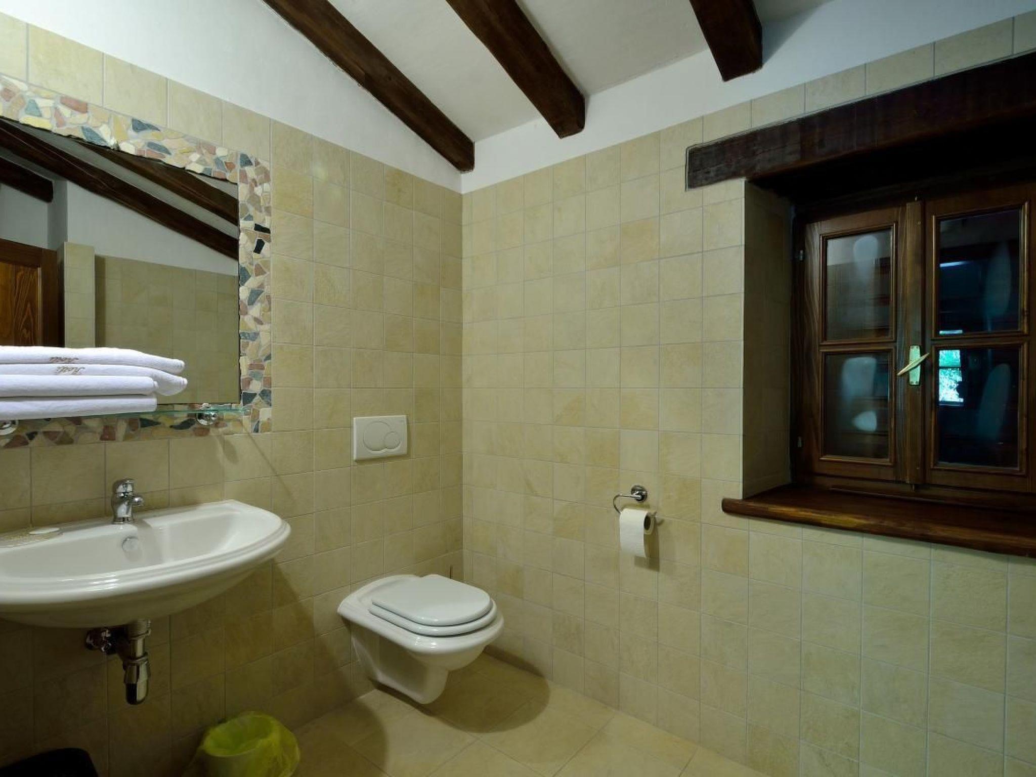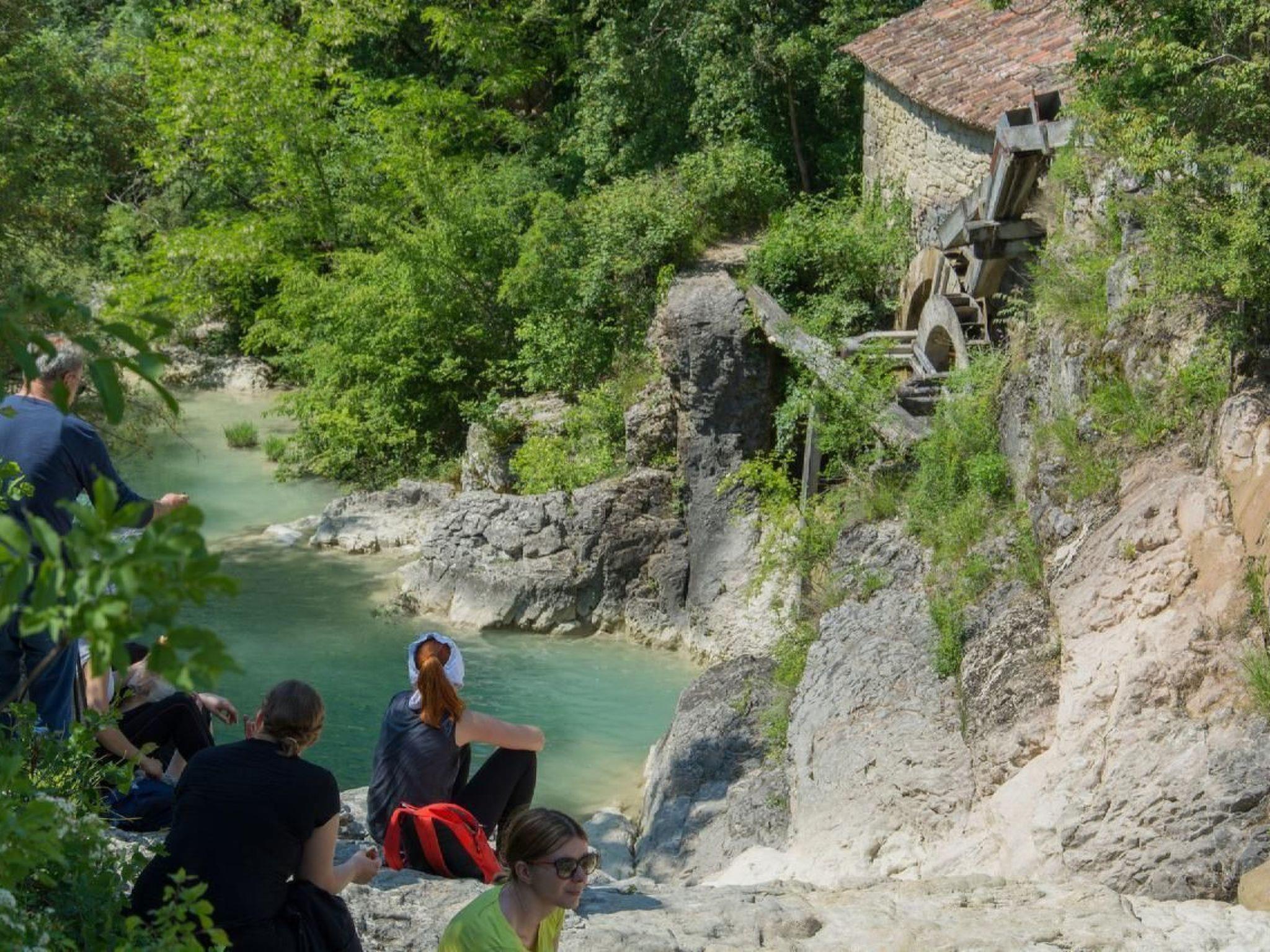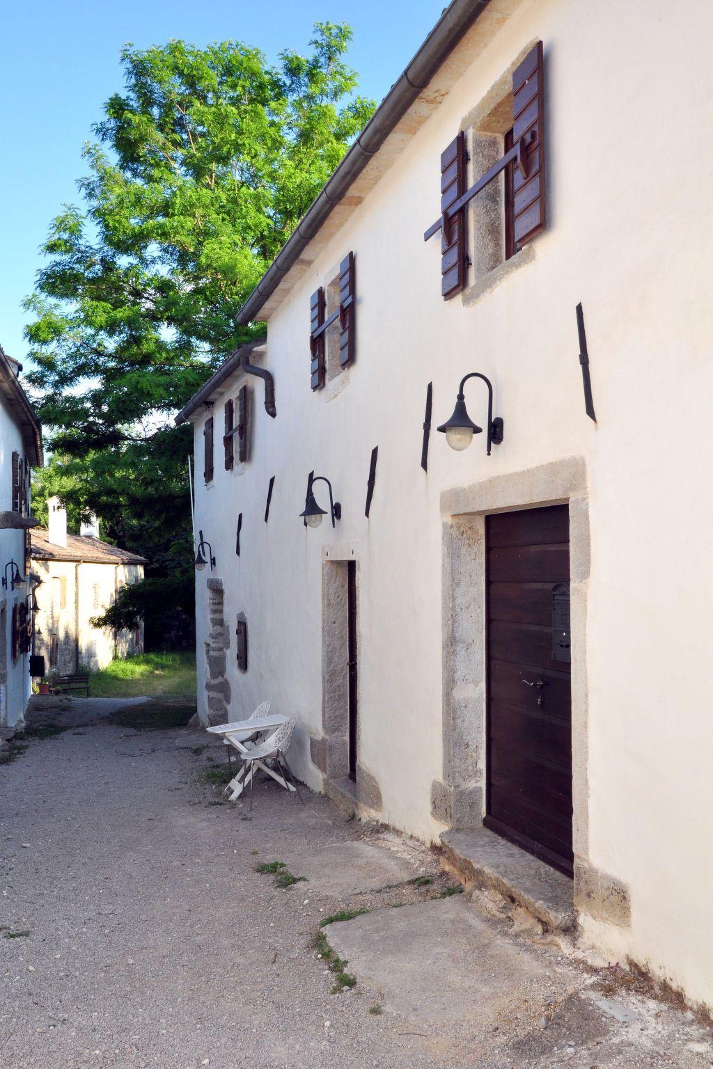 Stepping outside, you're greeted with well-preserved courtyards, outer staircases, arched passages, and picturesque chimneys that evoke a sense of time standing still. The garden is adorned with furniture, a grill for those delightful BBQ sessions, and playground equipment for younger guests. Amongst these outdoor features, you'll also find a splendid swimming pool shared for communal use, promising refreshing dips under the open sky. The River Mirna's gentle flow and the scenic waterfalls create a tranquil backdrop for relaxation and leisure.