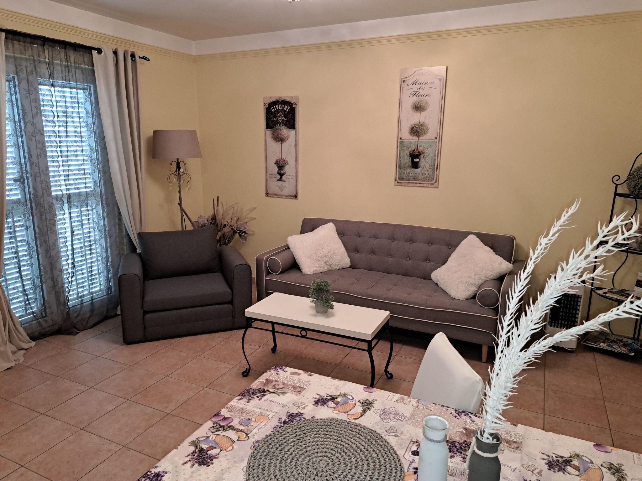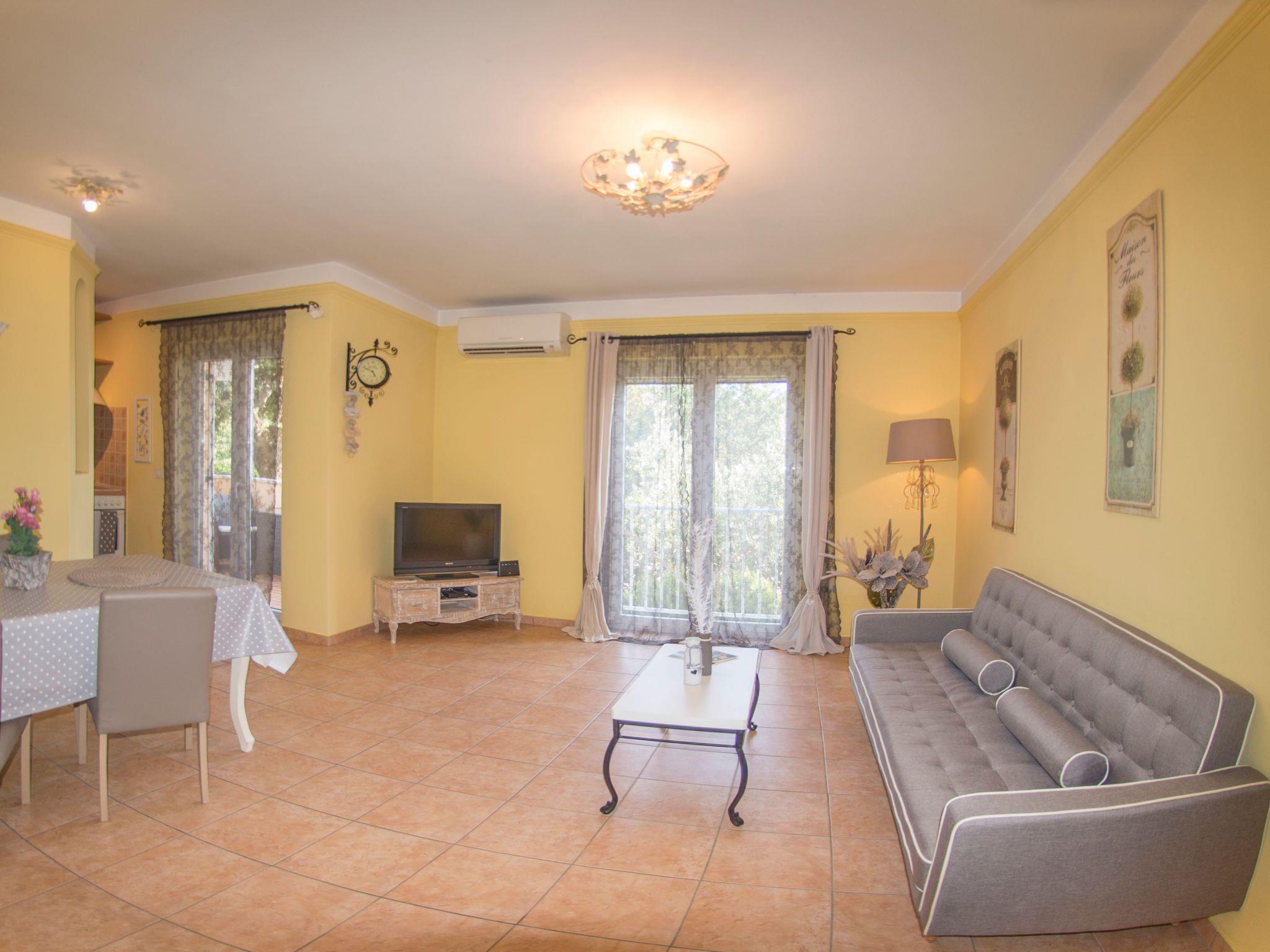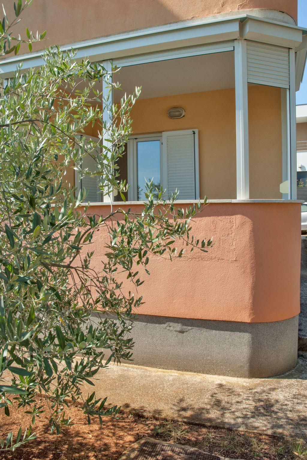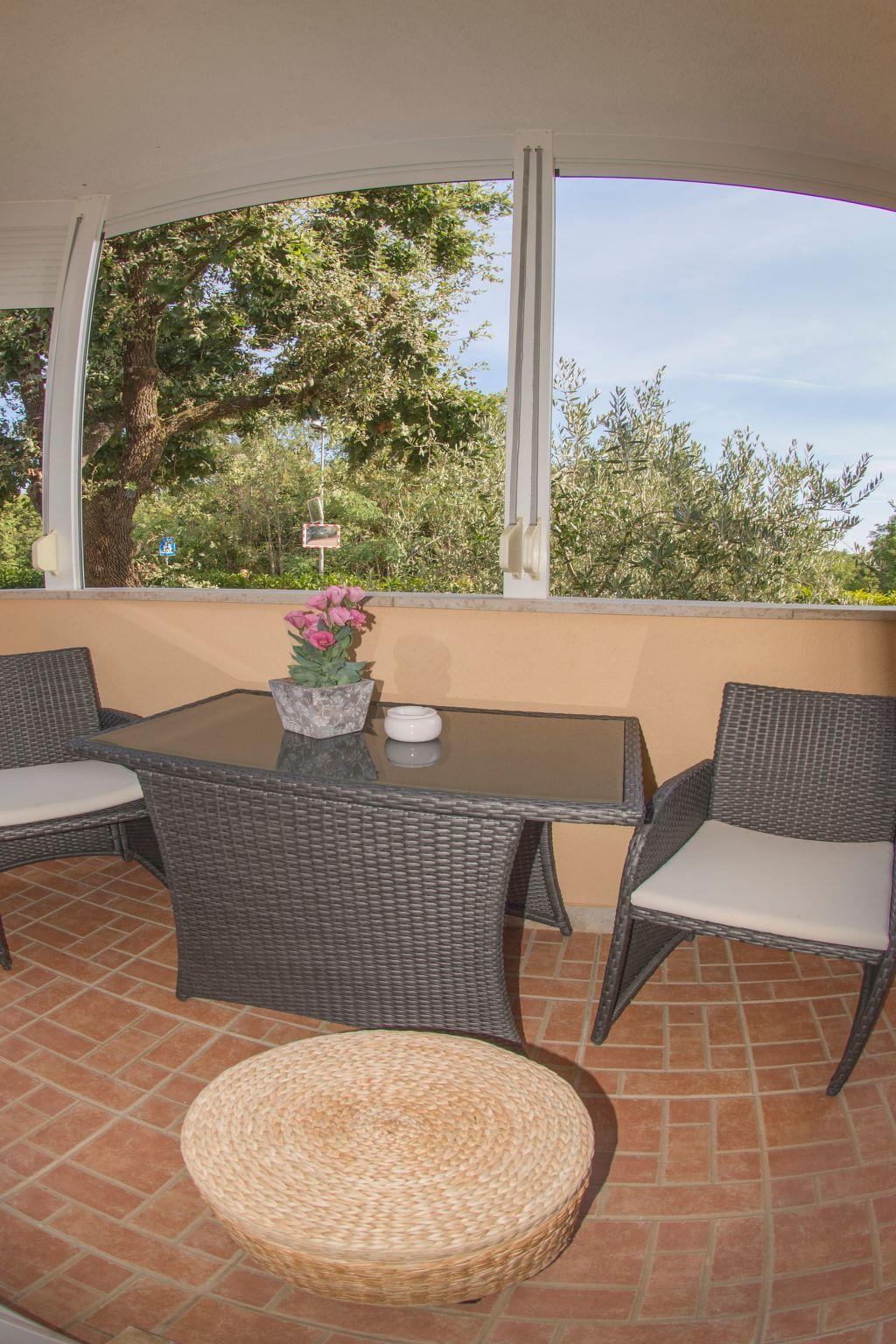 Surrounded by olive trees, garden and parking adjacent to the balcony.
