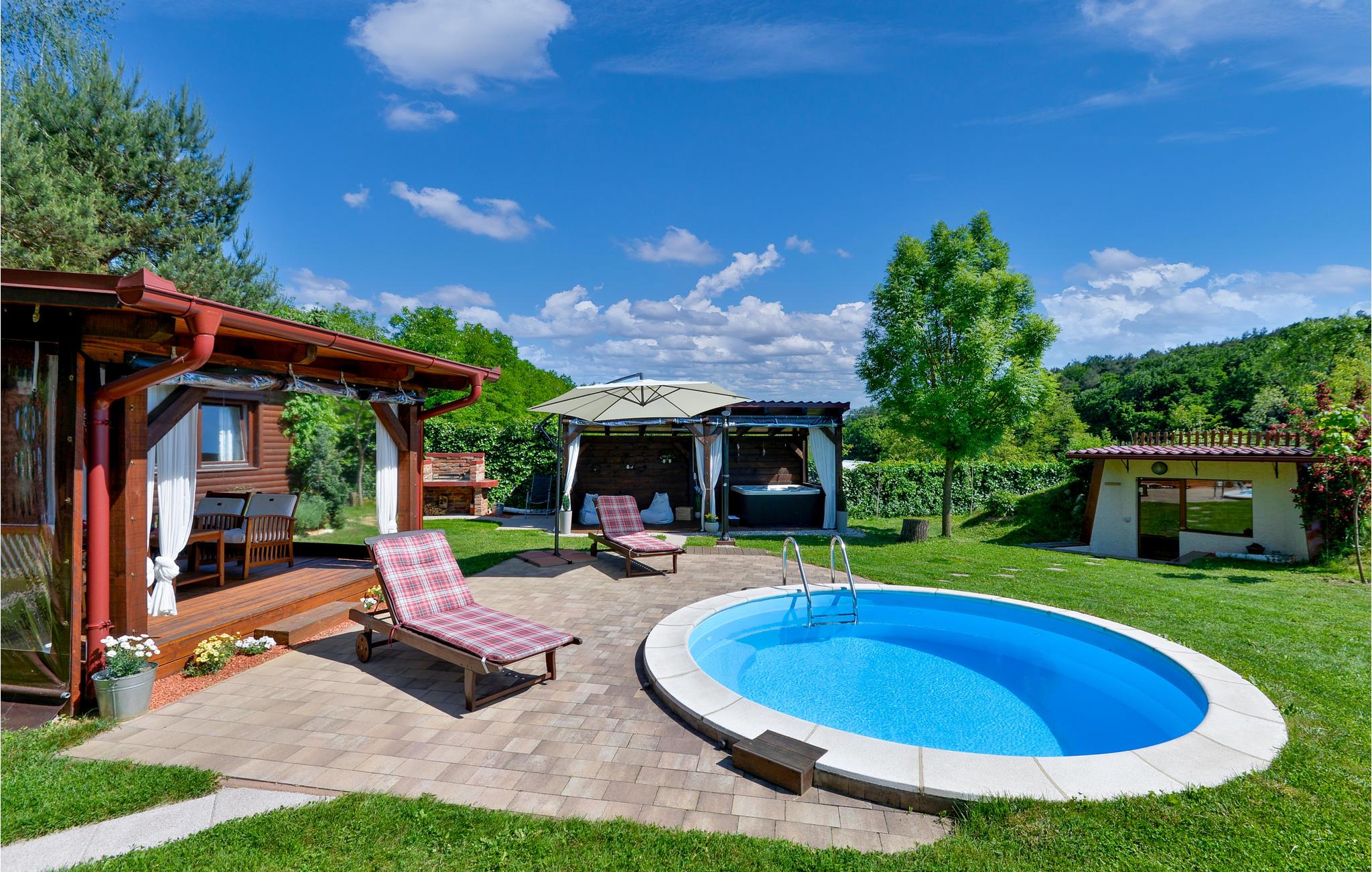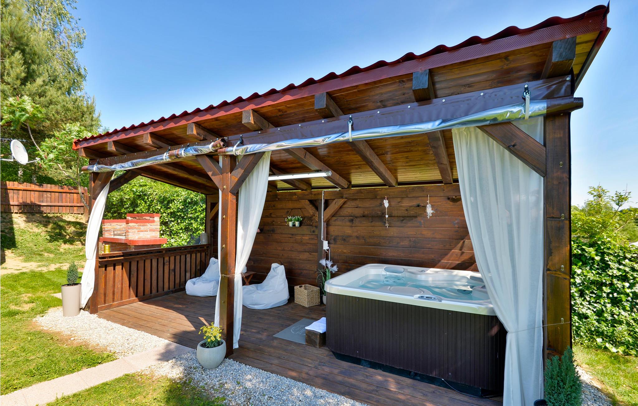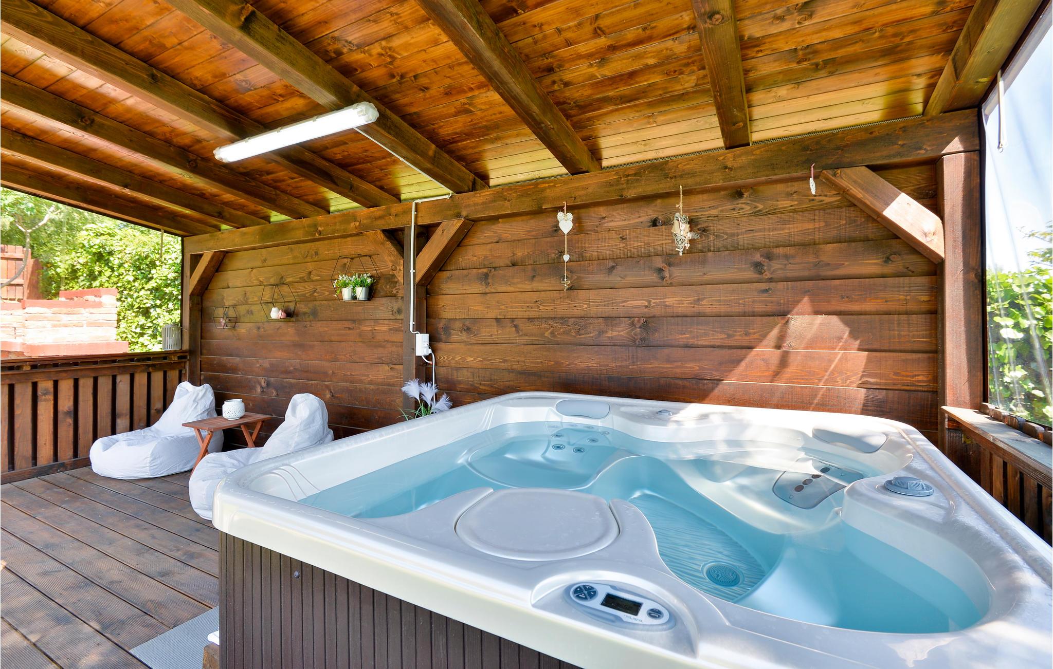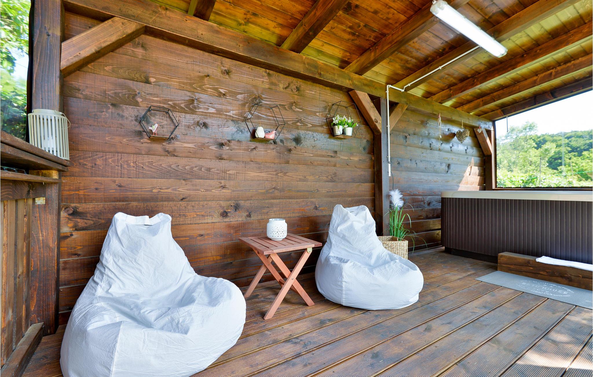 På træterrassen med baldakin kan I slappe helt af efter aftensmaden - det kan i følge op med en dejligt afkølende tur i poolen med massagedyser. På grunden er der en lille hytte, hvor I mod gebyr, men med rabat fra udlejeren, kan bruge en finsk sauna med saunapool, et varmt bad, et saltrum mm..