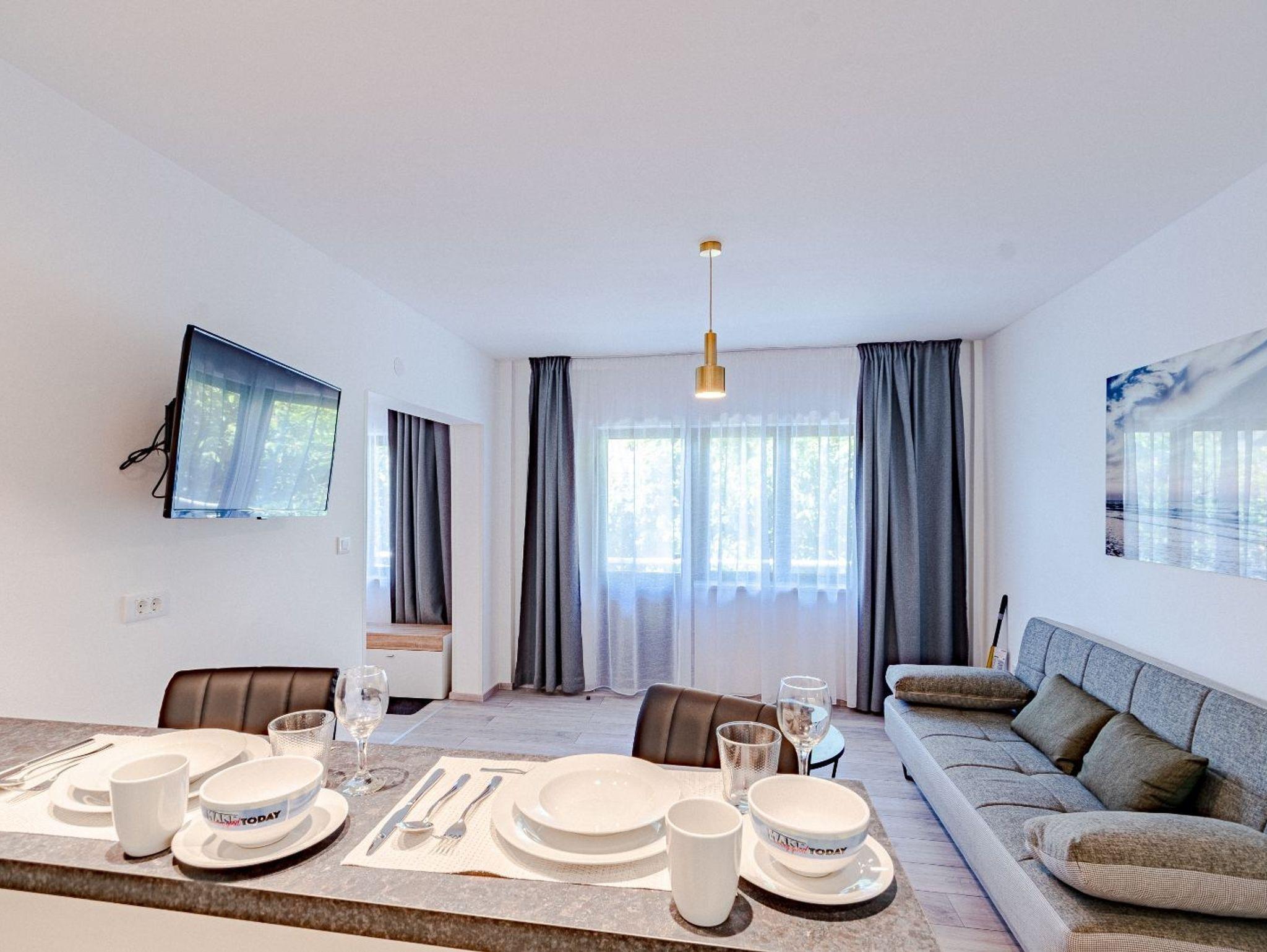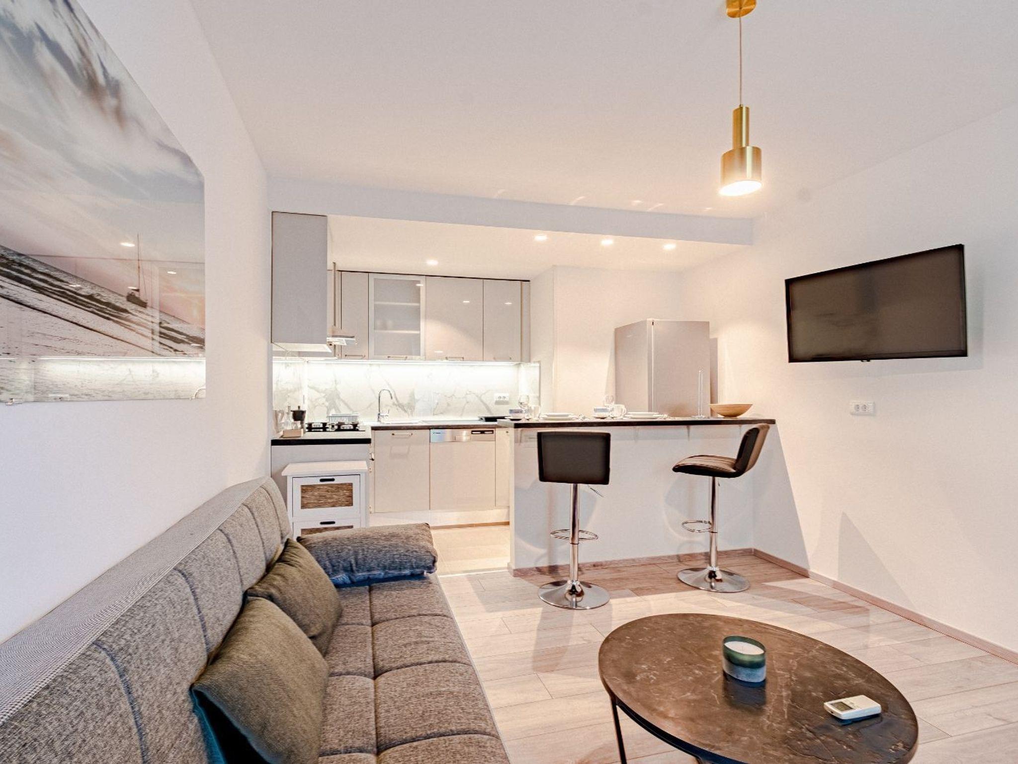 Studio bietet Platz für 2 Gäste. Die Betten sind in Schlafzimmern, die es 1 gibt, innerhalb einer Gesamtfläche von 30m2, angeordnet. Die Gäste haben eine eigene Terrasse zur Verfügung, auf der sie in warmen Sommernächten genießen können. Das Studio-Apartment bietet Meerblick. Es ist erlaubt, Speisen auf dem Gemeinschafts-Grill vorzubereiten. IM PREIS INBEGRIFFEN: Kurtaxe, Endreinigung, Klimatisierung, Parkplatz, Internet. VERBINDLICHE ZUSÄTZLICHE KOSTEN: Aufzahlung für Kurzaufenthalte (prozentualer Zuschlag pro Nächtigungsanzahl: 30% - 1, 20% - 2, 10% - 3). Die Verfügbarkeit zusätzlicher Dienstleistungen in Ihrem reservierten Termin und die Preise derselben (falls nicht aufgeführt) müssen im Voraus überprüft werden. Zusätzliche Dienstleistungen die in der Zahlungsaufforderung nicht aufgeführt sind werden direkt beim Vermieter bezahlt, angenommen der Gast nutzt auch diese. Ermäßigung auf den Grundpreis: Gratistag 14=13 (bei einem Aufenthalt von 14 Tagen oder mehr erhalten Sie einen Gratistag für den Aufenthalt bis 31.12.26).