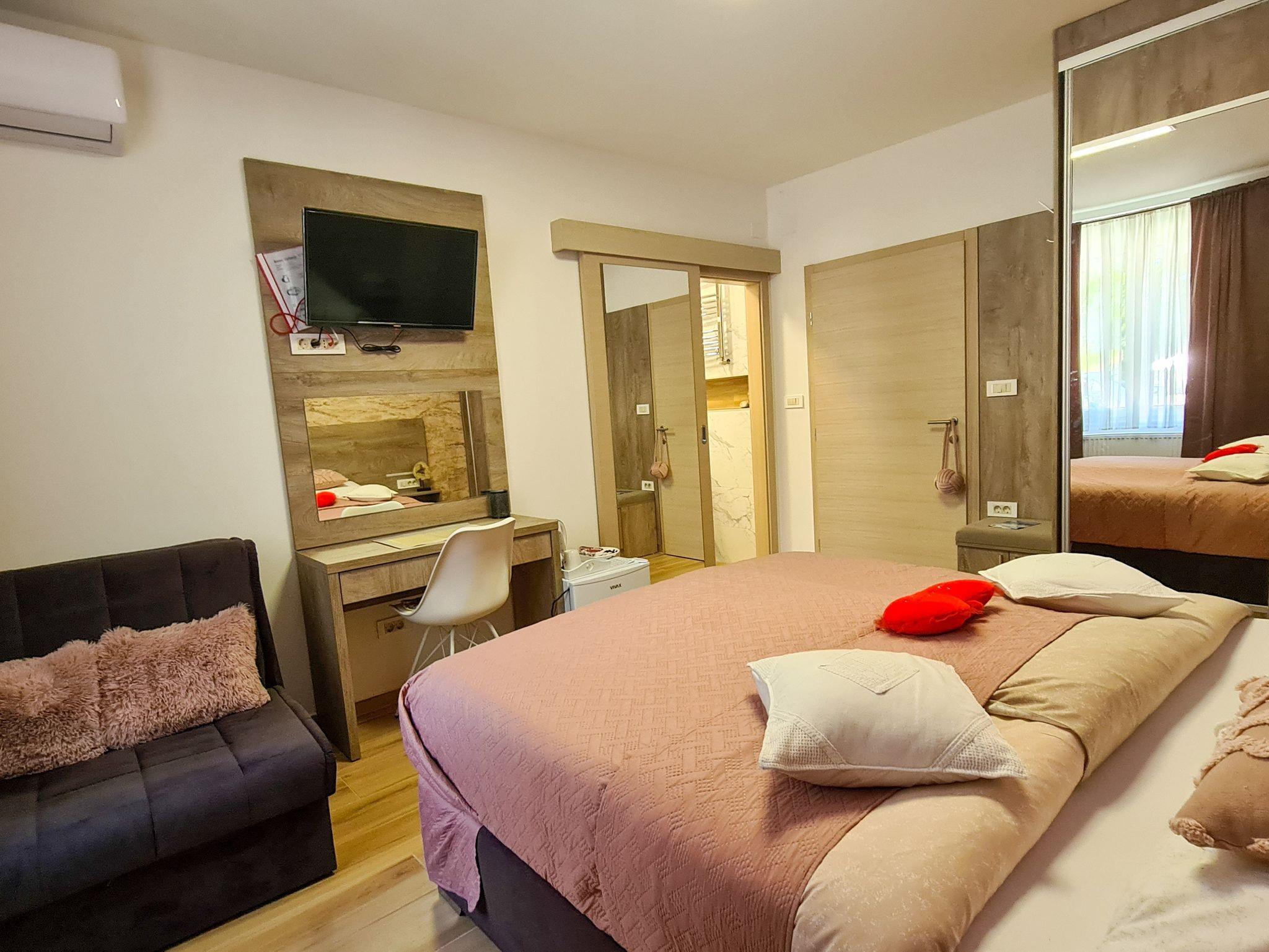 Zimmer bietet Platz für 3 Gäste. Die Betten sind in Schlafzimmern, die es 1 gibt, innerhalb einer Gesamtfläche von 18m2, angeordnet. Die Nutzung einer gemeinsamen Küche ist möglich. Die reservierte Unterkunftseinheit hat keinen Balkon und keine Terrasse. Die reservierte Unterkunftseinheit ist ein Zimmer mit eigenem Badezimmer mit der Möglichkeit der Nutzung einer Küche gegen Zuzahlung (der Preis ist auf der Seite definiert). IM PREIS INBEGRIFFEN: Kurtaxe, Endreinigung, Klimatisierung, Zentralheizung, Parkplatz, Internet, Föhn. VERBINDLICHE ZUSÄTZLICHE KOSTEN: Aufzahlung für Kurzaufenthalte (prozentualer Zuschlag pro Nächtigungsanzahl: 30% - 1, 20% - 2, 10% - 3). UNVERBINDLICHE ZUSÄTZLICHE KOSTEN: gemeinsame Küche (10,00 € pro Nacht), Wäschewaschen (5,00 € Waschen). Die Verfügbarkeit zusätzlicher Dienstleistungen in Ihrem reservierten Termin und die Preise derselben (falls nicht aufgeführt) müssen im Voraus überprüft werden. Zusätzliche Dienstleistungen die in der Zahlungsaufforderung nicht aufgeführt sind werden direkt beim Vermieter bezahlt, angenommen der Gast nutzt auch diese. Ermäßigung auf den Grundpreis: Gratistag 28=25 (bei einem Aufenthalt von 28 oder mehr Tagen erhalten Sie 3 kostenlose Tage für den Aufenthalt bis 31.12.26).