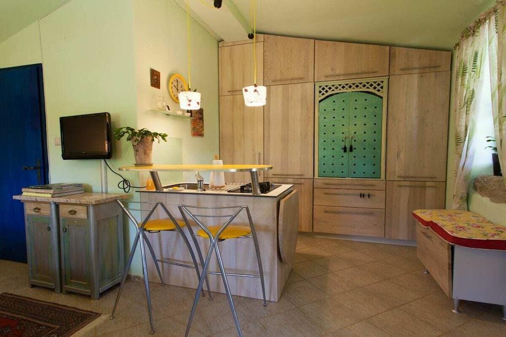 Et lille hus med swimmingpool i en stor, anlagt og indhegnet have på 3000 m2. Ideel indkvartering for et par, der ønsker at nyde deres ferie i smukke omgivelser fyldt med blomster, grønne områder og urter. Den mindre pool, der ligger lige ved siden af huset, er perfekt til en sommerforfriskning. Aircondition, Wi-Fi, en overdækket terrasse og flere andre mindre terrasser omkring huset, hvor du kan nippe til din morgenkaffe eller tilbringe aftenen med et glas vin... vidunderligt. Haven er velholdt, anlagt og vandet, hvilket gør den smuk hele sommeren. De nærmeste strande og restauranter i Malinska ligger kun få minutters kørsel væk. Parkering er lige ved siden af huset og er gratis.