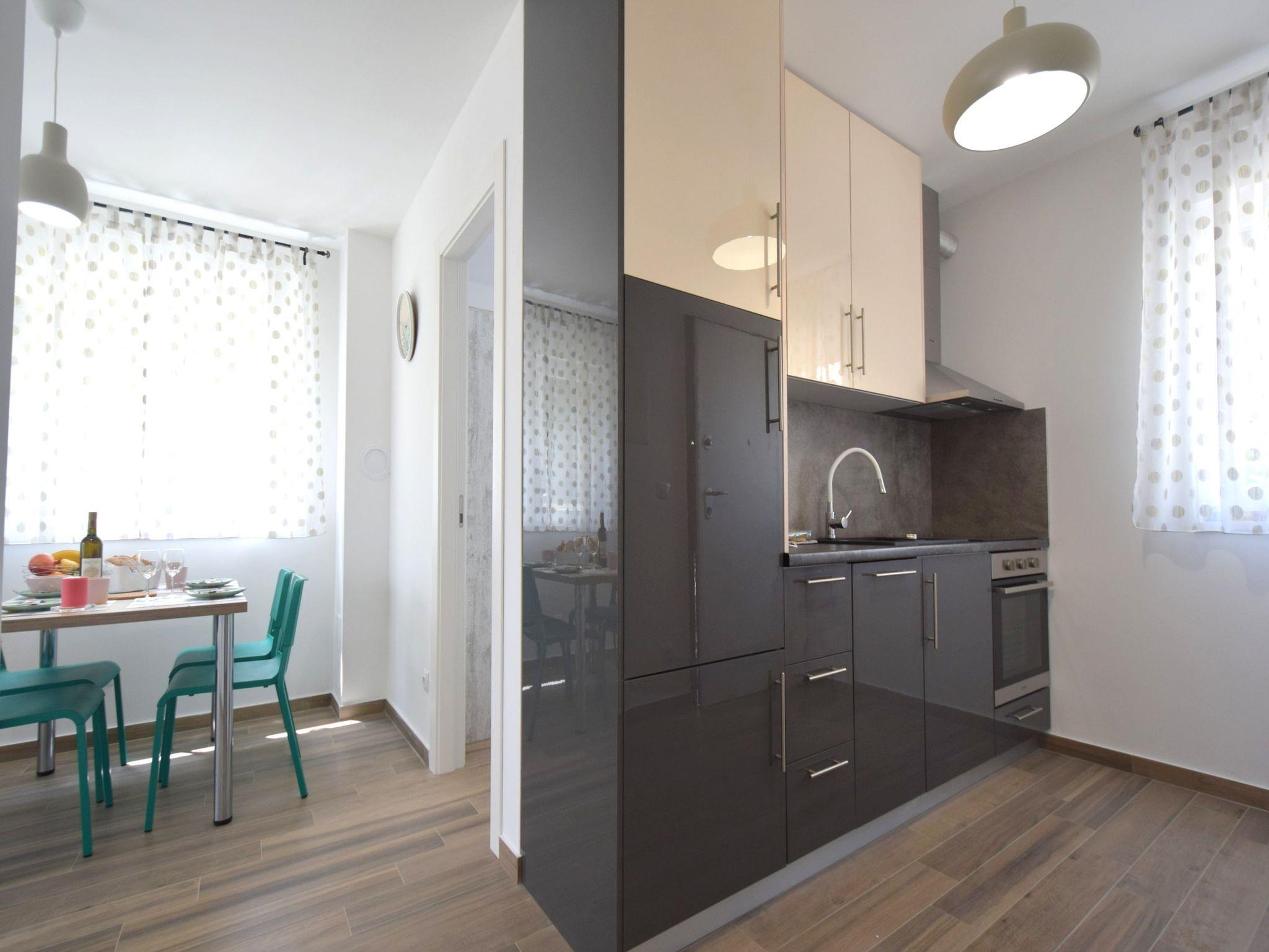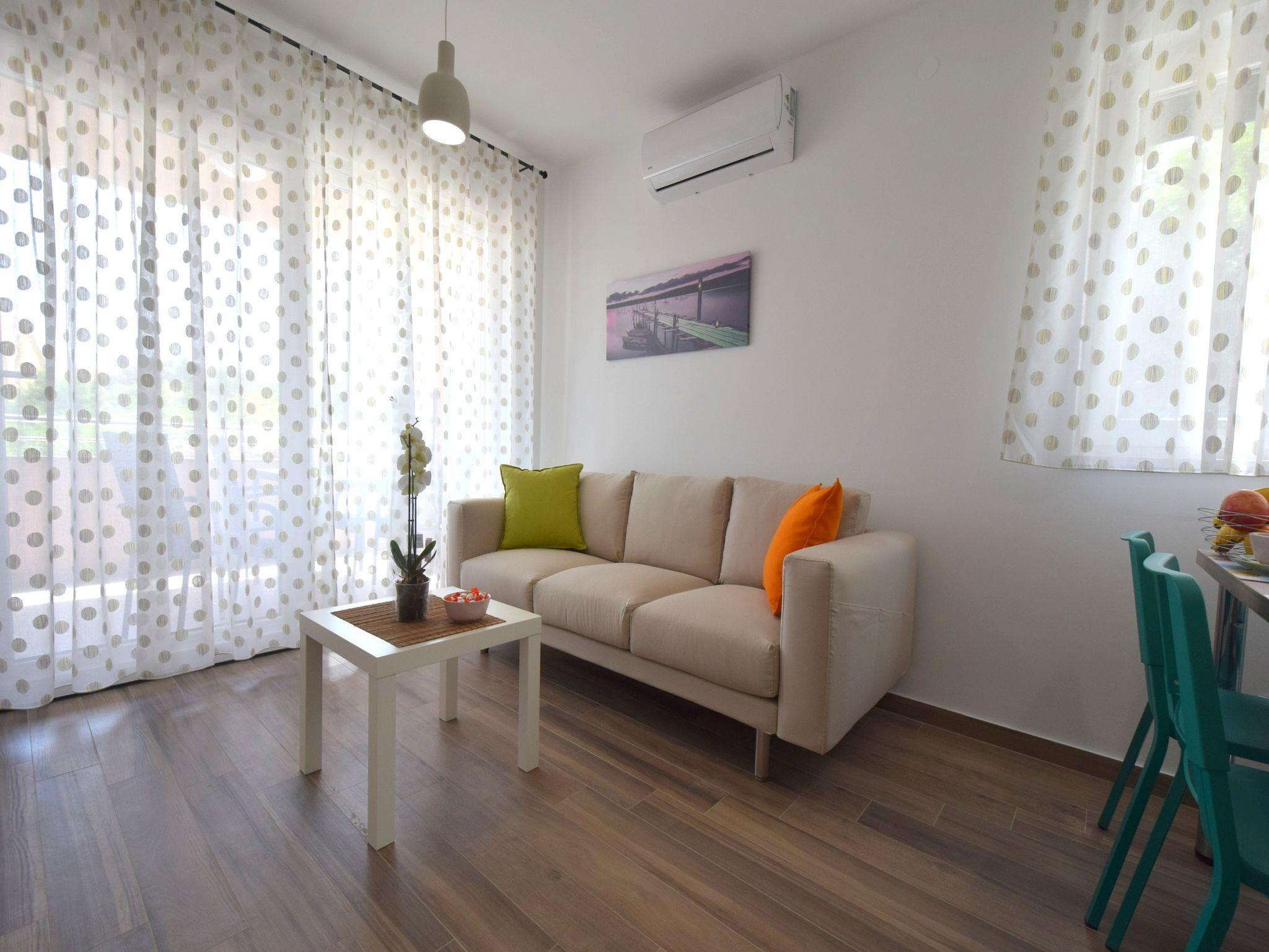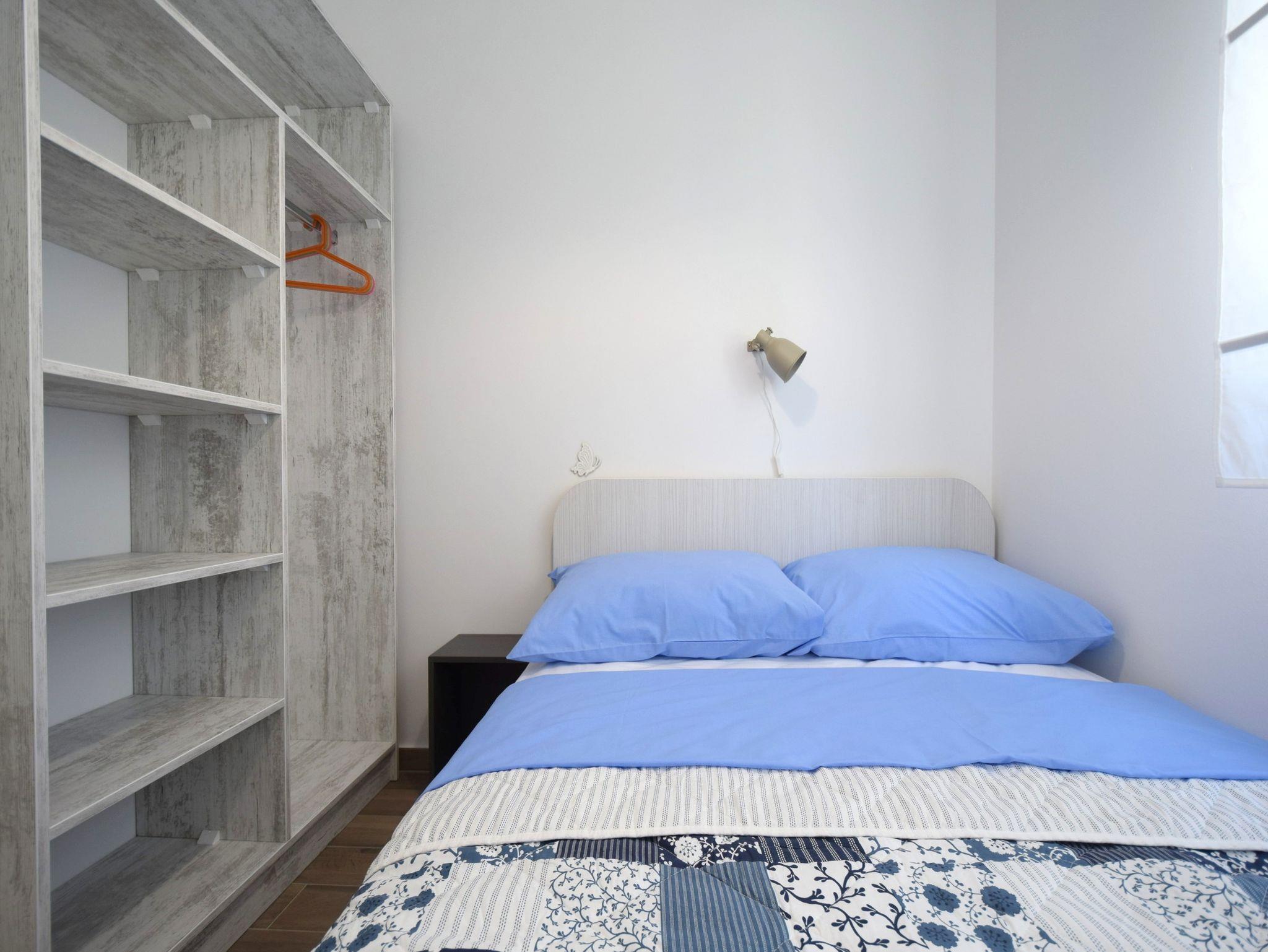 Ferienwohnung bietet Platz für 4 Gäste. Die Betten sind in Schlafzimmern, die es 2 gibt, innerhalb einer Gesamtfläche von 46m2, angeordnet. Die Gäste haben eine eigene Terrasse zur Verfügung, auf der sie in warmen Sommernächten genießen können. Es ist erlaubt, Speisen auf dem Gemeinschafts-Grill vorzubereiten. IM PREIS INBEGRIFFEN: Kurtaxe, Endreinigung, Klimatisierung, Parkplatz, Internet. VERBINDLICHE ZUSÄTZLICHE KOSTEN: Aufzahlung für Kurzaufenthalte (prozentualer Zuschlag pro Nächtigungsanzahl: 30% - 1, 20% - 2, 10% - 3). Die Verfügbarkeit zusätzlicher Dienstleistungen in Ihrem reservierten Termin und die Preise derselben (falls nicht aufgeführt) müssen im Voraus überprüft werden. Zusätzliche Dienstleistungen die in der Zahlungsaufforderung nicht aufgeführt sind werden direkt beim Vermieter bezahlt, angenommen der Gast nutzt auch diese.