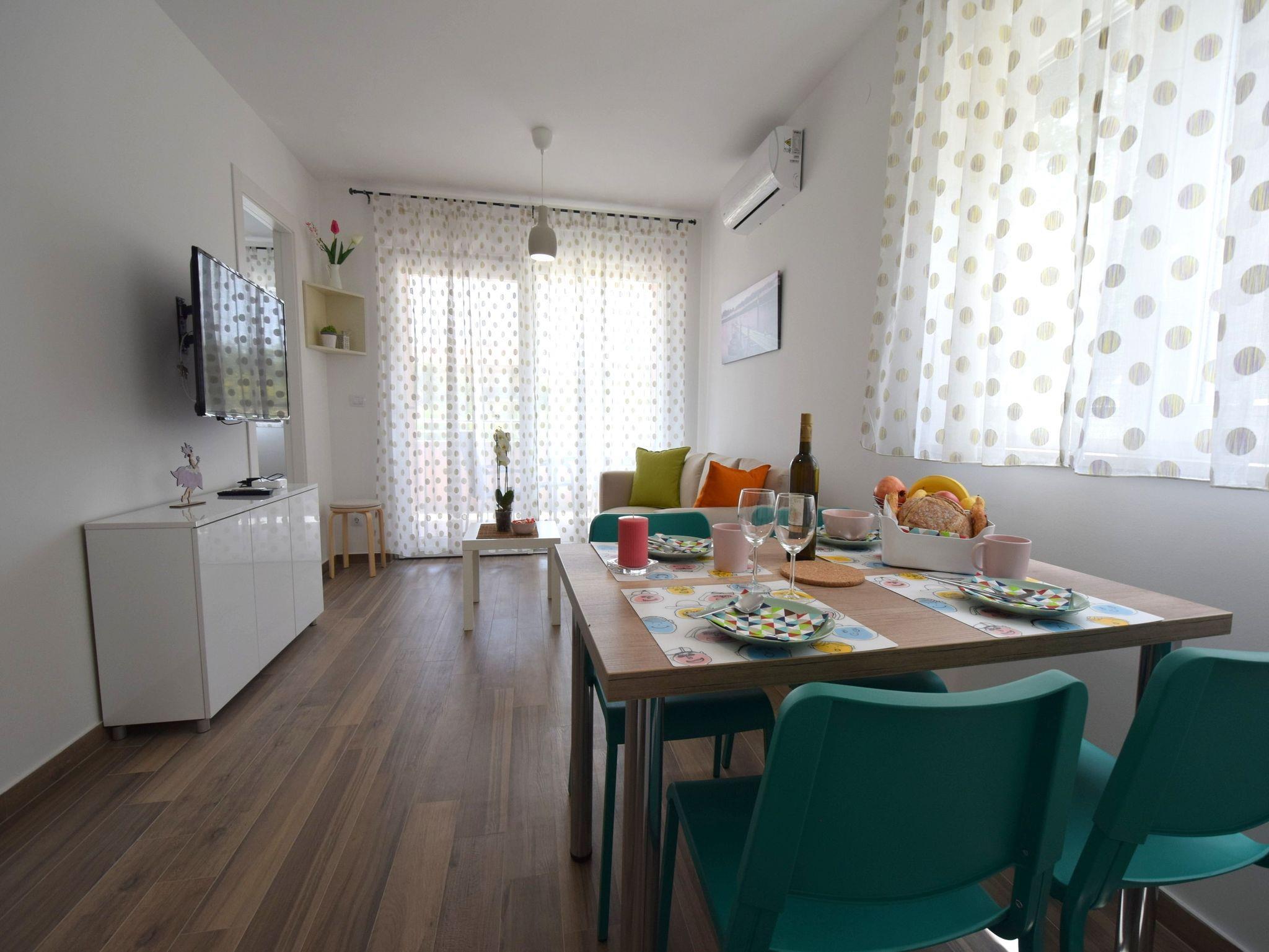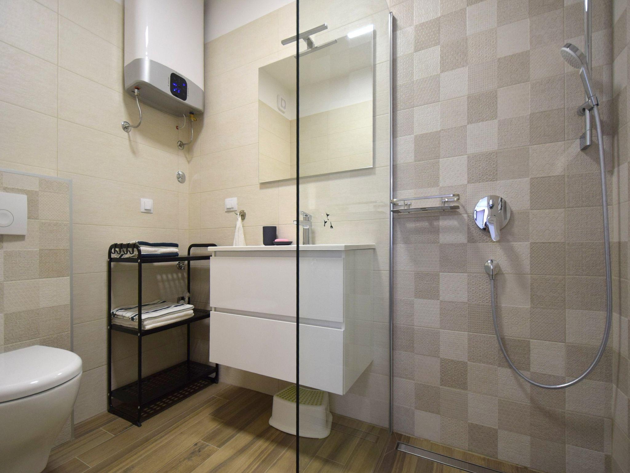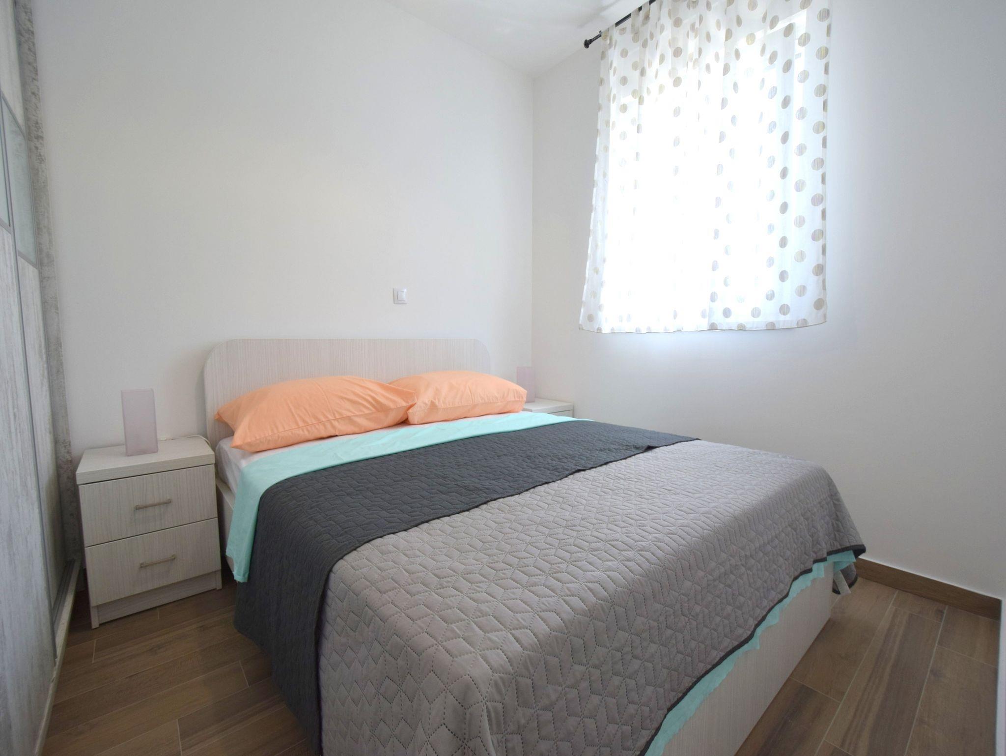 Ferienwohnung bietet Platz für 4 Gäste. Die Betten sind in Schlafzimmern, die es 2 gibt, innerhalb einer Gesamtfläche von 46m2, angeordnet. Die Gäste haben eine eigene Terrasse zur Verfügung, auf der sie in warmen Sommernächten genießen können. Es ist erlaubt, Speisen auf dem Gemeinschafts-Grill vorzubereiten. IM PREIS INBEGRIFFEN: Kurtaxe, Endreinigung, Klimatisierung, Parkplatz, Internet. VERBINDLICHE ZUSÄTZLICHE KOSTEN: Aufzahlung für Kurzaufenthalte (prozentualer Zuschlag pro Nächtigungsanzahl: 30% - 1, 20% - 2, 10% - 3). Die Verfügbarkeit zusätzlicher Dienstleistungen in Ihrem reservierten Termin und die Preise derselben (falls nicht aufgeführt) müssen im Voraus überprüft werden. Zusätzliche Dienstleistungen die in der Zahlungsaufforderung nicht aufgeführt sind werden direkt beim Vermieter bezahlt, angenommen der Gast nutzt auch diese.