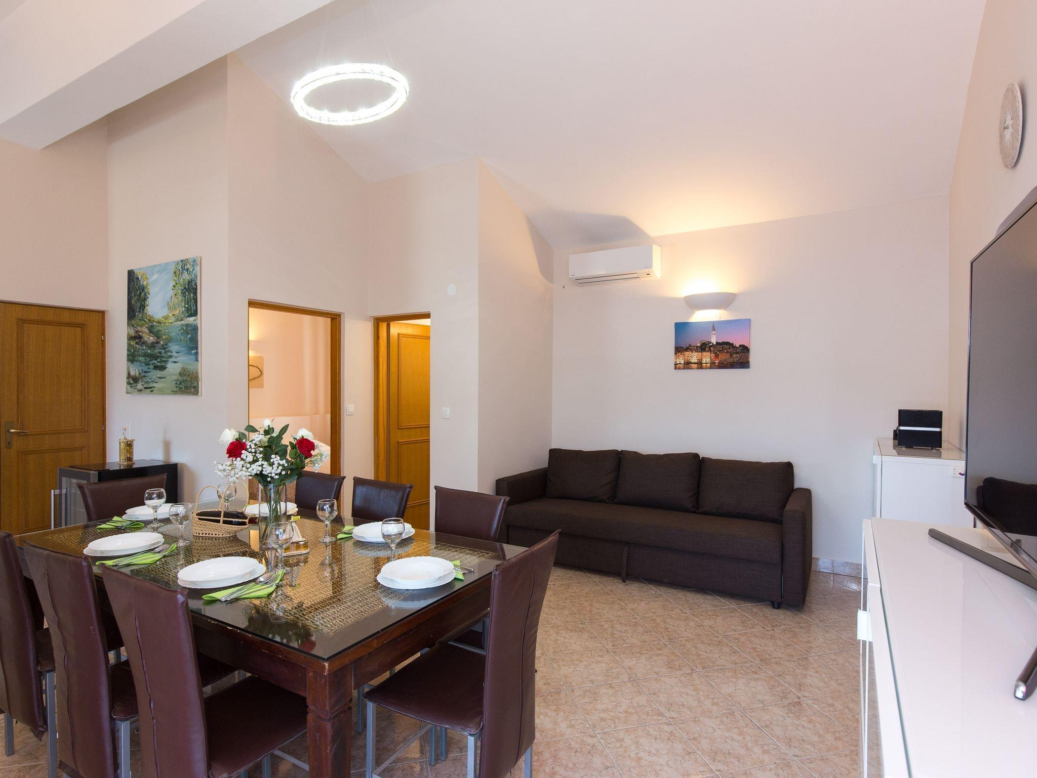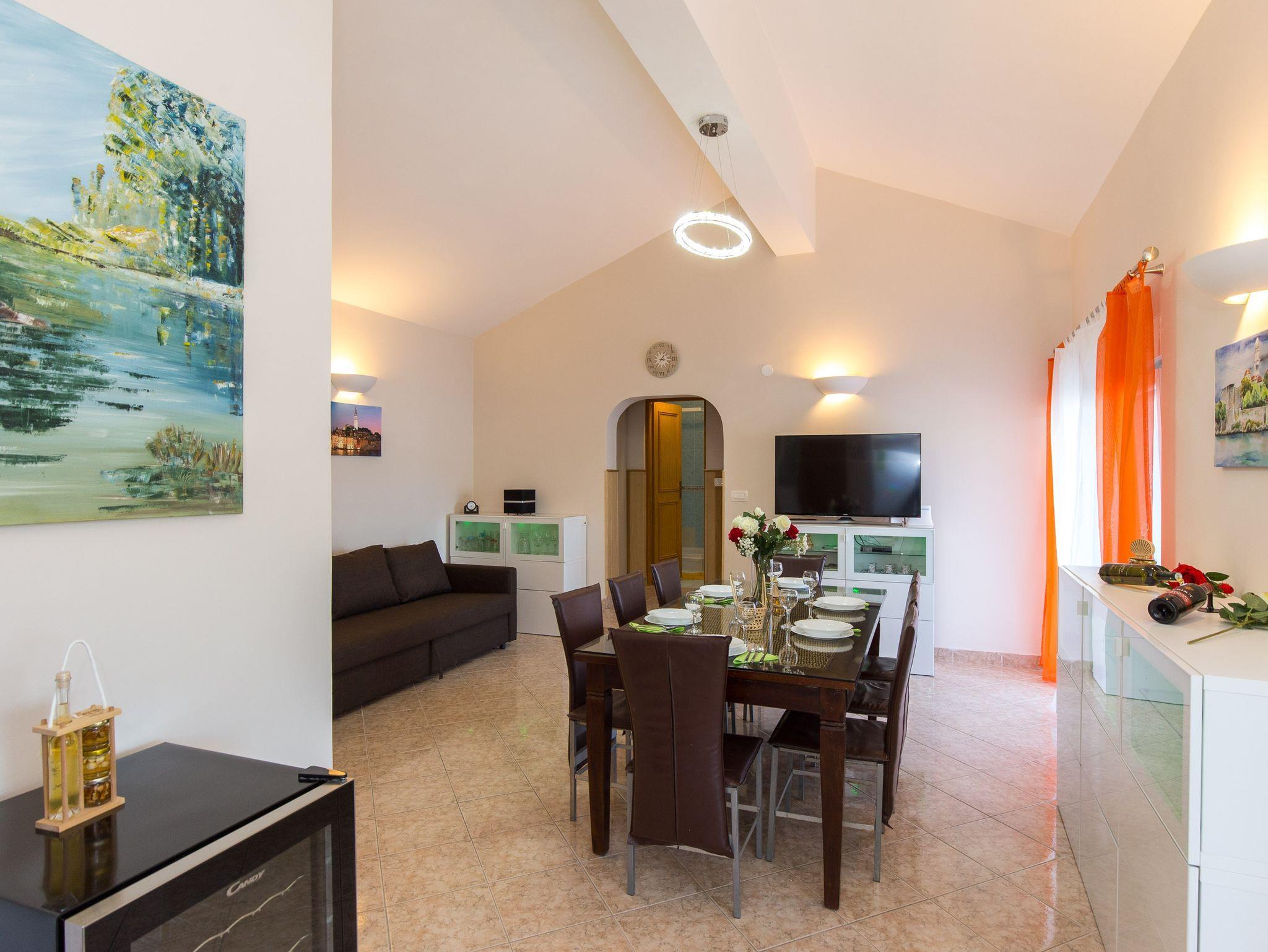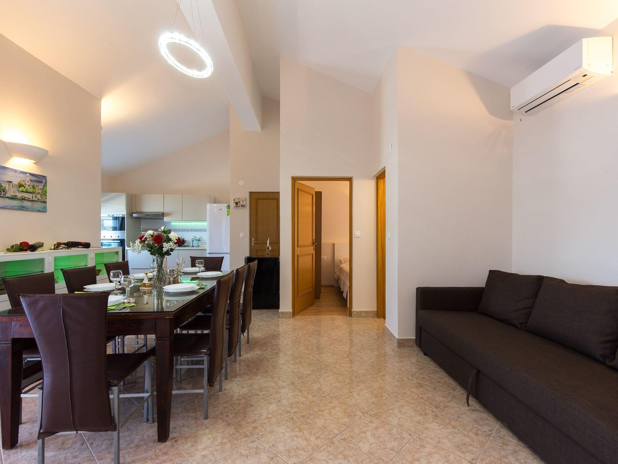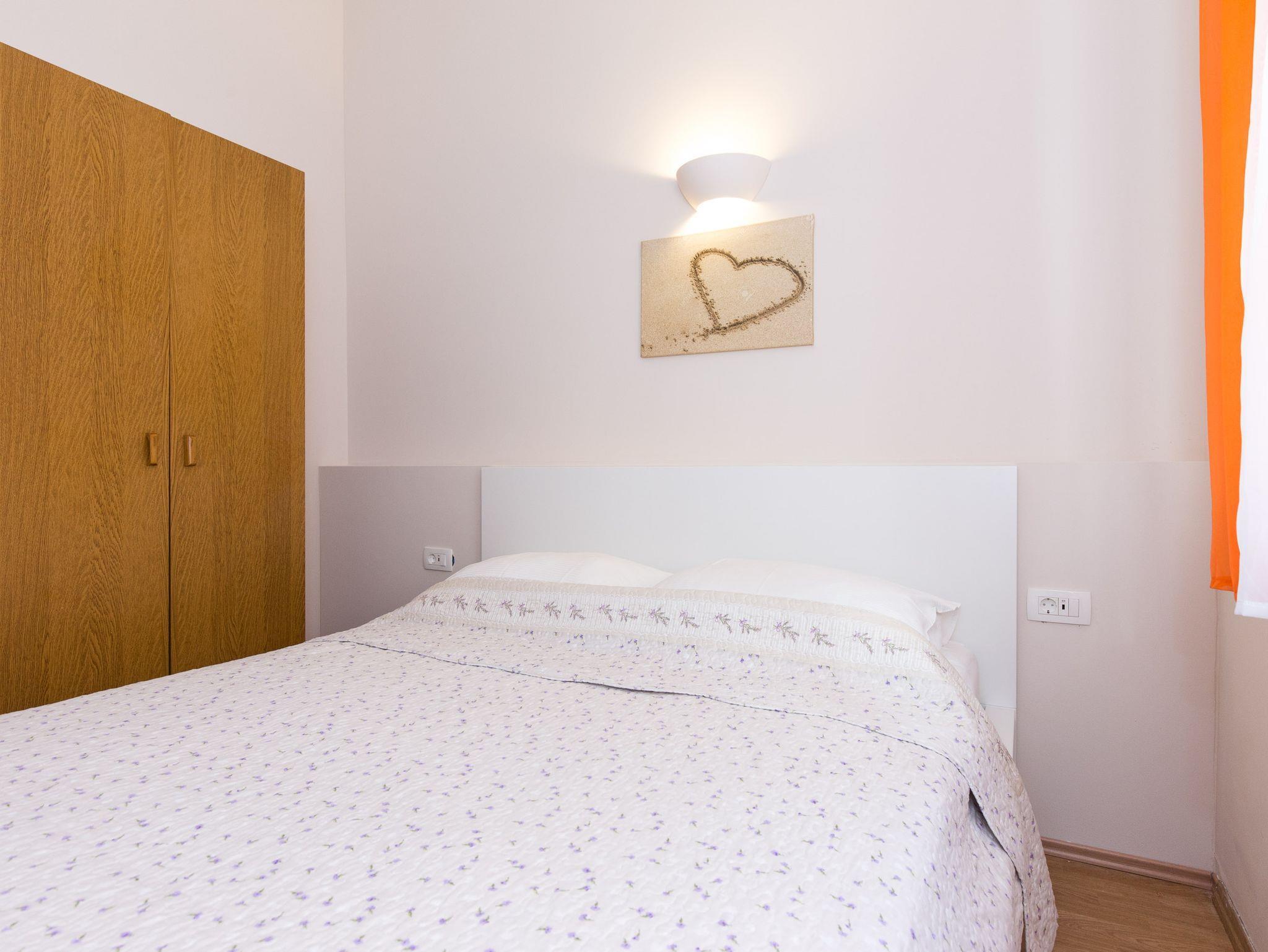 Ferienwohnung bietet Platz für 5 Gäste. Die Betten sind in Schlafzimmern, die es 2 gibt, und in Wohnzimmer, innerhalb einer Gesamtfläche von 53m2, angeordnet. Die Gäste haben eine eigene Terrasse zur Verfügung, auf der sie in warmen Sommernächten genießen können. Das Apartment bietet Meerblick. Es ist erlaubt, Speisen auf dem Gemeinschafts-Grill vorzubereiten. In der Unterkunftseinheit besteht die Möglichkeit des Mitbringens von Haustieren gegen Aufpreis. IM PREIS INBEGRIFFEN: Kurtaxe, Endreinigung, Klimatisierung, Parkplatz, Internet. VERBINDLICHE ZUSÄTZLICHE KOSTEN: Aufzahlung für Kurzaufenthalte (prozentualer Zuschlag pro Nächtigungsanzahl: 30% - 1, 20% - 2, 10% - 3). UNVERBINDLICHE ZUSÄTZLICHE KOSTEN: Haustiere (5,00 € pro Nacht). Die Verfügbarkeit zusätzlicher Dienstleistungen in Ihrem reservierten Termin und die Preise derselben (falls nicht aufgeführt) müssen im Voraus überprüft werden. Zusätzliche Dienstleistungen die in der Zahlungsaufforderung nicht aufgeführt sind werden direkt beim Vermieter bezahlt, angenommen der Gast nutzt auch diese.