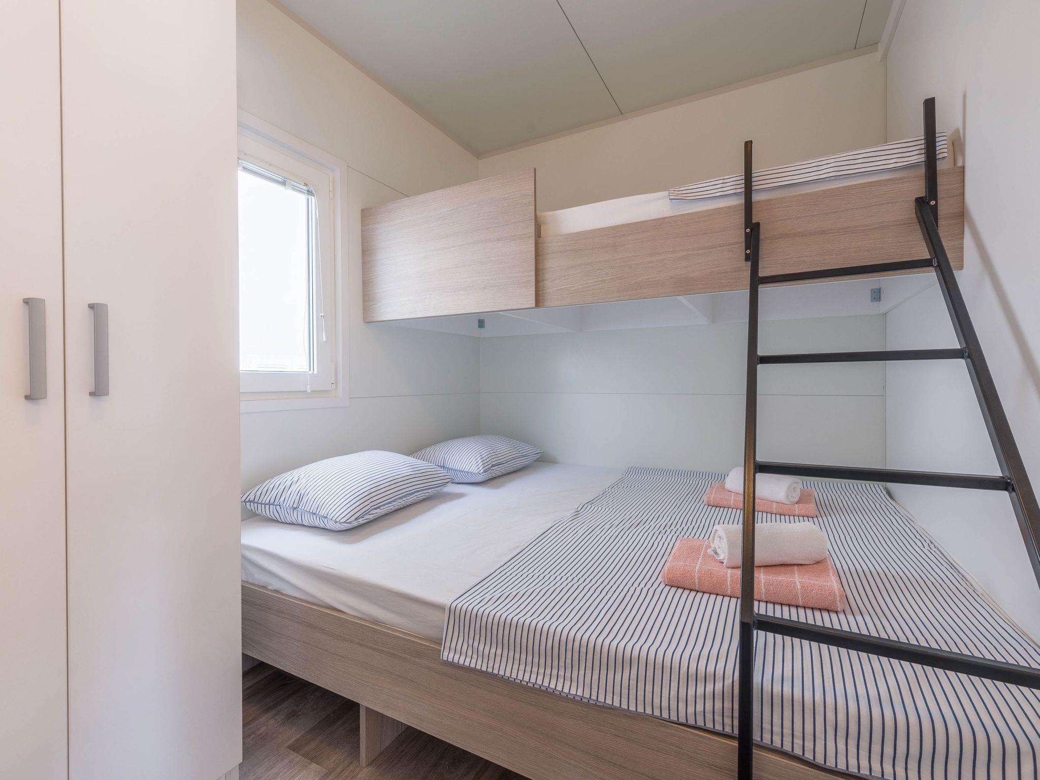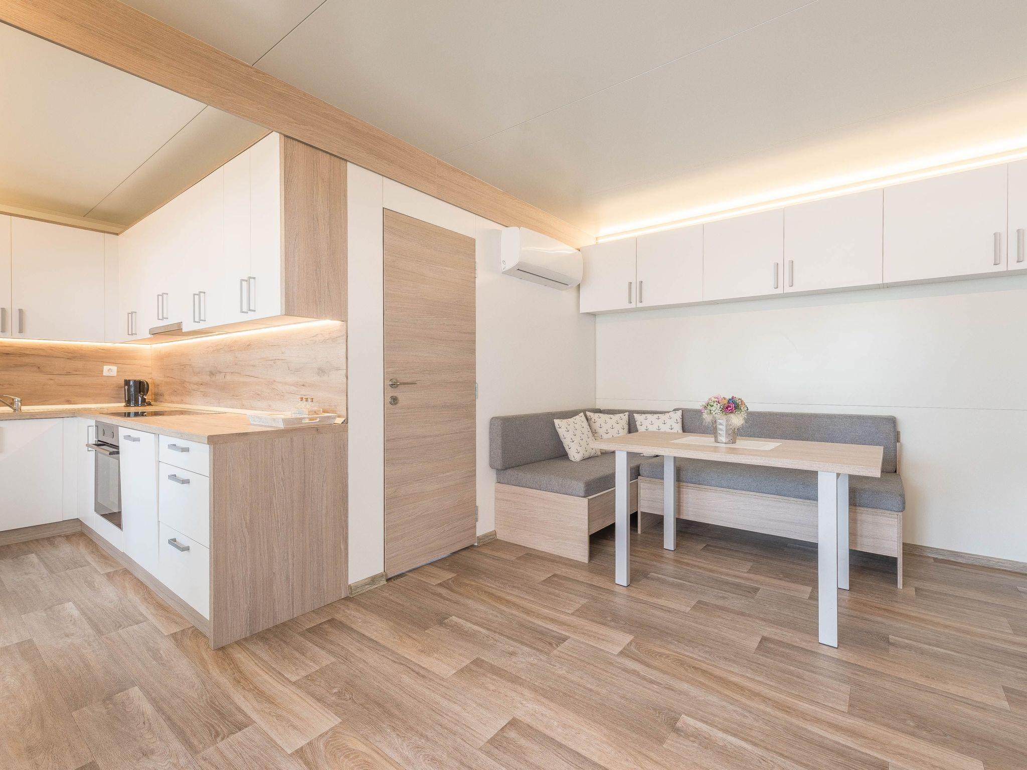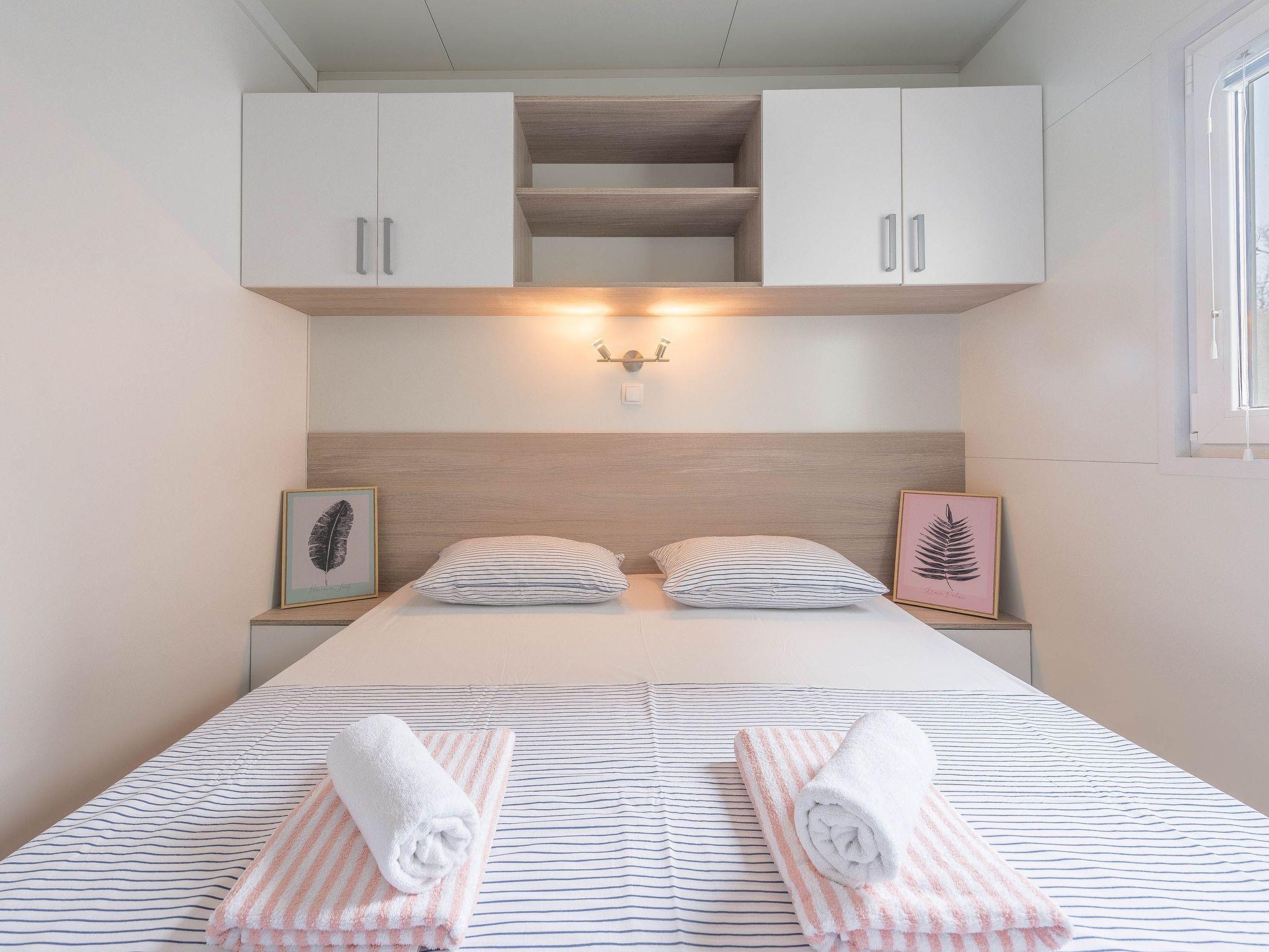 Inside, the mobile home is equipped to cater to all your needs, featuring two bedrooms and a single bathroom with a shower. The living space is enhanced by air conditioning available throughout, guaranteeing a pleasant indoor climate regardless of the outside temperature. Practical amenities such as a washing machine for exclusive use, a 2-plate stove for preparing simple meals, a dishwasher, and an electric kettle, add to the ease of your stay, ensuring you have everything you need at your fingertips.