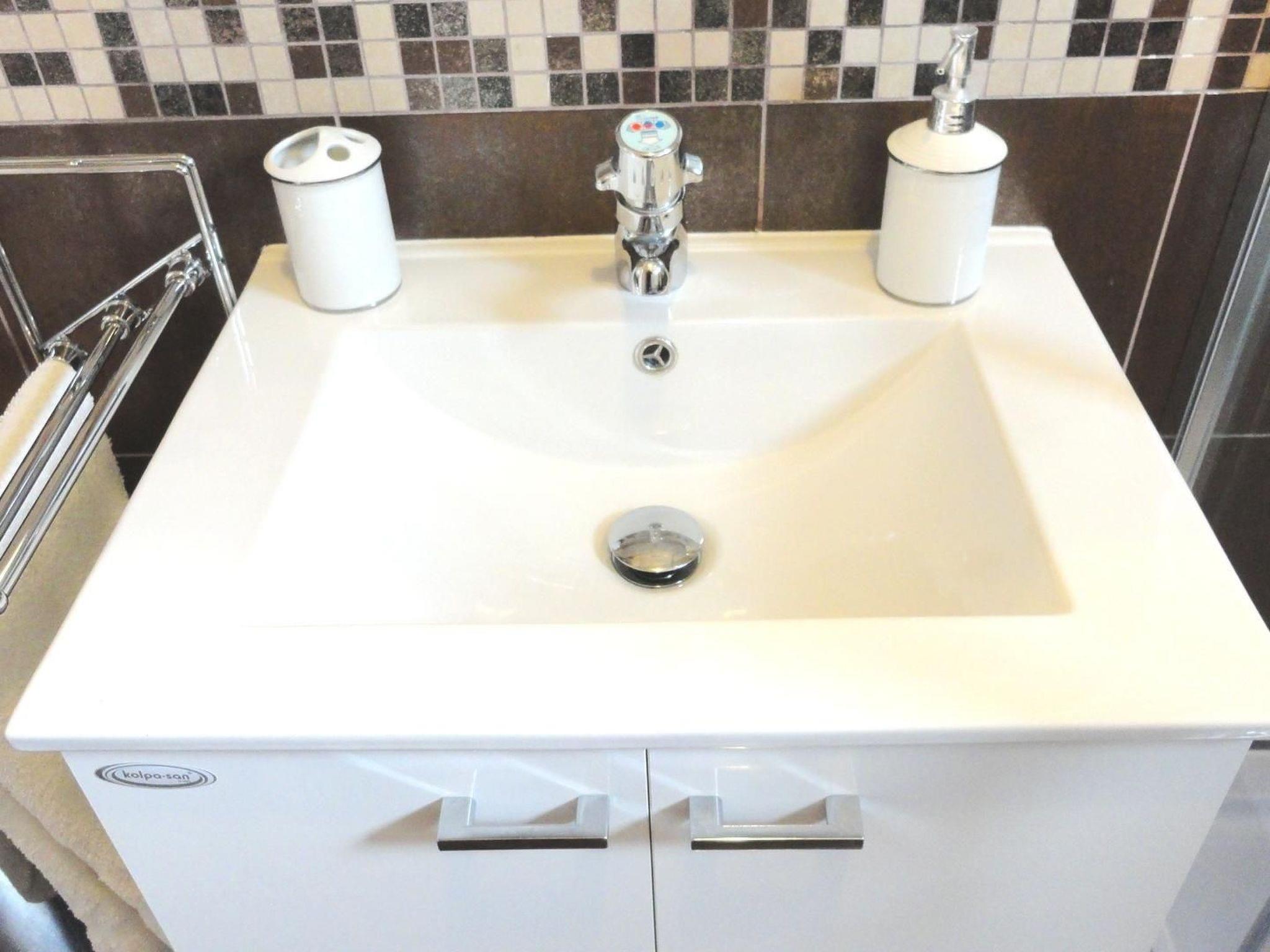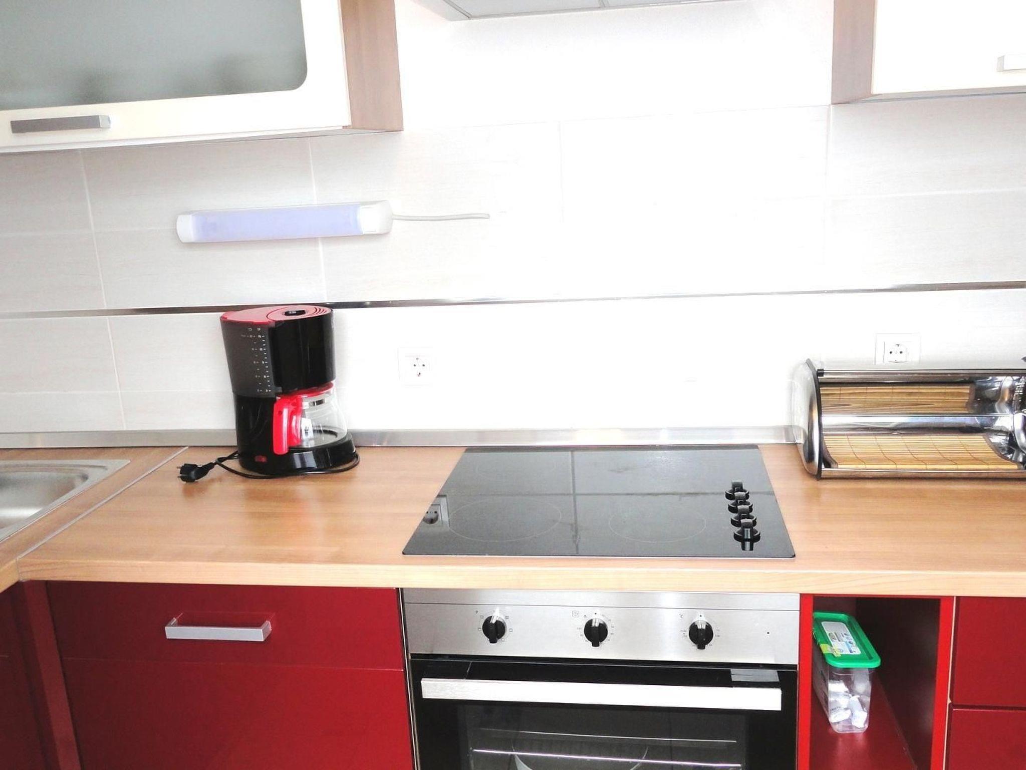 The house has a living space of 105 m², is suitable for a maximum of ten people and consists of two separate flats that are connected by external stairs. Both flats are modern and practically furnished. Each flat has two bedrooms, a kitchen, a living room and a bathroom. In each flat there is one bedroom with a double bed (160 x 200 cm) and one with two single beds (90 x 200 cm). The living rooms each have a sofa bed (150 x 200 cm) for one person. The two modern kitchens have a dining area and are fully equipped with an electric cooker, fridge, extractor fan, freezer (50 litres), coffee machine, kettle, blender, microwave, dishwasher and crockery. Air conditioning, LCD TV and free WLAN are available. The two bathrooms each have a shower. There is a washing machine for the whole house. The air conditioning in each flat is located in the living room.