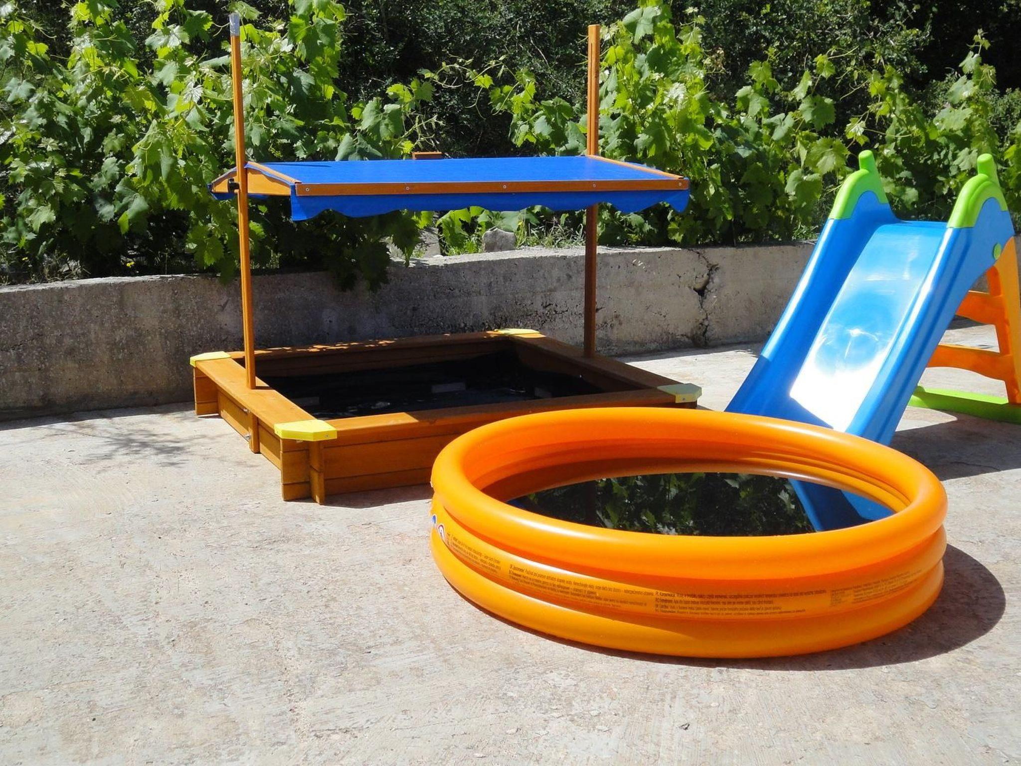 You have two large terraces, one covered and one open, which are equipped with garden furniture and sun loungers. From the terrace you have a great panoramic view of the sea. There is a barbecue next to the house and two parking spaces on the property. We have also thought of our younger guests. There is a small playground with a slide, children's pool and sandpit with sun protection.