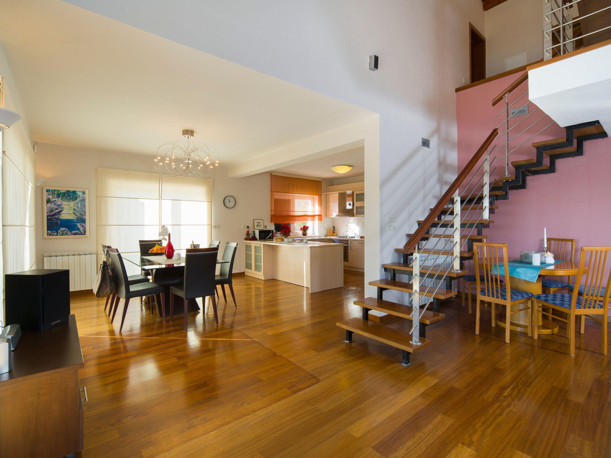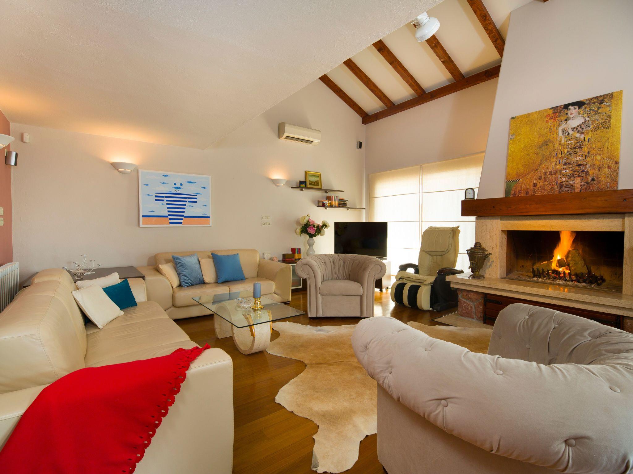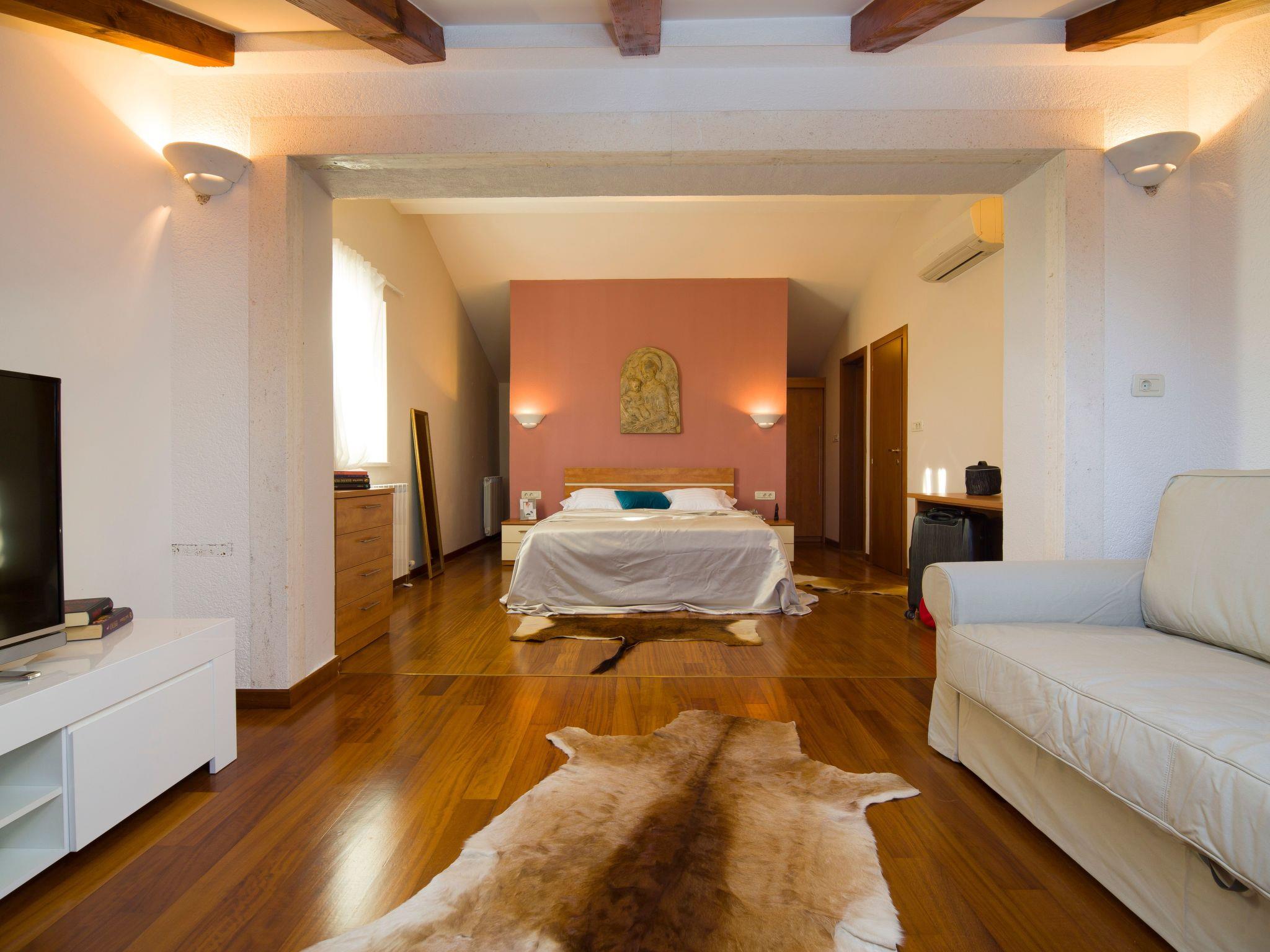 Layout: Ground floor 200m2: Fully equipped kitchen 19,4m2 (electric kettle, toaster, cooker (4 ring stoves, induction), coffee machine, oven, microwave, dishwasher, fridge-freezer, icemaker), - Dining room 20,4m2, dining table, heating, air conditioning - Living room 58,14m2 (2x single sofa with chairs, TV (flatscreen), dining table, fireplace, air conditioning, heating), - With open gallery above, the perfect place for chilling, reading the book or listening some music. - Hallway which takes you to wardrobe, one of 2 bedrooms (17m2 and 27m2) or bathroom 10m2 and takes you on the upper floor/gallery 33m2 Attic is 175m2: - Gallery 33m2 - 1. bedroom 75m2 with bathroom 11m2 - 2. bedroom 44m2 with bathroom 12m2 Terrace: (private, roofed, fenced, m2), lounge set) Outdoor area features a private swimming pool 6x8- 48m2, a sun deck with loungers, BBQ facilities, and garage.