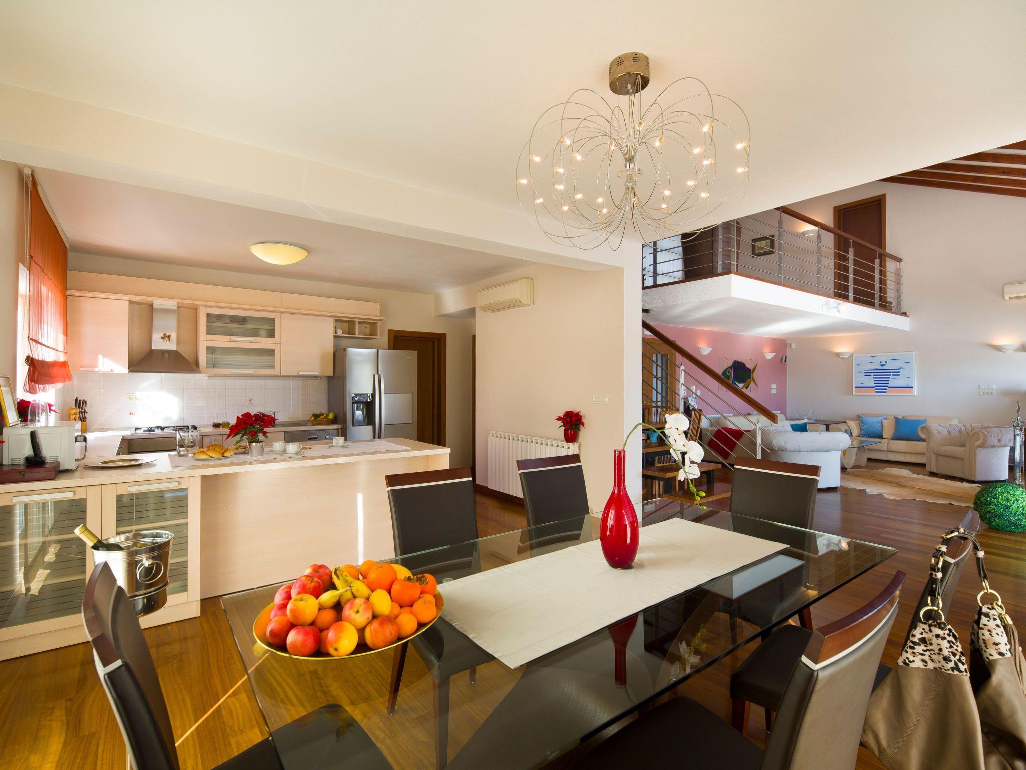 Luxury Villa Domus Dominica spreads over two floors. The central room is a spacious, living room with a fireplace and dining room that has direct access to the breathtaking covered terrace, offering an incredible panoramic view that will leave you in awe.