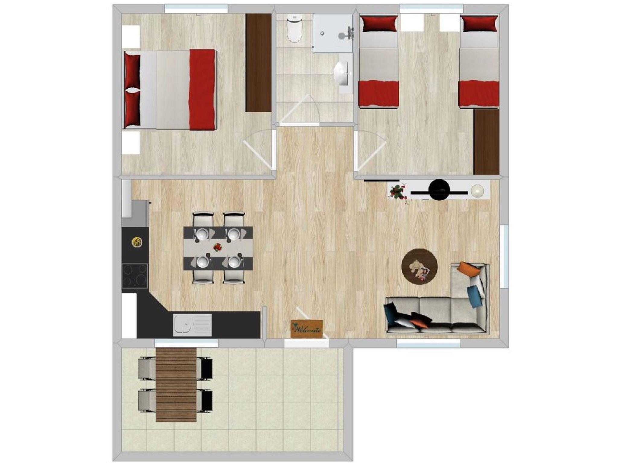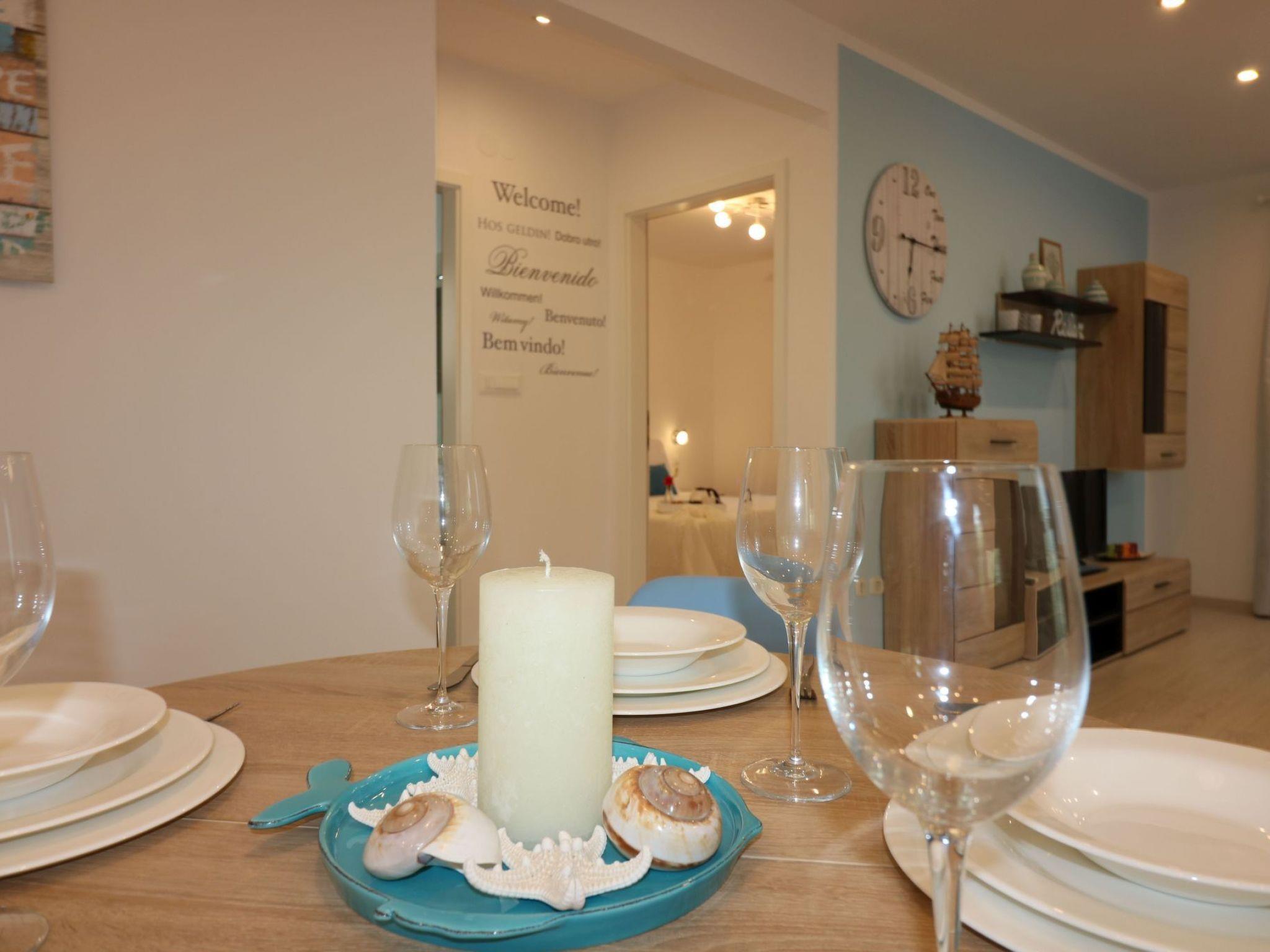 Inside, the flat impresses with its appealing modern furnishings that leave nothing to be desired. There is a cosily furnished living/dining room with a sofa, satellite TV and air conditioning, which offers a seamless transition to the garden and terrace. There are also two bedrooms for your comfort - one with a double bed and another with two separate beds. The flat also has a fully equipped kitchen with microwave, dishwasher, filter coffee machine, toaster and kettle, as well as a bathroom with shower and WC.