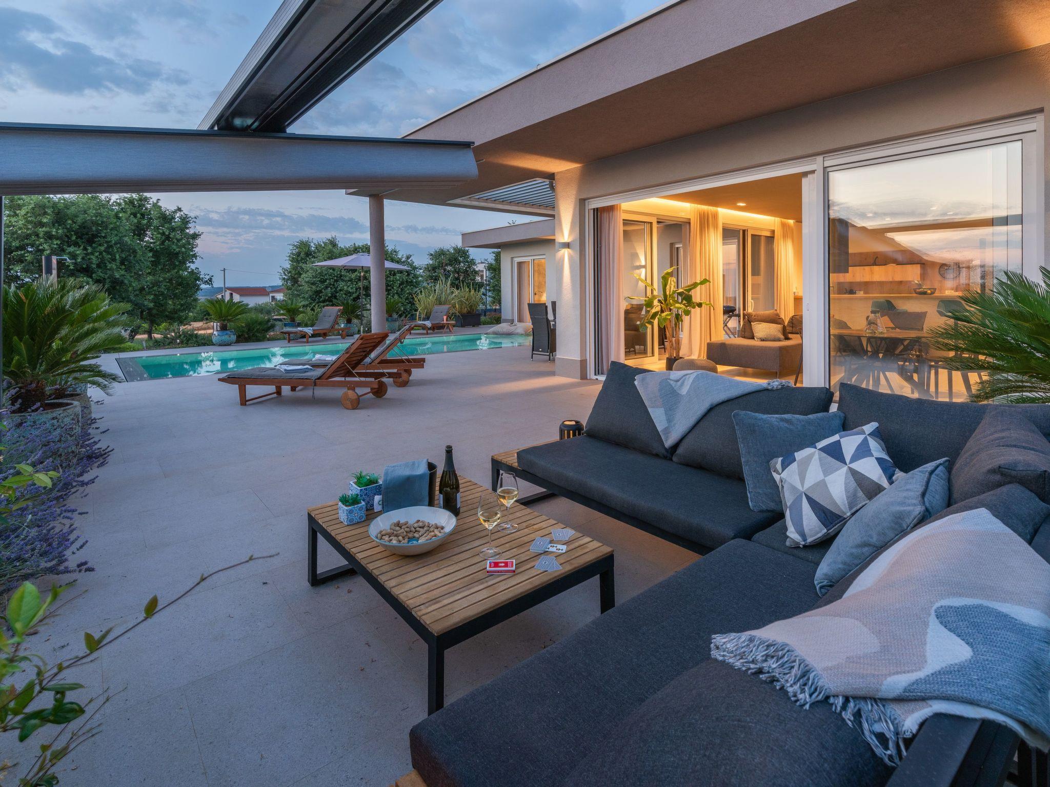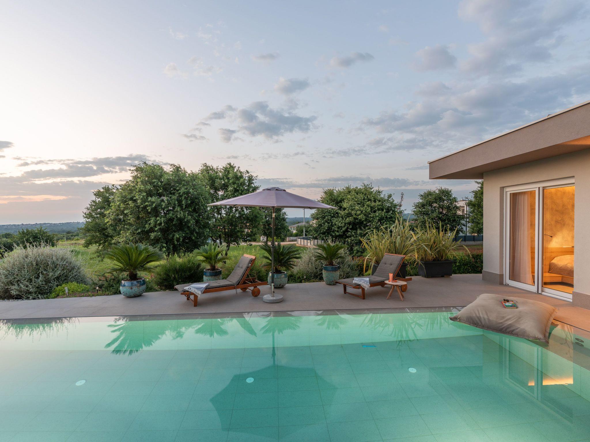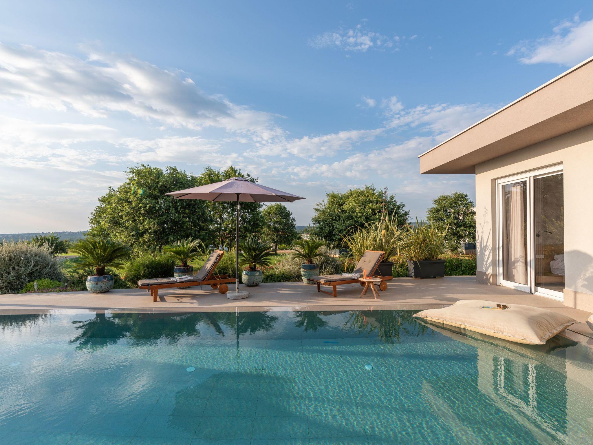 Villa Serena is a modern holiday home in Stranici, only 10 minutes by car from the nearest beach and from Porec. It is located on the edge of the village, on its own fully fenced garden of 1280 m2, where guests have at their disposal a 35m2 outdoor pool with salt water, a covered terrace with table for outdoor dining, barbecue and lounge furniture. A swing is located on the elevated terrace.