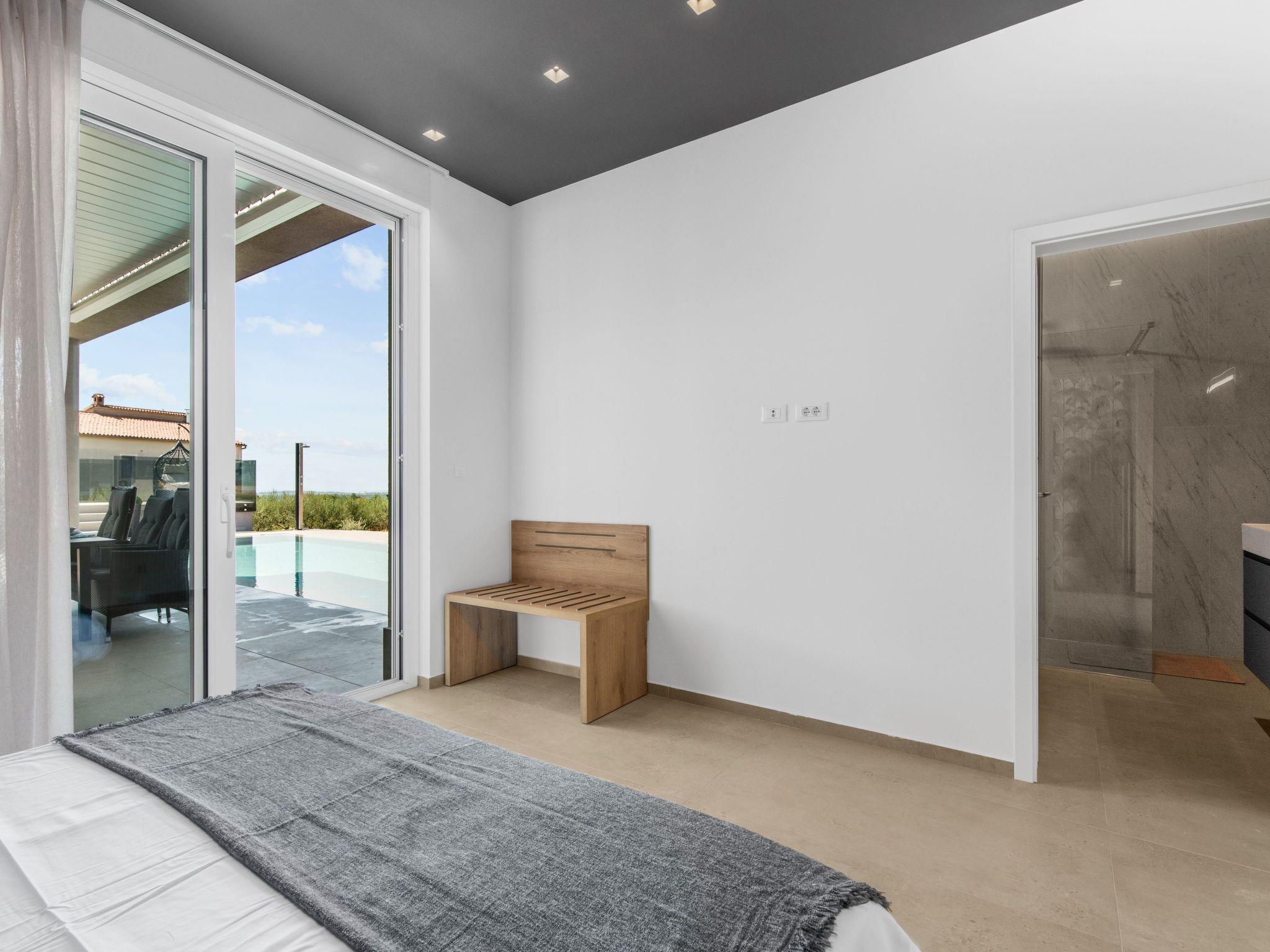 Villa Serena for 4-6 persons extends over 140 m² on the ground floor. It consists of an open-plan living area with a fully equipped kitchen, a dining table and a living room with large sliding doors leading directly to the terrace and pool. In the second part of the house there are two bedrooms, each with its own bathroom and a separate toilet in the hallway. Both bedrooms have direct access to the pool area and offer wonderful views.