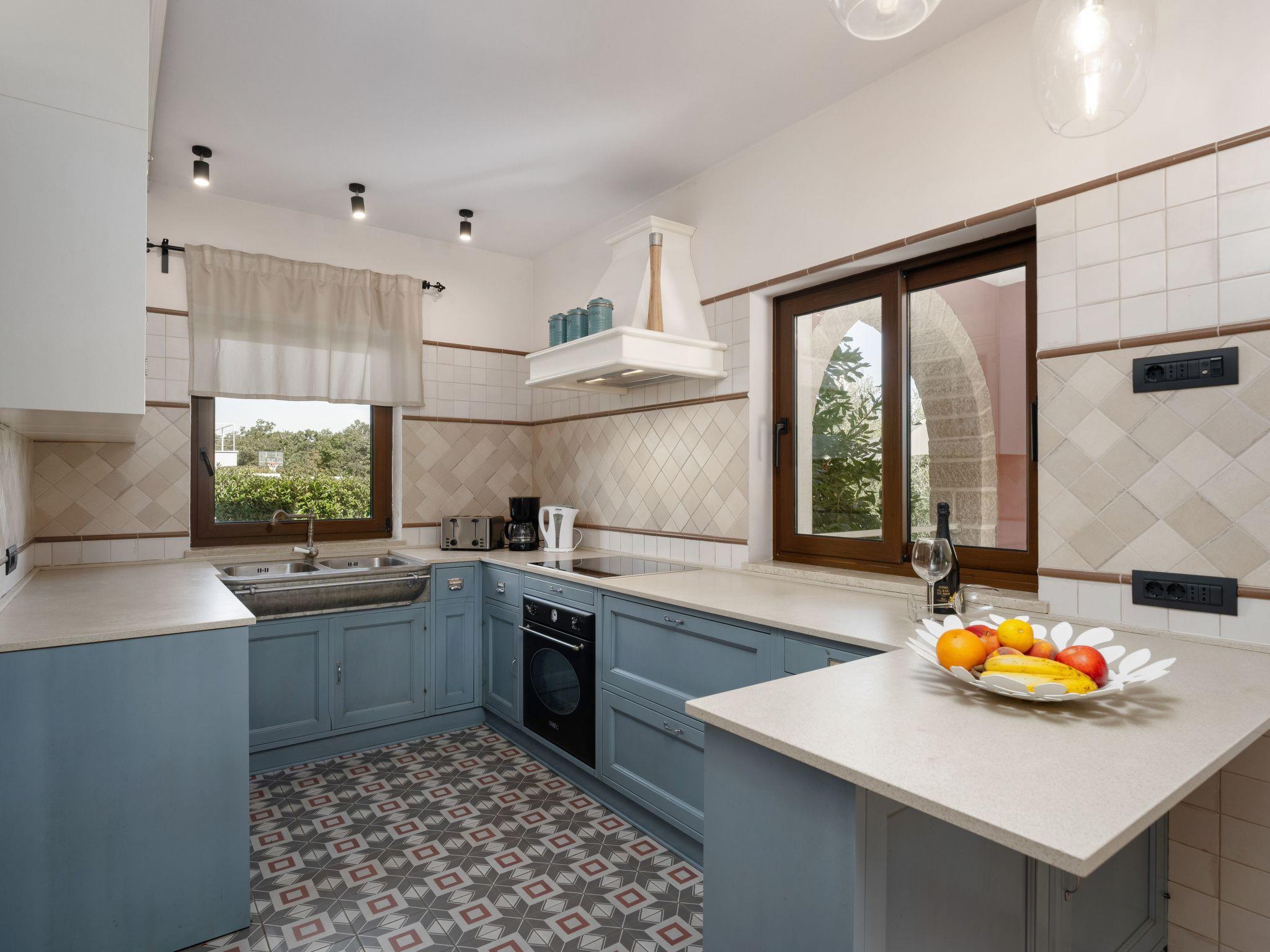 Inside, state-of-the-art comfort awaits you on two levels with 220 m² of living space. A spacious living area with direct access to a covered terrace invites you to linger, while the fully equipped kitchen and adjoining dining room provide the setting for sociable dinners. A comfortable bedroom with a double bed, a bathroom with shower and a separate toilet are also located on the ground floor. The upper floor houses further bedrooms - including a double room with access to the balcony and a single room, both with panoramic sea views, two double rooms with views of the pool and access to a shared balcony, a further bathroom and a laundry room.