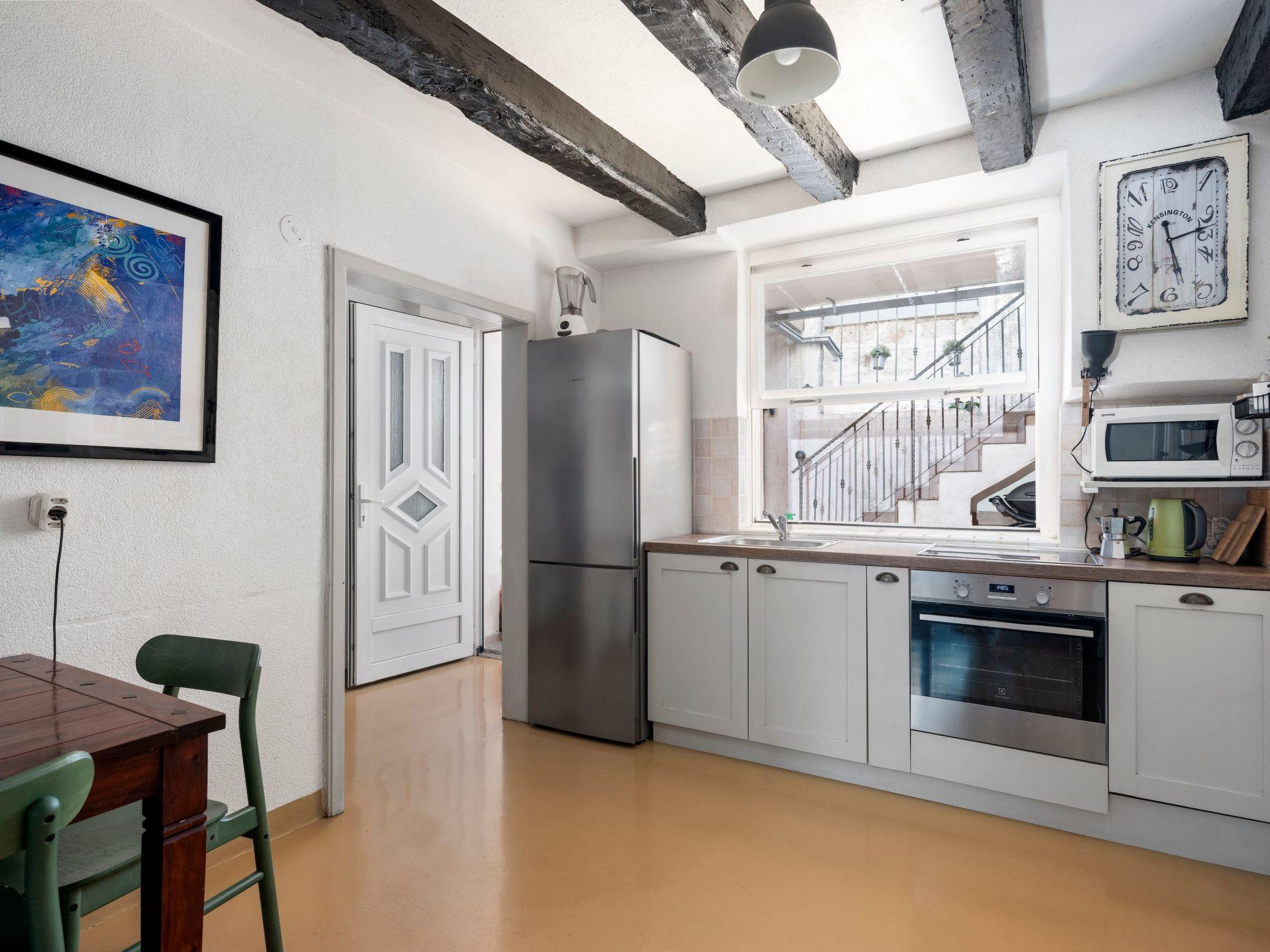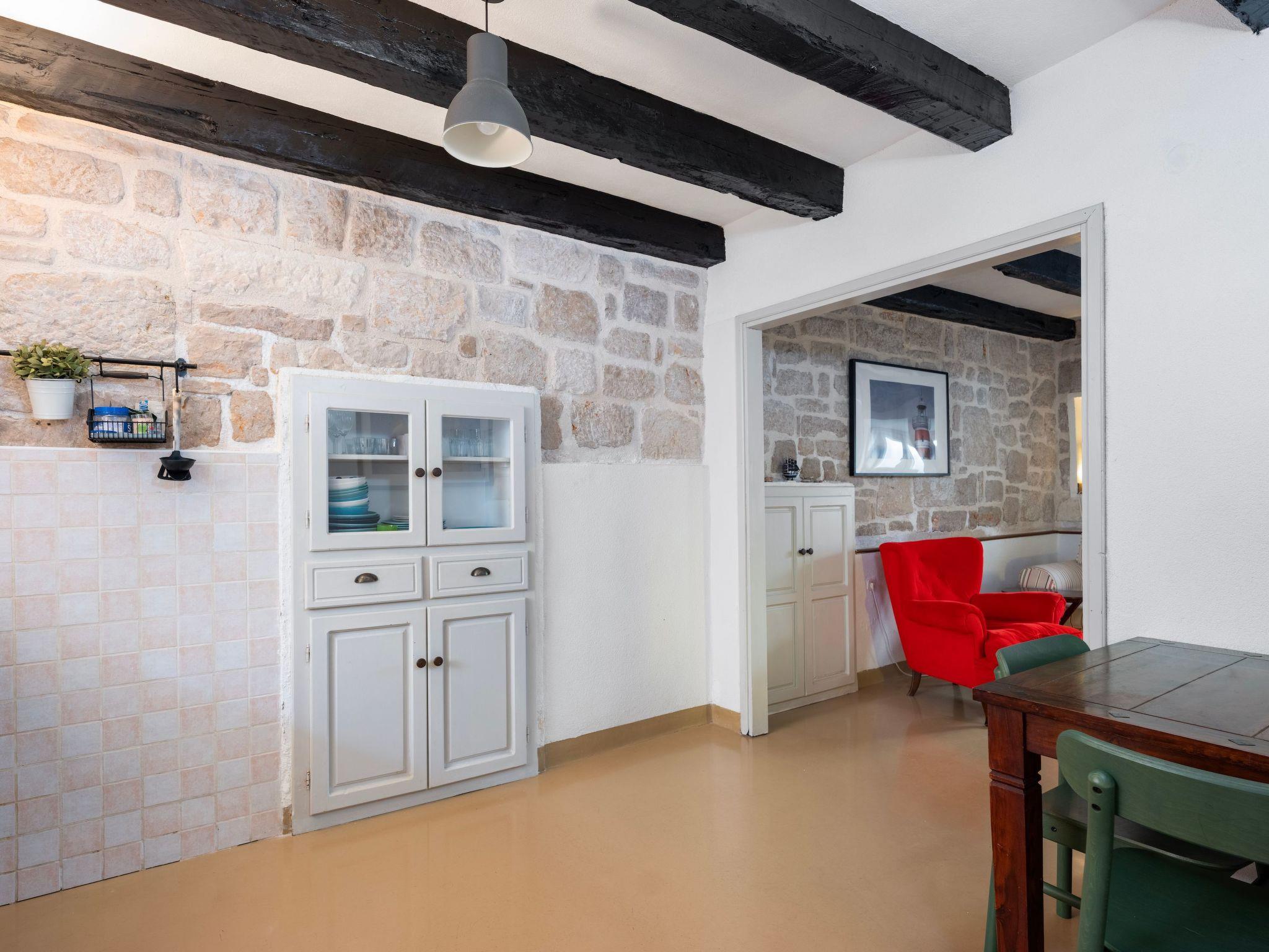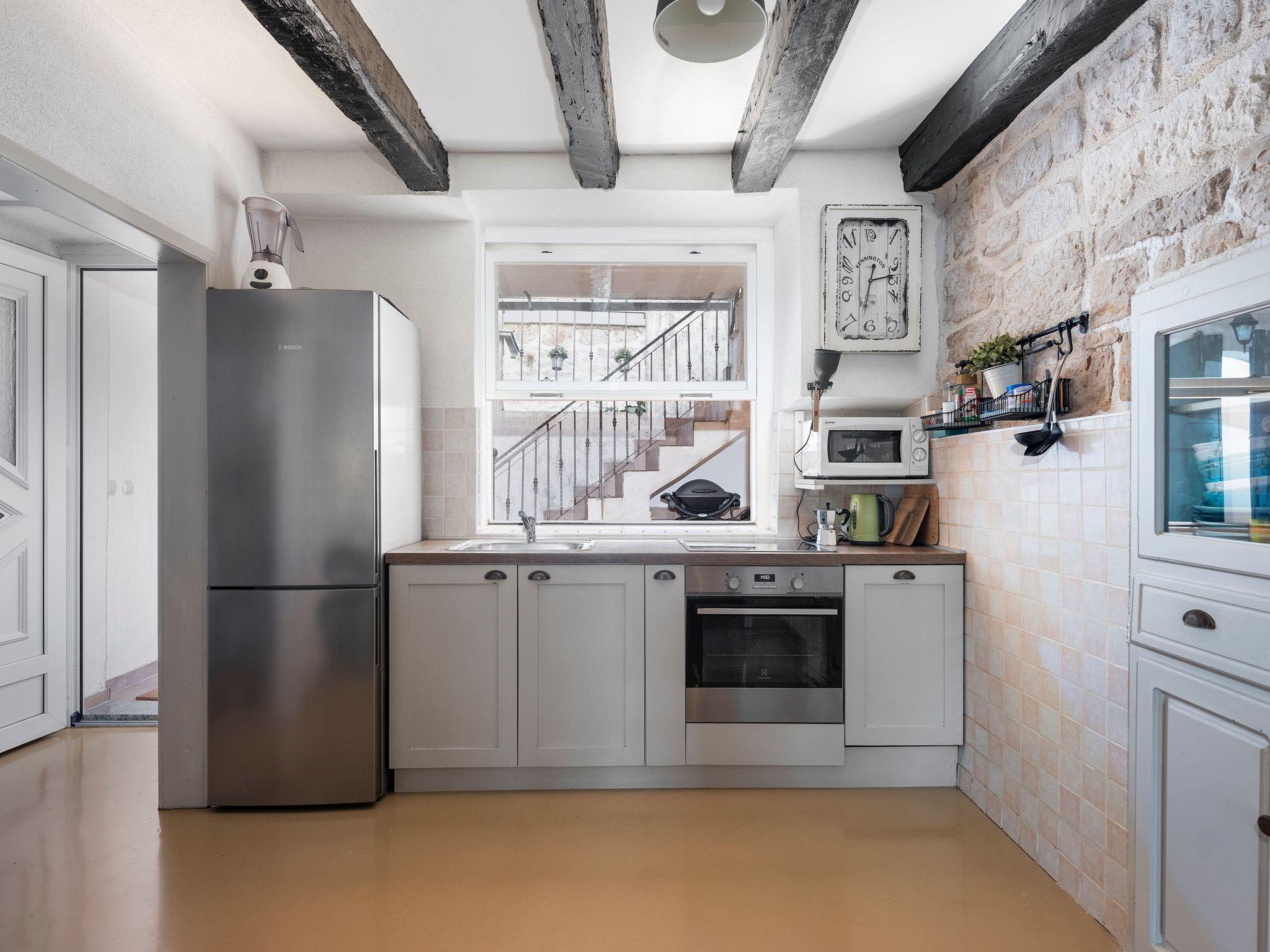 The house dating back to 1800 was extensively renovated in 2015, providing modern amenities for a comfortable stay. During the renovation attention was paid to preserving the traditional elements, so solid stone walls and wooden ceiling beams tell the story of past times. The living space of 70m² is spread over two floors and comprises a living and dining room with an integrated, open kitchen, two bedrooms, a daylight bathroom and a separate guest toilet. The air-conditioned (cool/warm) living room on the ground floor provides a comfortable sofa and an armchair, a wall-mounted flatscreen TV with cable and satellite channels and a USB port, a stereo system, a safe for your valuables and a wooden dining table with chairs. The modern, white, built-in kitchen next to it is equipped with a dishwasher, a ceramic hob, an oven, fridge with freezer compartment, microwave, kettle and coffee machine. The bathroom on the ground floor has a bath with a shower attachment, a wide washbasin with a cupboard underneath and a wall mirror, a hairdryer, a toilet and even a washing machine. Wide stairs lead up to the two bedrooms, one with a double bed (160 x 200cm), the other with two single beds (90 x 200cm), which can also be pushed together as a double bed. The sofa in the living room can be converted into an additional double bed. There is a convenient separate guest toilet. Plenty of bed linen and towels are provided and the reliable wireless Internet connection in the house can be used free of charge.