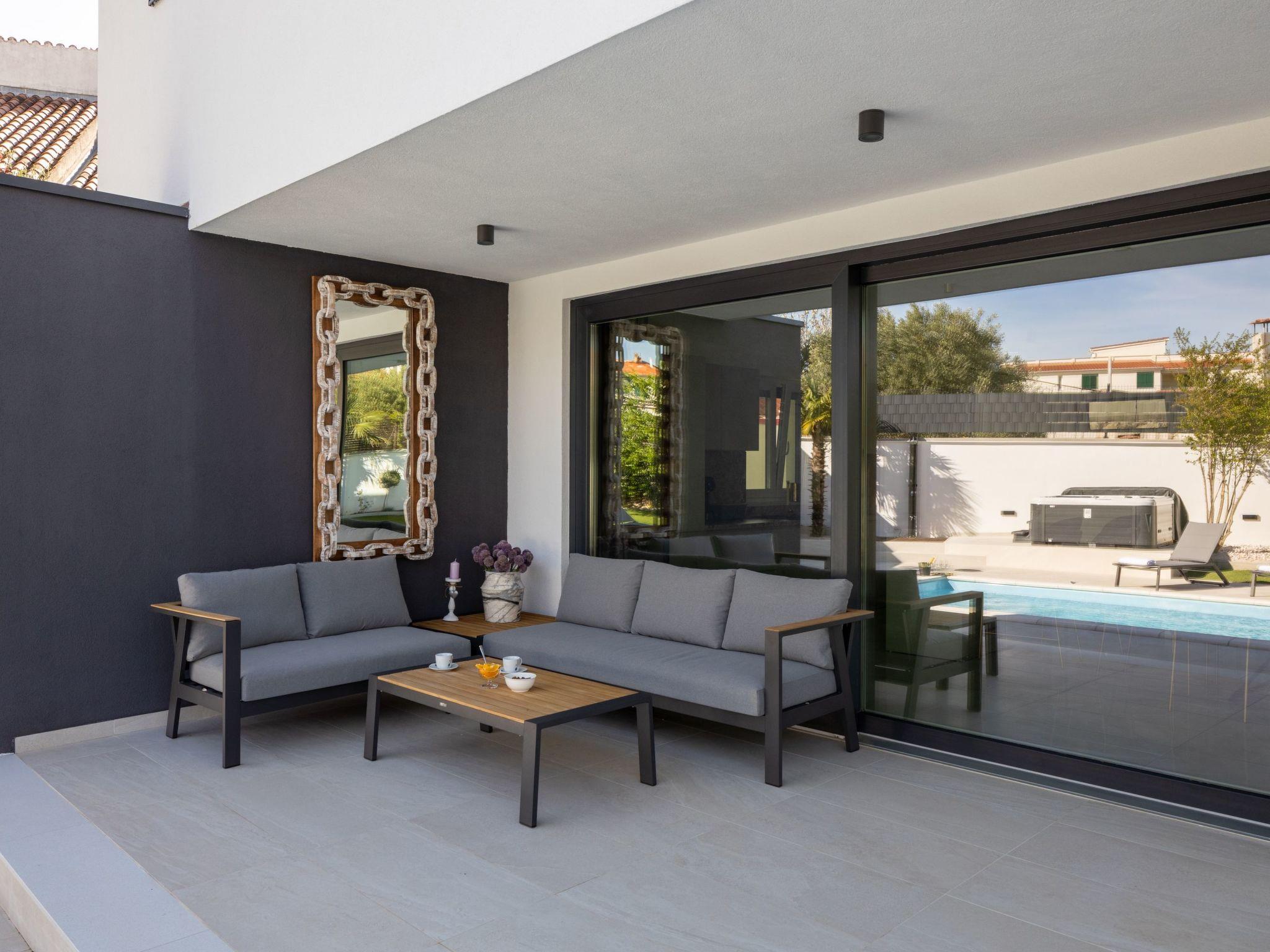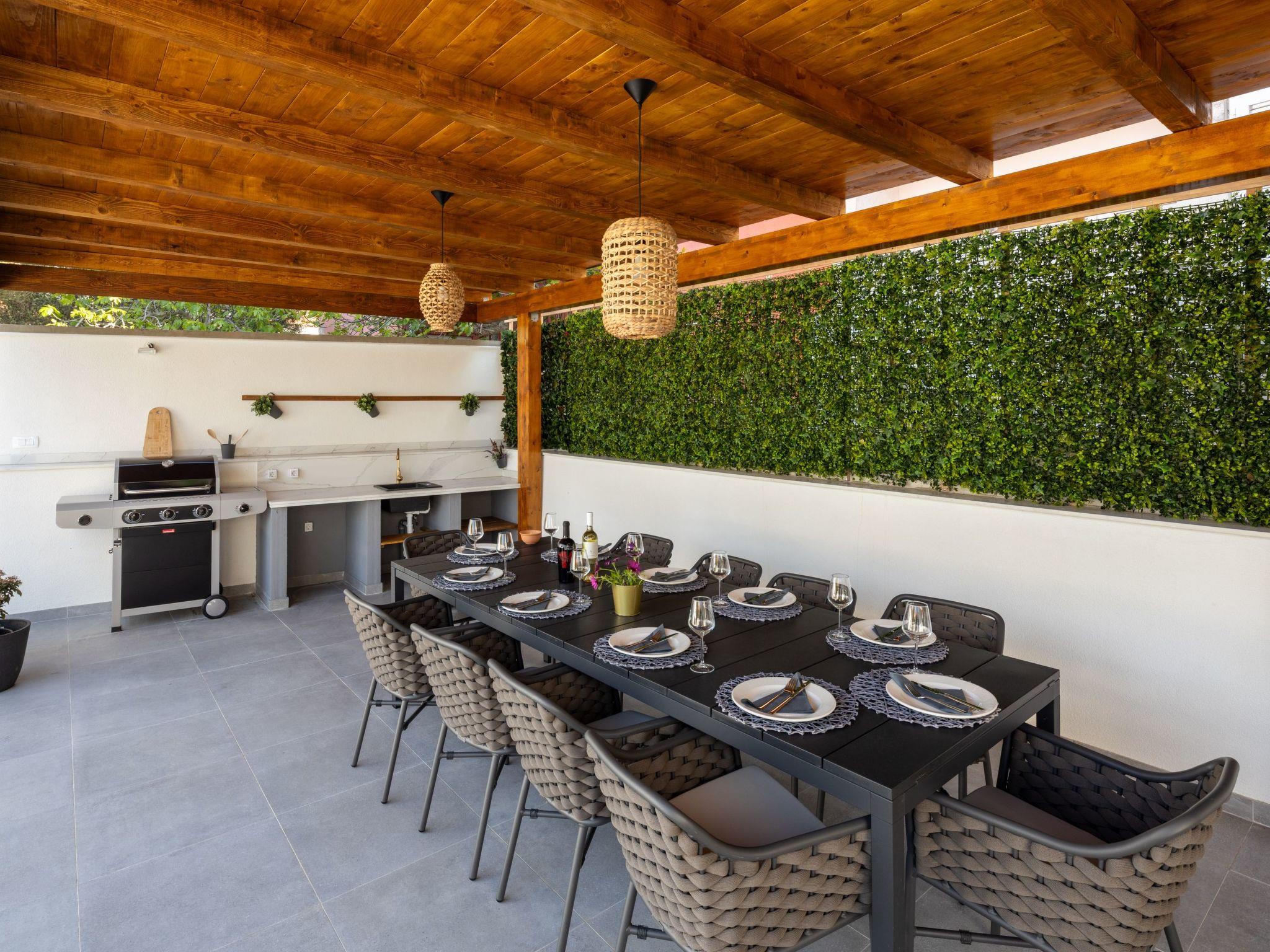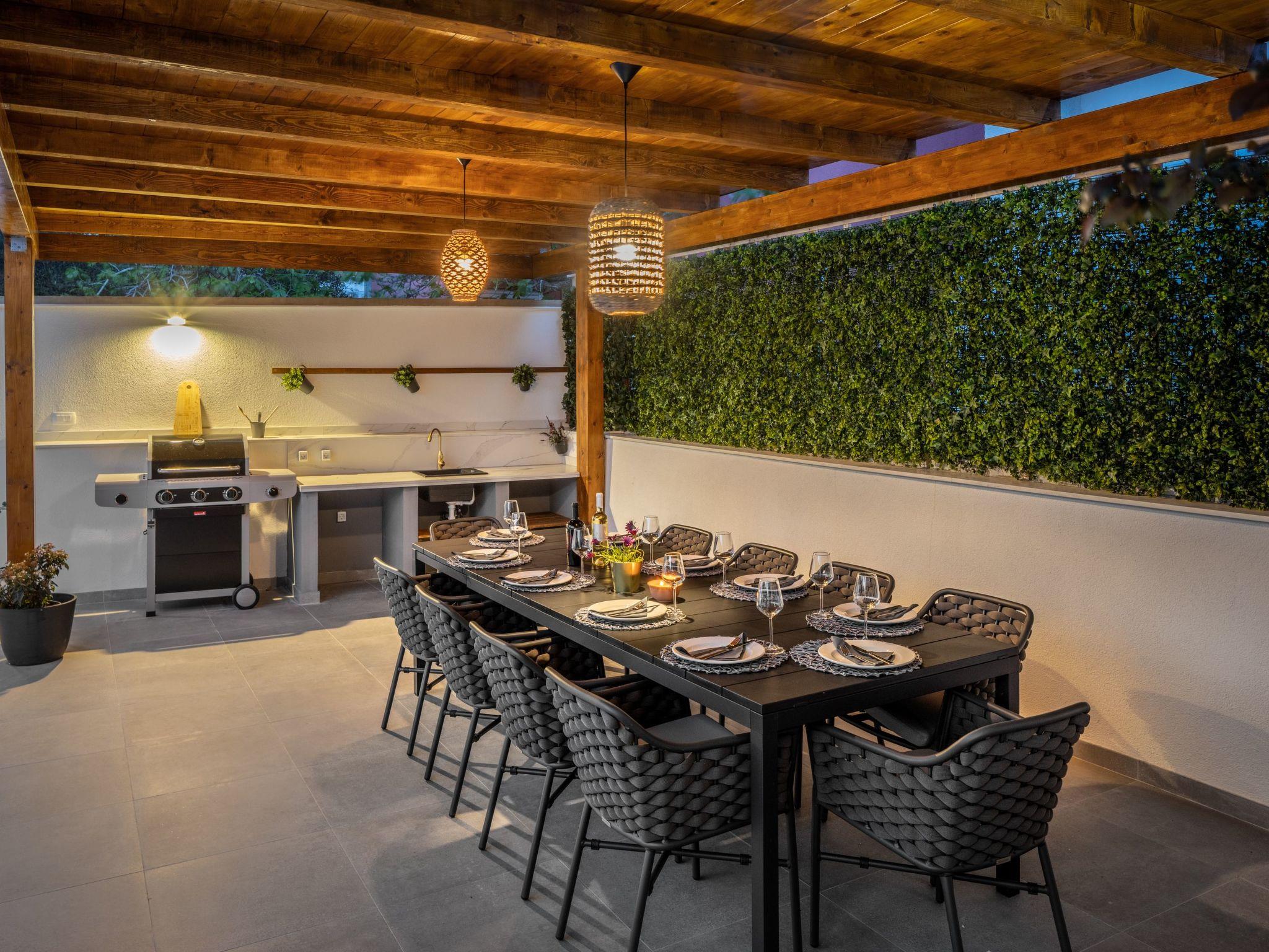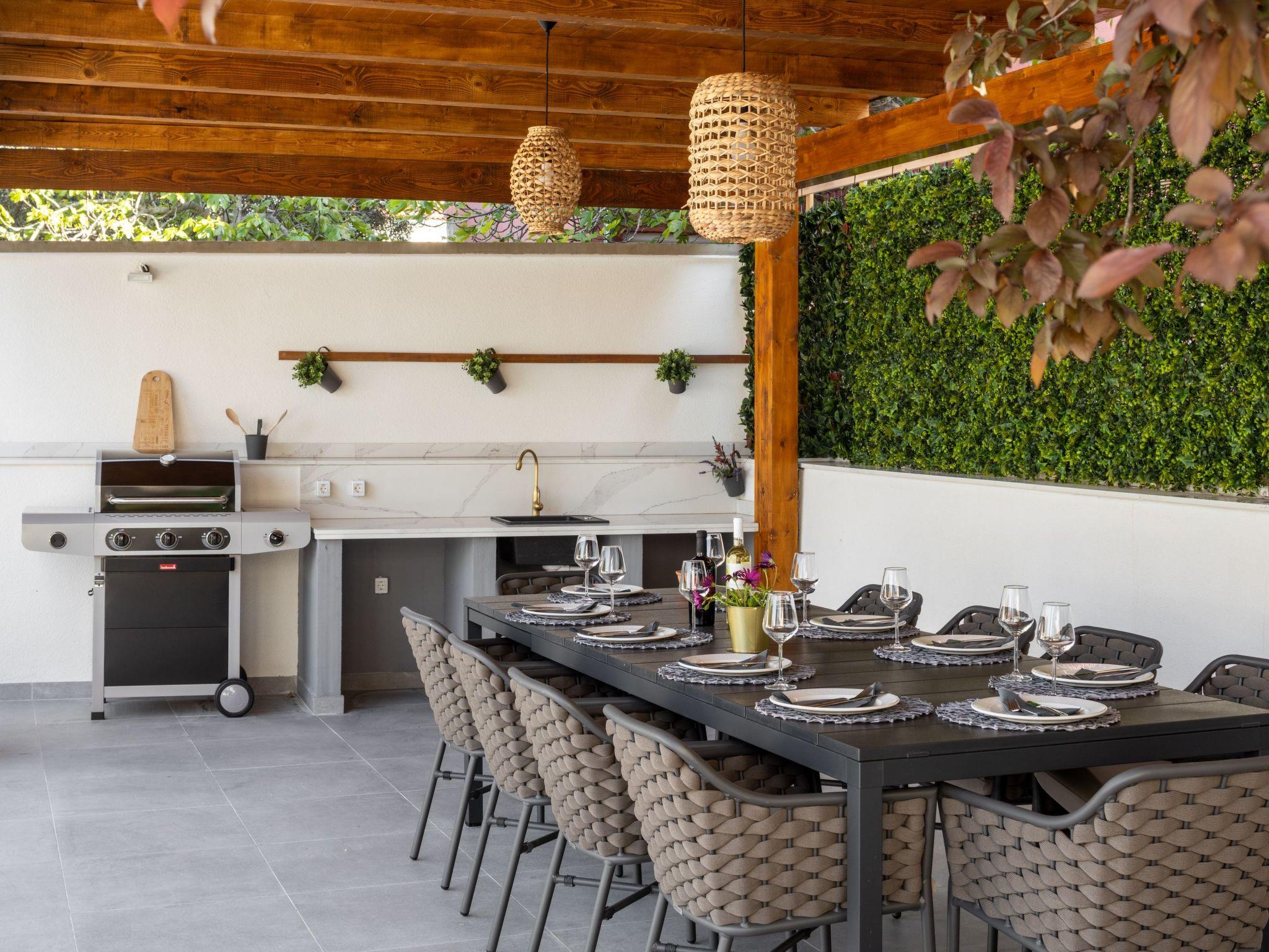 There is a heated pool with 10 sun loungers around it. After the pool you can also use the outside shower. The garden is private and it has a terrace with a sunshade underneath which there is an outdoor kitchen and a dinning area for 10 persons. There are 6 parking spaces outside the villa and the property is fully fenced.