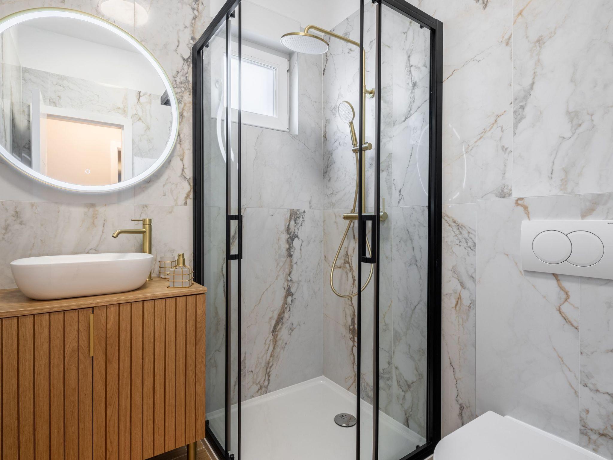 On the ground floor of the villa you can find the kitchen, living room, bathroom and laundry room. On the first floor there are 5 bedrooms and 4 bathrooms. Two bedrooms have their own bathrooms. All bedrooms have a TV and AC. The bed in each room is 200x160. The kitchen is fully equiped so it has an oven, stove, microwave, coffee machine and a dining table for 12 guests. In the living room you can find two sofa beds for two extra guests. You also have a smart TV, different games and chess board.