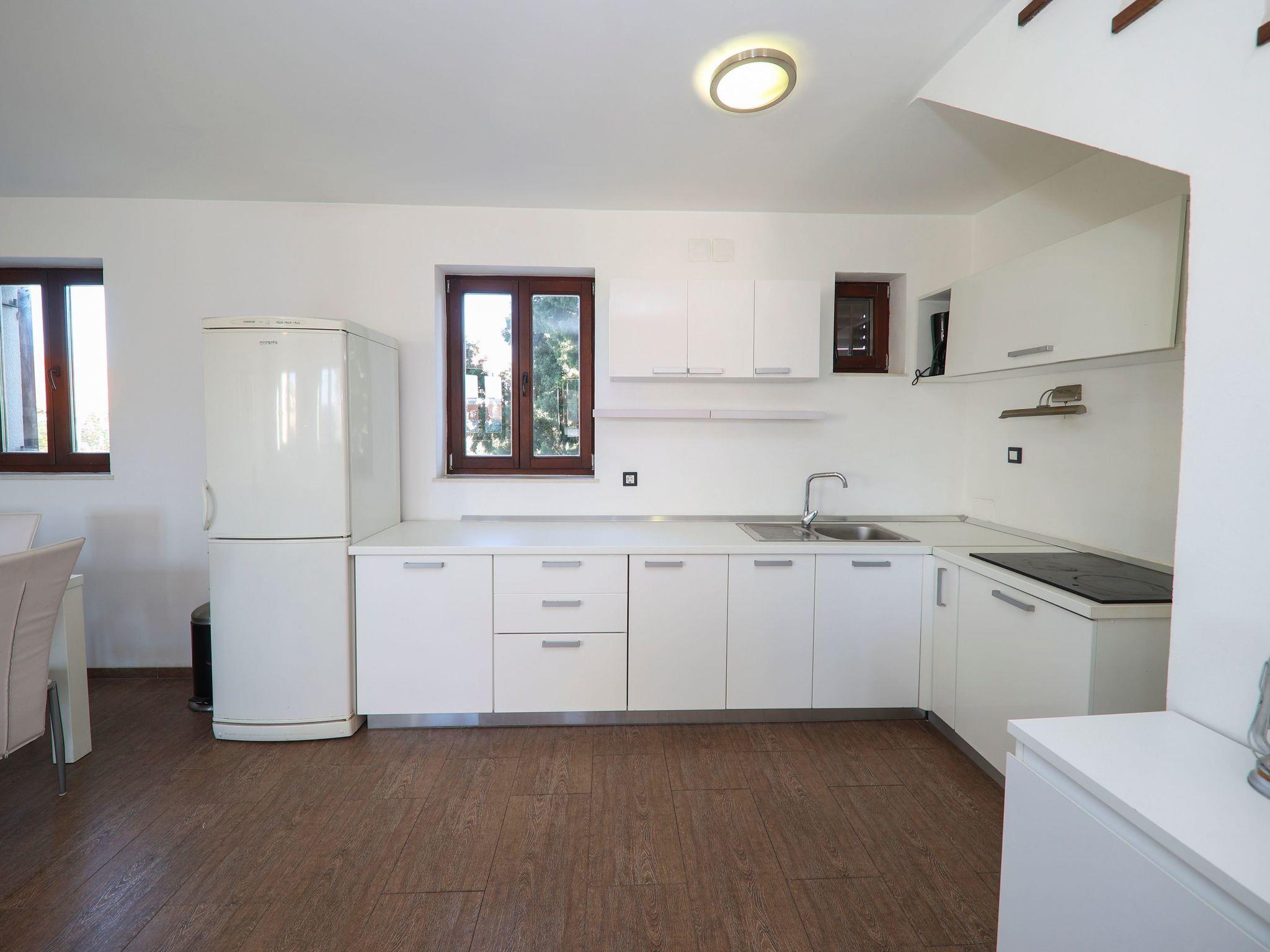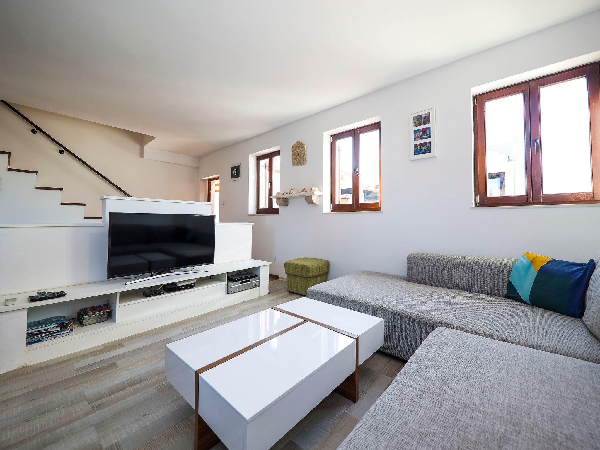 The living room opens onto the private sunny terrace, where you can make yourselves comfortable around the traditional stone grill and enjoy leisurely meals under a blue sky, or simply sunbathe in absolute privacy.