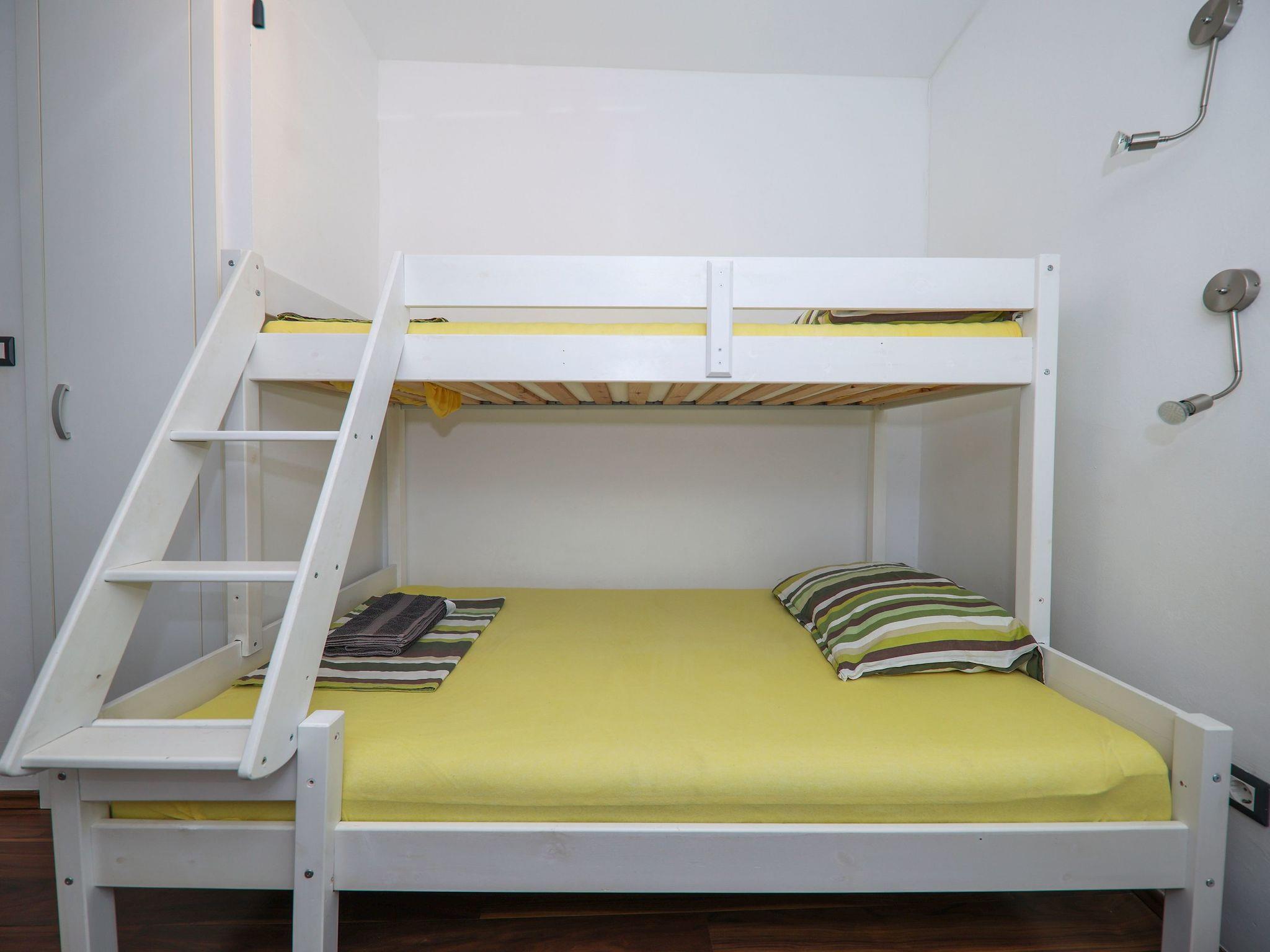 The generous 140m² apartment (68m² indoor space plus 72m² terrace) on the ground floor of the two-storey stone house consists of a living and dining room flooded with daylight and with an integrated open kitchen, two bedrooms and a modern daylight bathroom. The living room provides a spacious corner sofa suite, a wide flatscreen TV with satellite channels, a DVD player, a stereo system and a dining table with a glass top and six chairs. The white glossy built-in kitchen next to it is equipped with a four-zone electric hob, a fridge with a freezer compartment, a microwave, a toaster and ample crockery and cutlery. Of the two bedrooms, one is furnished with a double bed (160 x 200cm) and the other with a bunk bed (each 90 x 200cm) and an additional single bed of the same size. The sofa in the living room can be converted into a further double bed (140 x 200cm). The daylight bathroom with light tiles is fitted with a shower cubicle, a washbasin with a wall mirror and a toilet. A washing machine is available in the house for shared use. A highchair can be provided on request. Plenty of bed linen and towels are provided and the reliable wireless Internet connection in the apartment can be used free of charge.