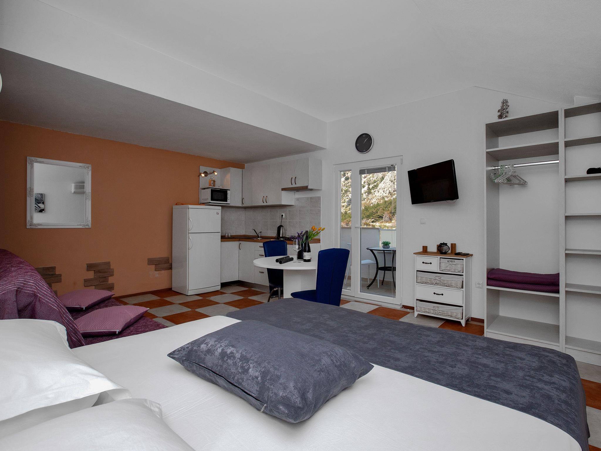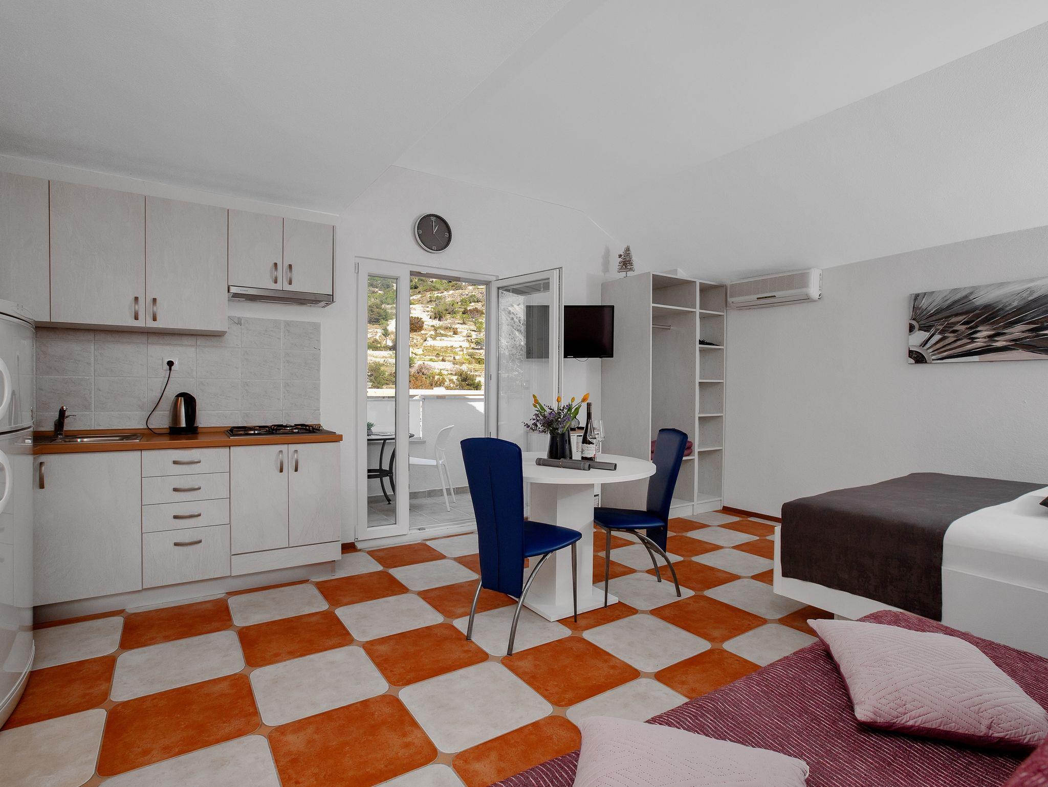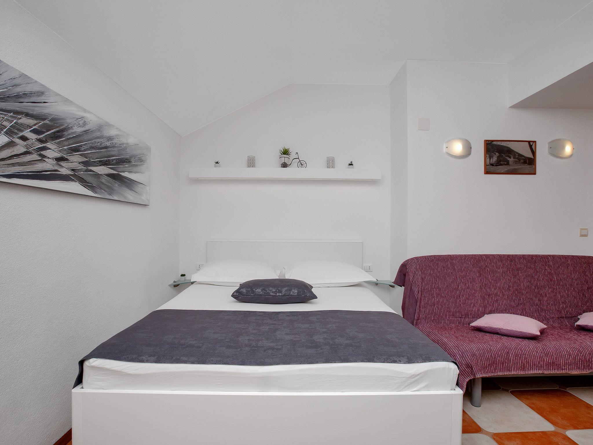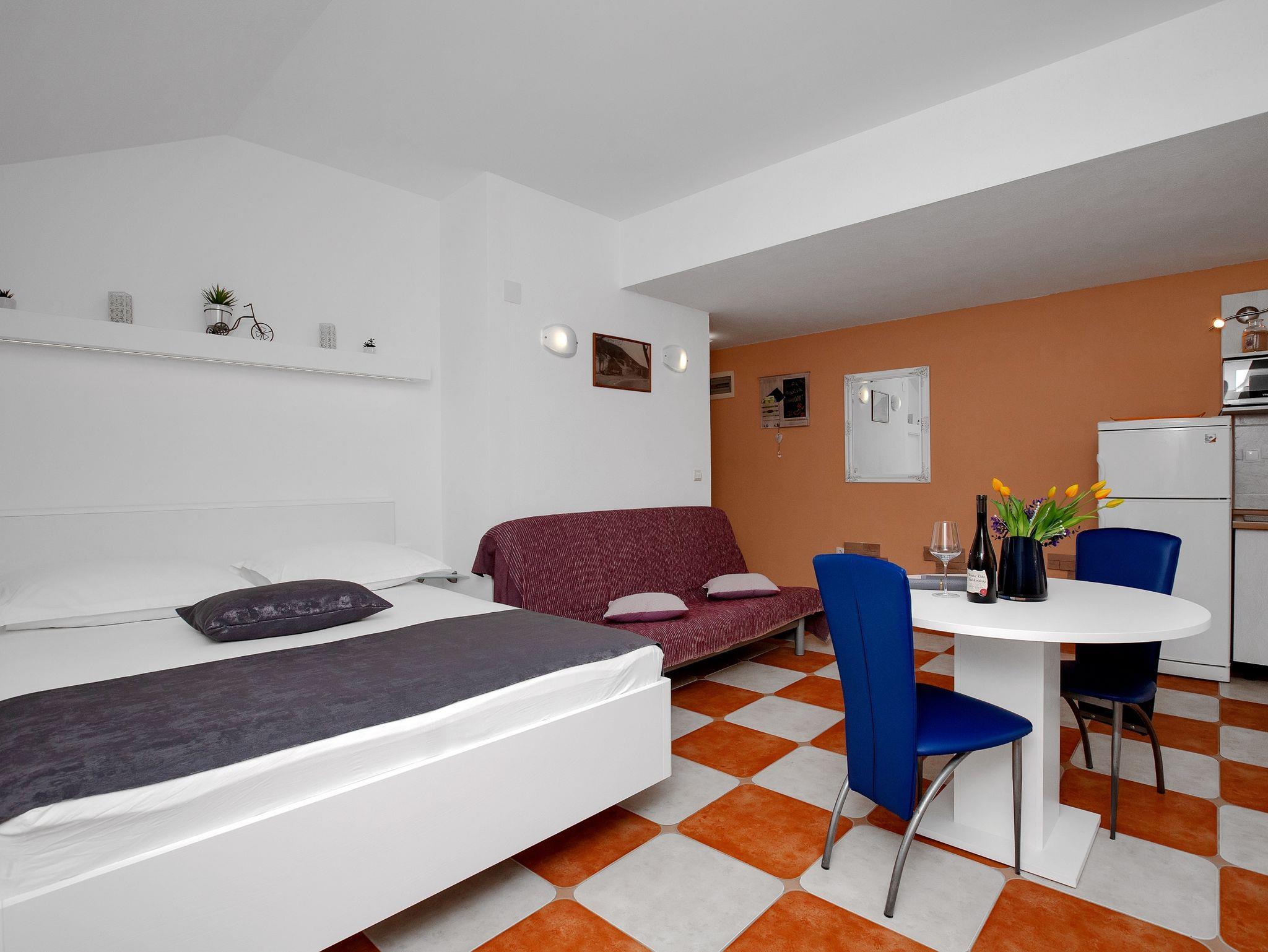 Studio bietet Platz für 3 Gäste. Die Betten sind in Schlafzimmern, die es 1 gibt, und in Esszimmer, innerhalb einer Gesamtfläche von 27m2, angeordnet. Die Gäste haben einen eigenen Balkon zur Verfügung, auf der sie in warmen Sommernächten genießen können. Das Studio-Apartment bietet Meerblick. IM PREIS INBEGRIFFEN: Kurtaxe, Endreinigung, Klimatisierung, Parkplatz, Internet, Bügeleisen, Bügelbrett, Föhn. VERBINDLICHE ZUSÄTZLICHE KOSTEN: Aufzahlung für Kurzaufenthalte (prozentualer Zuschlag pro Nächtigungsanzahl: 30% - 1, 20% - 2, 10% - 3). Die Verfügbarkeit zusätzlicher Dienstleistungen in Ihrem reservierten Termin und die Preise derselben (falls nicht aufgeführt) müssen im Voraus überprüft werden. Zusätzliche Dienstleistungen die in der Zahlungsaufforderung nicht aufgeführt sind werden direkt beim Vermieter bezahlt, angenommen der Gast nutzt auch diese.
