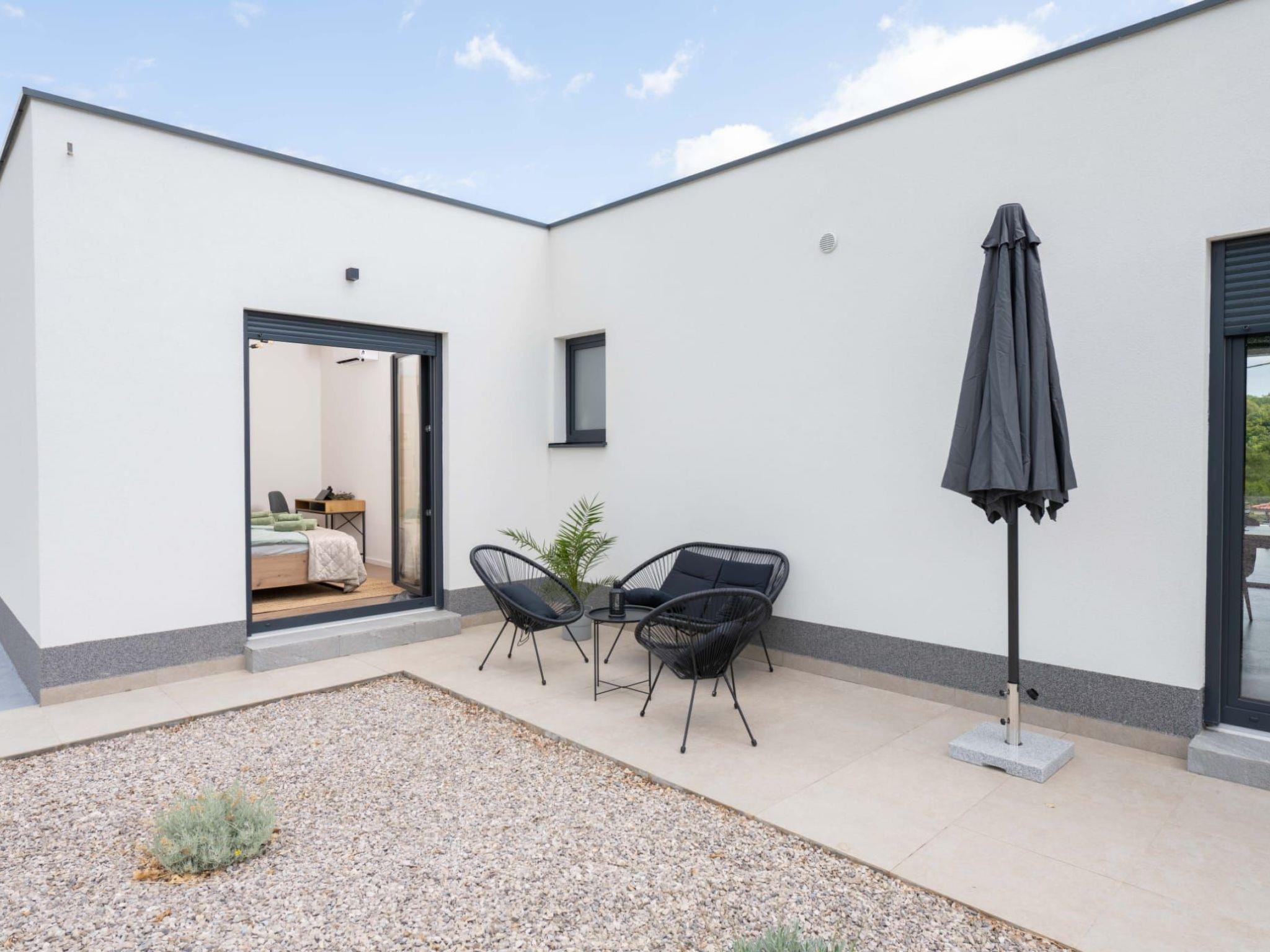 The beautiful covered terrace with a large dining table and the marvellous outdoor kitchen with built-in barbecue is directly connected to the pool area. The barbecue invites you to prepare the delicious specialities of Istrian cuisine.