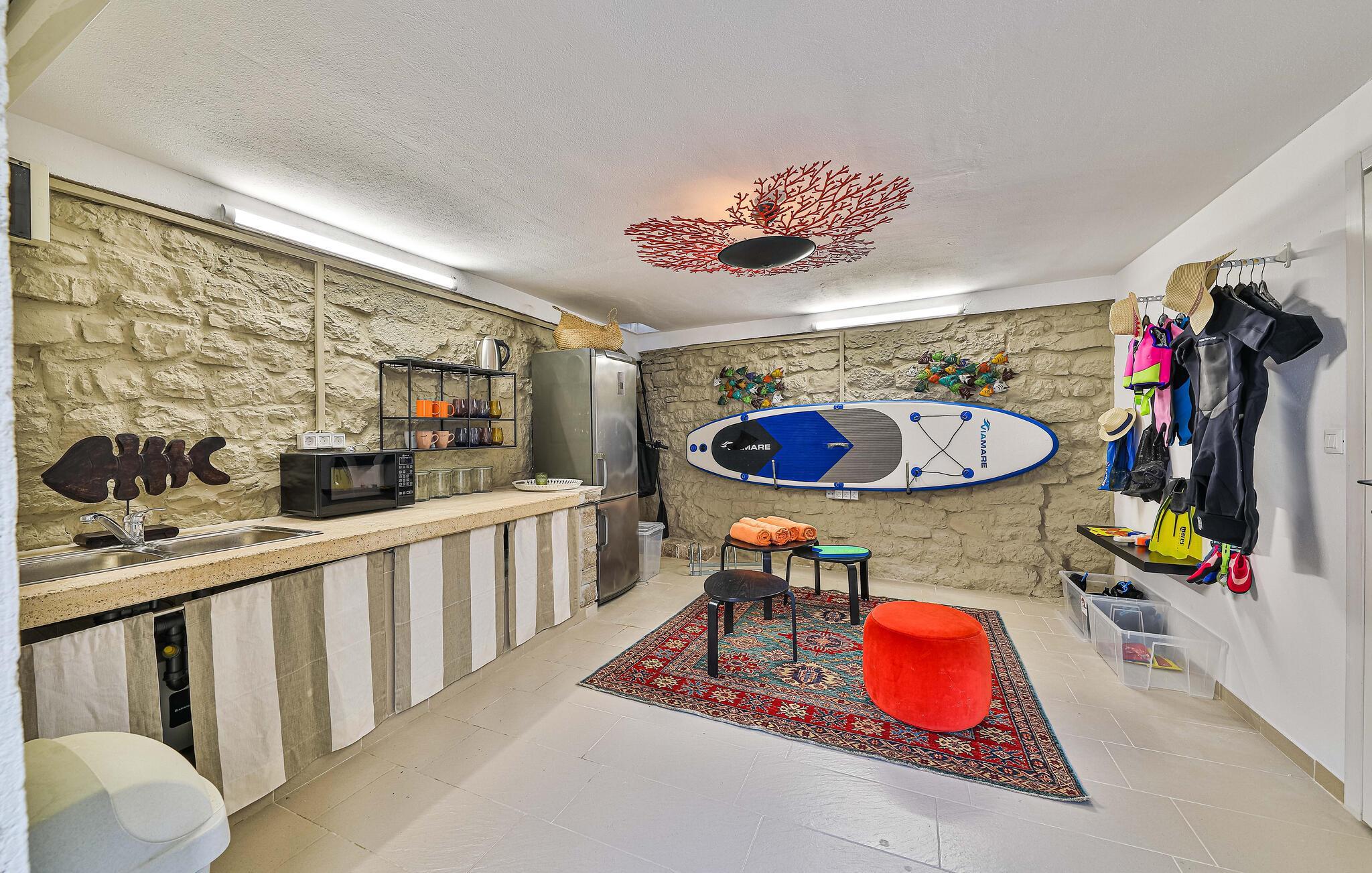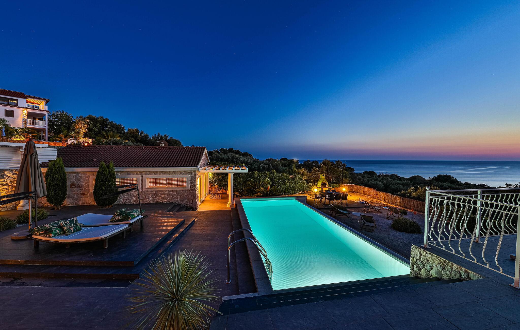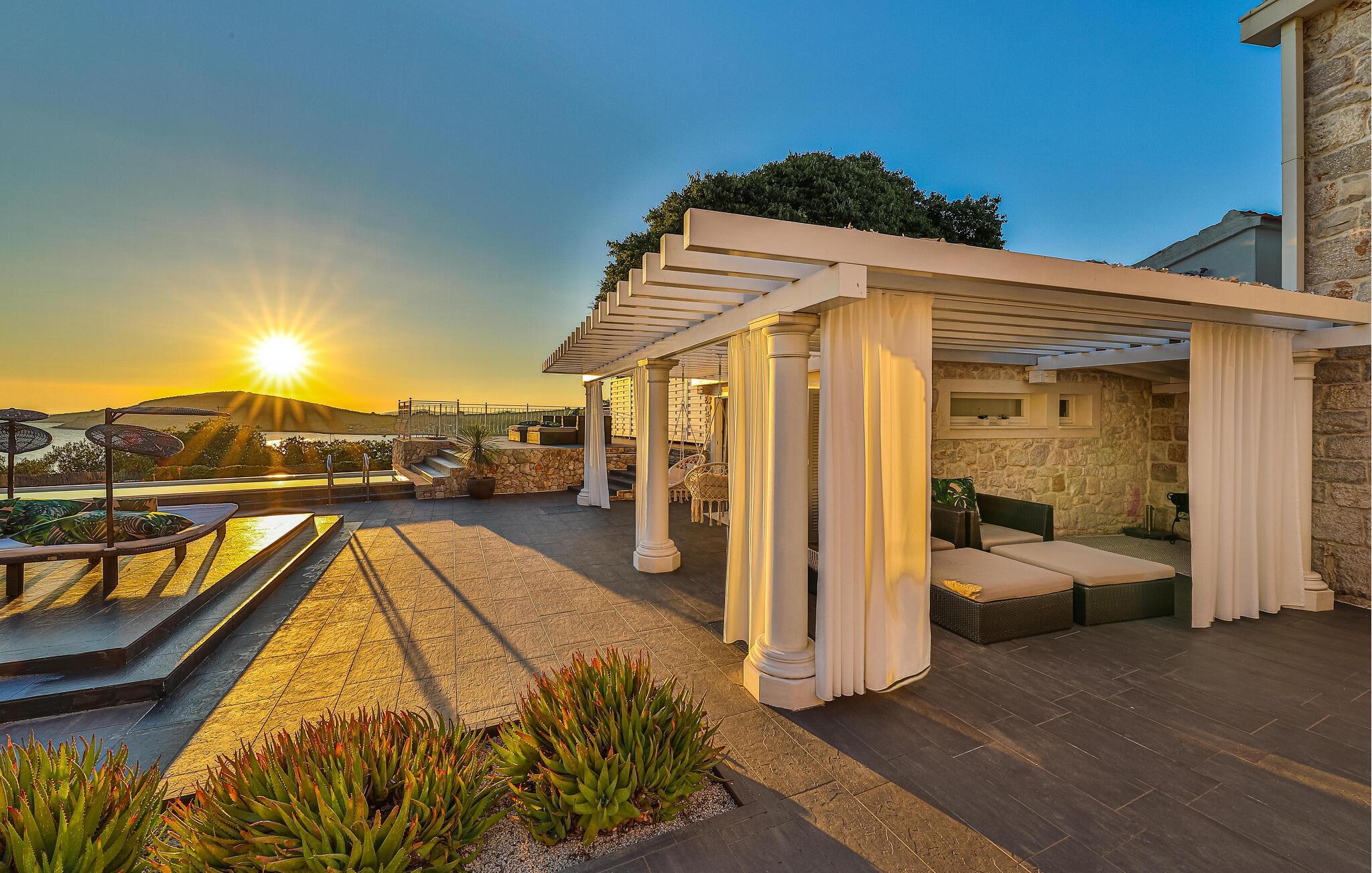 Udenfor er der en helt vidunderlig infinity-pool med panoramaudsigt over havet. I kommer uden tvivl til at tilbringe mange dejlige timer her. Slap af på en af ??liggestolene under den bagende kroatiske sol, mens de små plasker fornøjeligt rundt i poolen. Ejendommen er fuldstændigt indhegnet og tilbyder derfor komplet privatliv og desuden mange hjørner til leg og afslapning. På terrasserne kan I nyde jeres feriemåltider sammen og beundre fortryllende solnedgange til et godt glas vin. Trænger I til et afbræk fra poolen, er der kun 300 meter til den nærmeste grusstrand, hvor I kan bade i krystalklart vand.