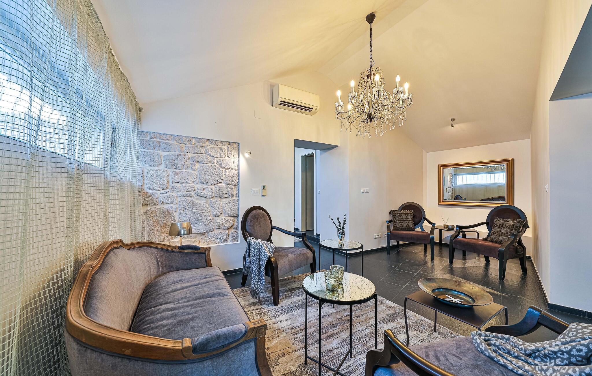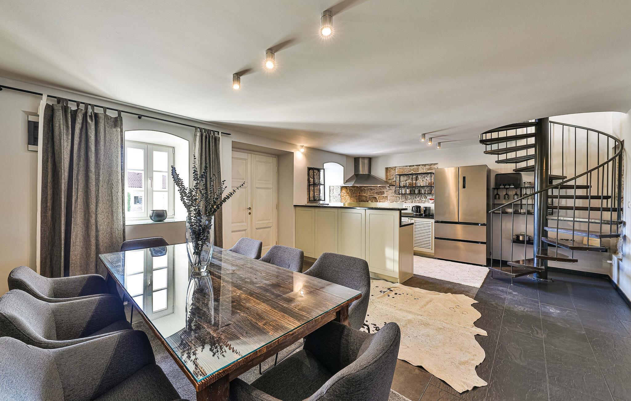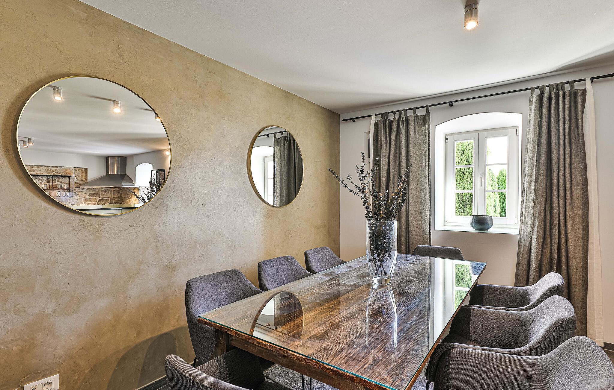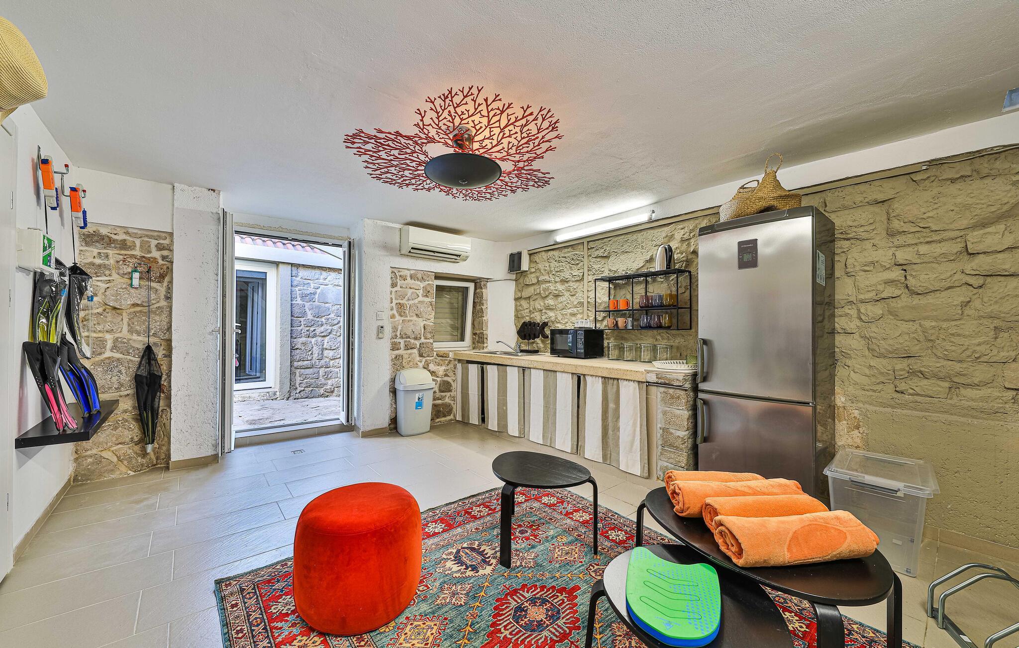 Udenfor er der en helt vidunderlig infinity-pool med panoramaudsigt over havet. I kommer uden tvivl til at tilbringe mange dejlige timer her. Slap af på en af ??liggestolene under den bagende kroatiske sol, mens de små plasker fornøjeligt rundt i poolen. Ejendommen er fuldstændigt indhegnet og tilbyder derfor komplet privatliv og desuden mange hjørner til leg og afslapning. På terrasserne kan I nyde jeres feriemåltider sammen og beundre fortryllende solnedgange til et godt glas vin. Trænger I til et afbræk fra poolen, er der kun 300 meter til den nærmeste grusstrand, hvor I kan bade i krystalklart vand.