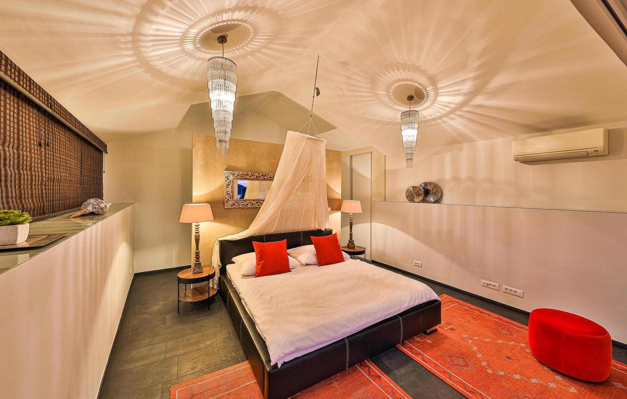 Denne pragtfulde villa består af fire bygninger. Hovedbygningen er i to etager og indeholder køkken-alrum, soveværelse og badeværelse. De øvrige tre bygninger har hver et soveværelse med eget badeværelse. På grund af denne særlige fordeling er villaen særdeles velegnet til gæster, der rejser på ferie sammen, men stadig ønsker privatliv.