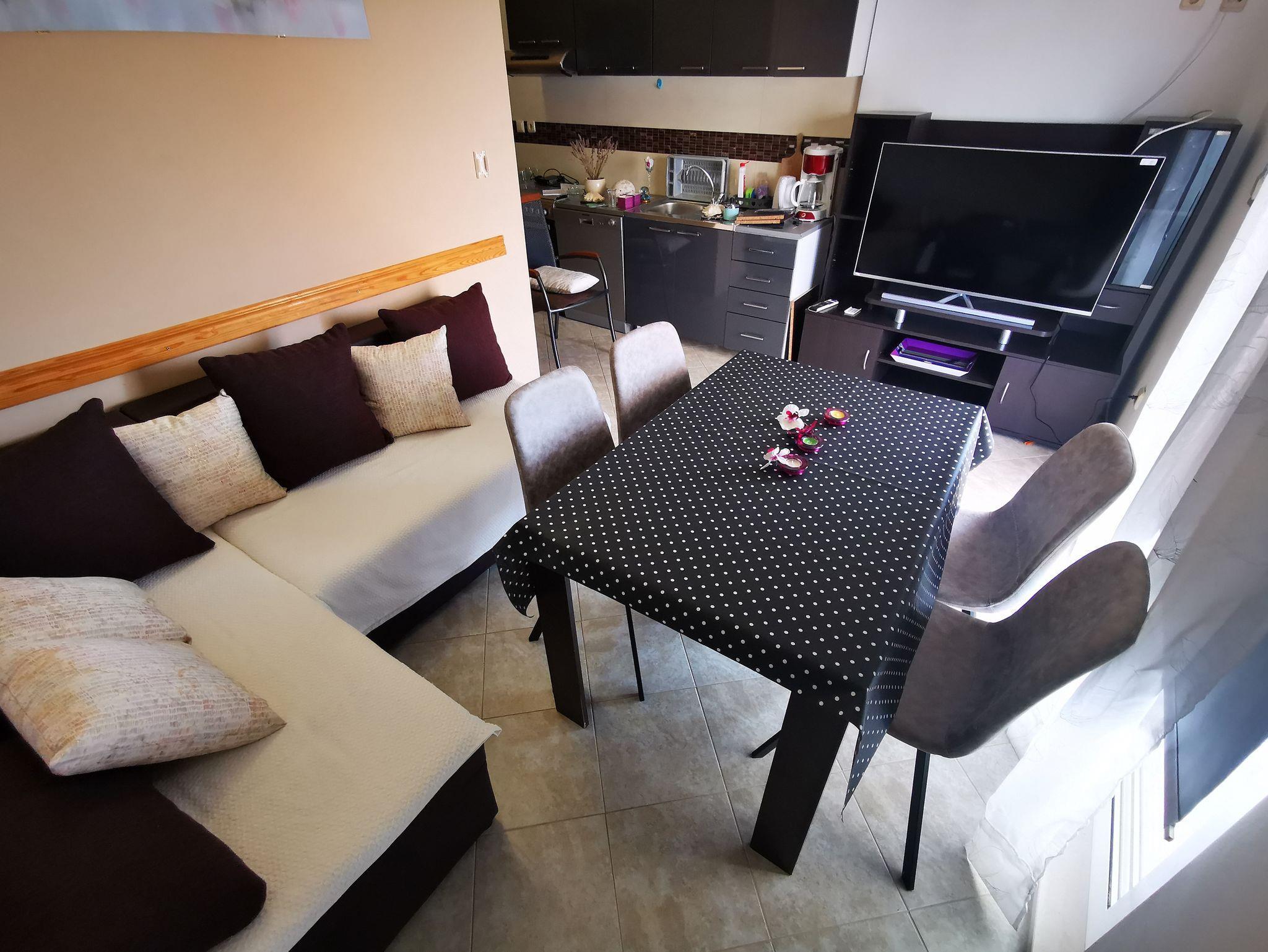 Ferienwohnung bietet Platz für 6 Gäste. Die Betten sind in Schlafzimmern, die es 2 gibt, und in Wohnzimmer, innerhalb einer Gesamtfläche von 38m2, angeordnet. Die Gäste haben eine eigene Terrasse zur Verfügung, auf der sie in warmen Sommernächten genießen können. Das Apartment bietet Meerblick. Es ist erlaubt, Speisen auf dem Gemeinschafts-Grill vorzubereiten. IM PREIS INBEGRIFFEN: Kurtaxe, Endreinigung, Klimatisierung, Parkplatz, Internet, Wäschewaschen, Kinderbett, Bügeleisen, Bügelbrett, Föhn, Sonnenschirm, Liegestühle. VERBINDLICHE ZUSÄTZLICHE KOSTEN: Aufzahlung für Kurzaufenthalte (prozentualer Zuschlag pro Nächtigungsanzahl: 30% - 1, 20% - 2, 10% - 3). Die Verfügbarkeit zusätzlicher Dienstleistungen in Ihrem reservierten Termin und die Preise derselben (falls nicht aufgeführt) müssen im Voraus überprüft werden. Zusätzliche Dienstleistungen die in der Zahlungsaufforderung nicht aufgeführt sind werden direkt beim Vermieter bezahlt, angenommen der Gast nutzt auch diese.
