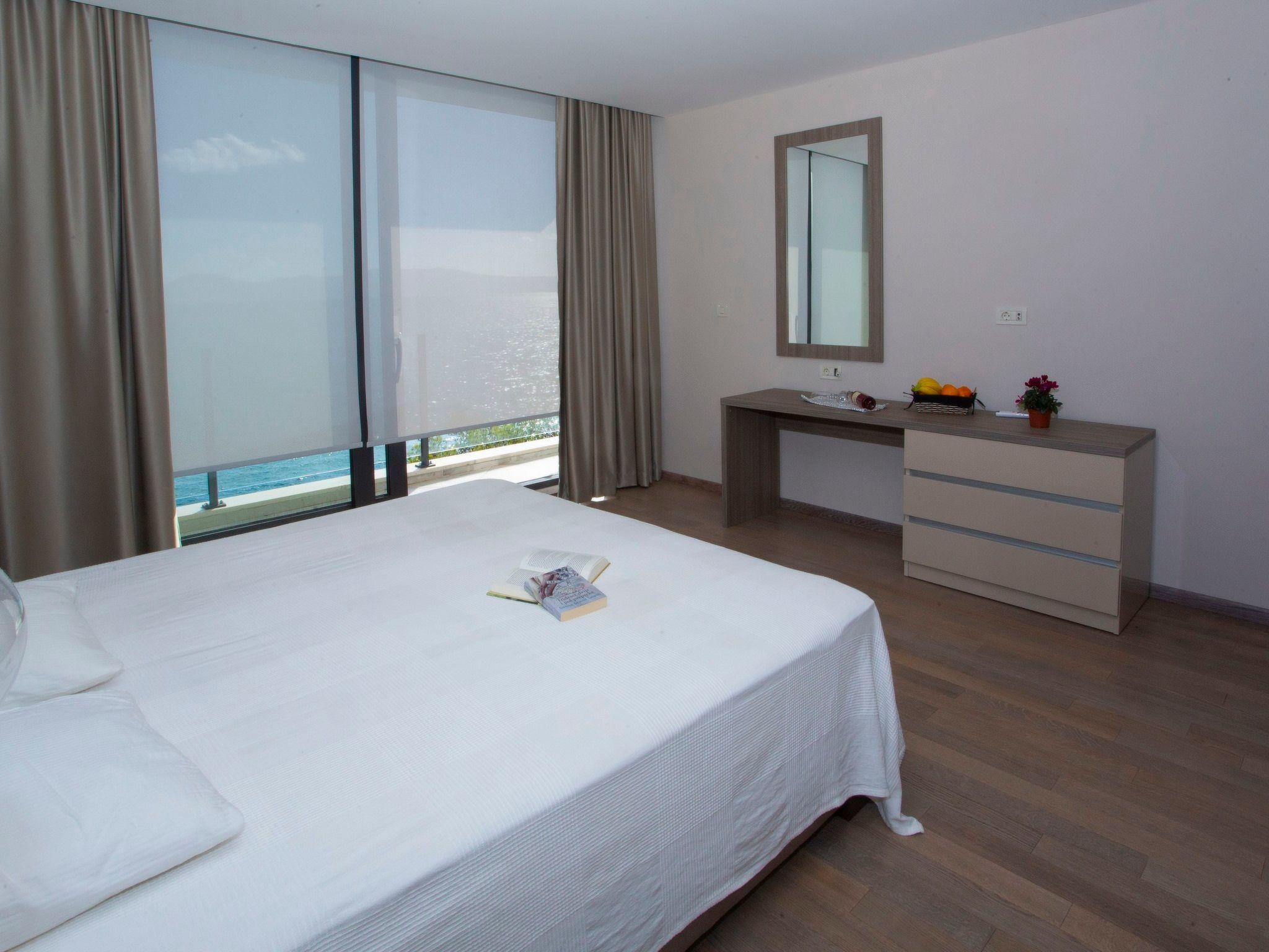 The villa’s exterior is nothing short of a paradise, offering panoramic sea views from its balcony and a private pool that serves as the centerpiece of relaxation. Surrounding the pool is a spacious terrace equipped with sun loungers, an outdoor dining table, and a grill, perfect for entertaining, whether it’s a family barbecue or a serene sunset dinner. The allure of dining under the stars or sunbathing with the backdrop of the Adriatic’s soothing hues is an experience in itself.
