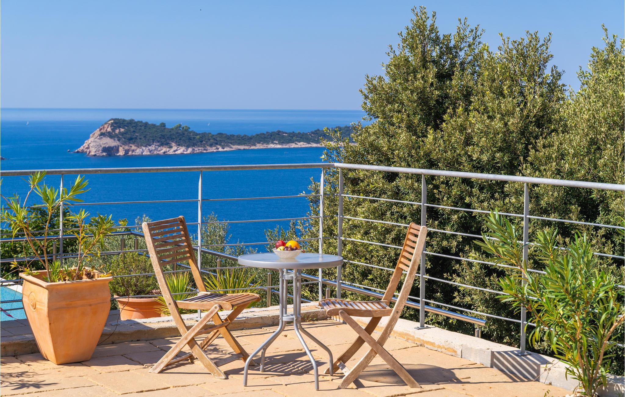 Efter et par svømmeture i poolen kan I læne jer tilbage på en liggestol og lade blikket vandre langt ud over havet. Den overdækkede terrasse danner den rette ramme for en varm sommeraften med kolde drinks.