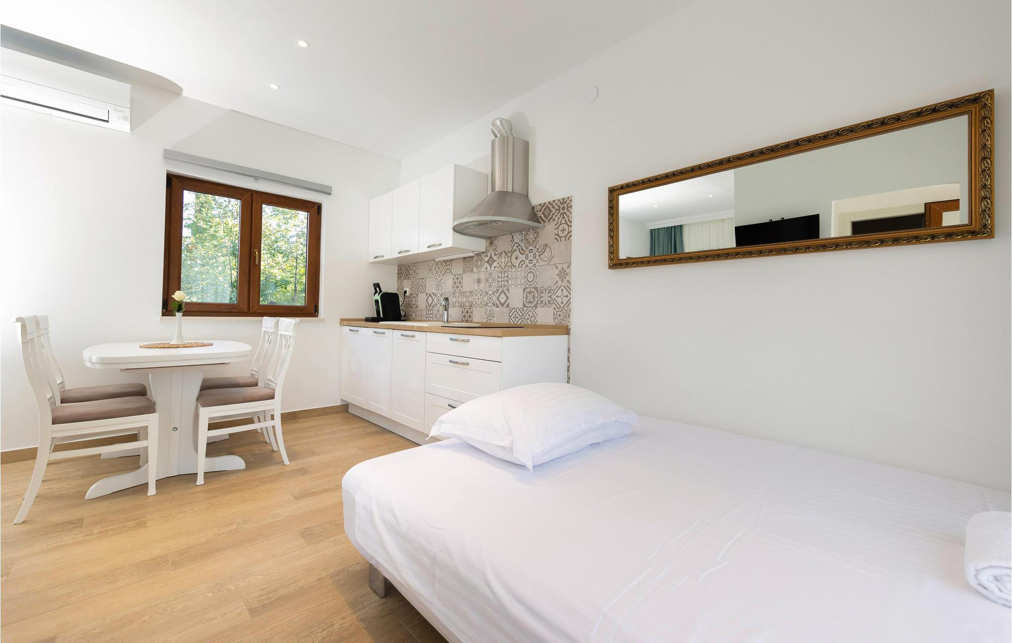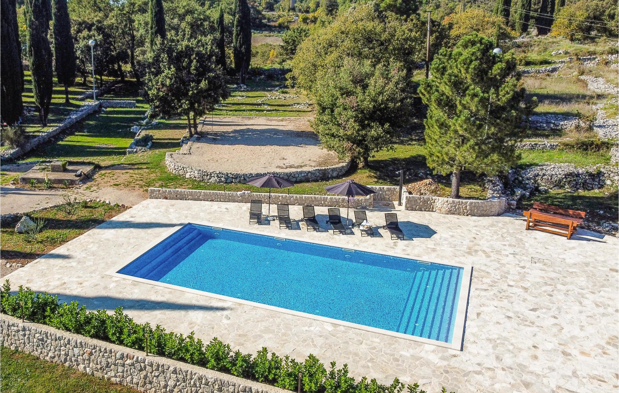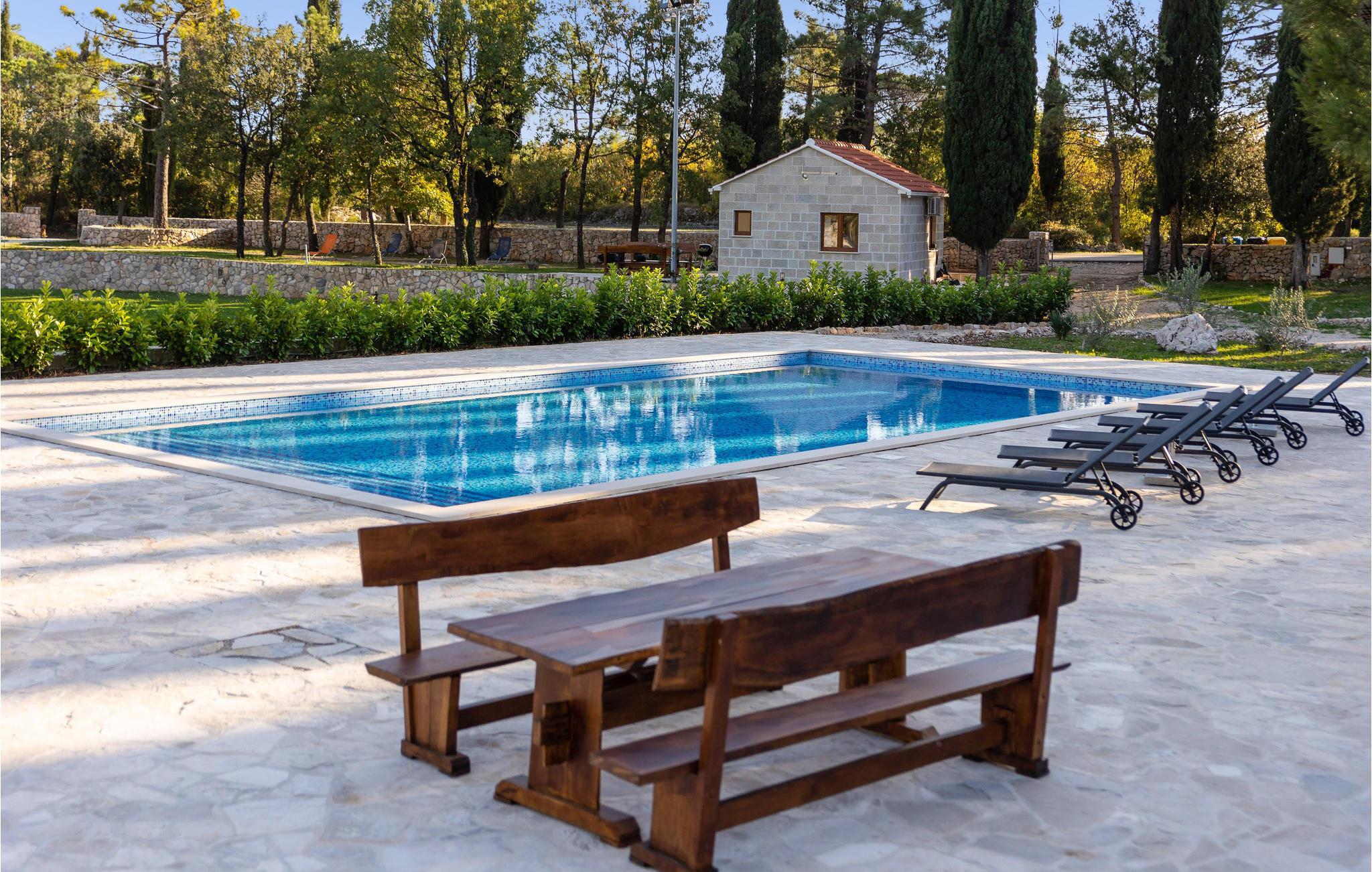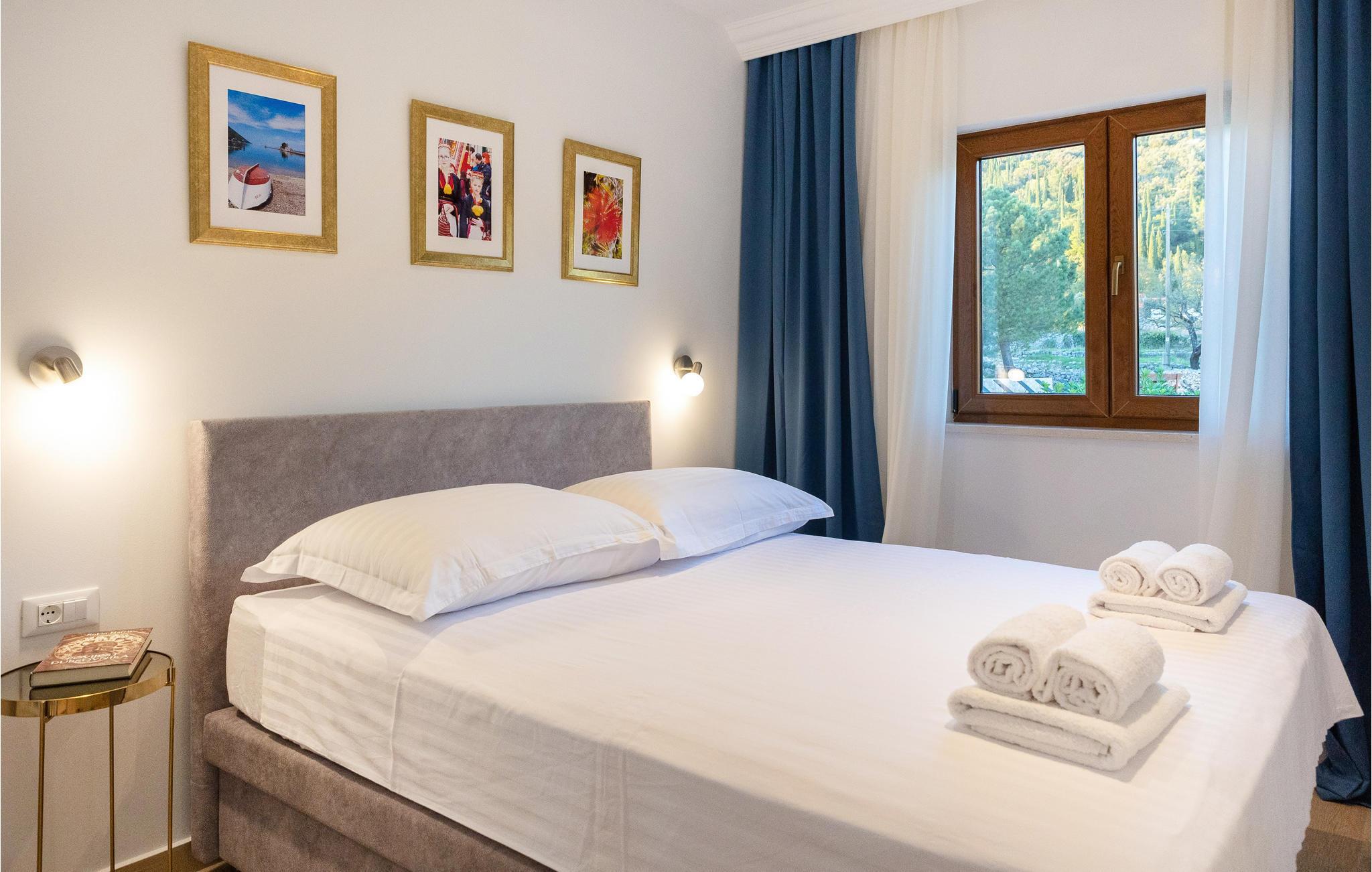 Her venter jer en skøn ferie i det sydlige Kroatien. Indkvarteringen består af to fuldt udstyrede, velindrettede huse i smagfuld, gennemført stil og med åben planløsning, der tillader et smart rum med alt-i-ét. Sammensmeltningen af alle husets funktioner formidler et fokus på samvær, og der er således lagt op til en par- eller familieferie med nærvær. Haven med sine talrige træer tilbyder jer ikke kun terrasserne, men også en stor swimmingpool med solterrasse, hvor I kan komme helt ned i gear og nyde roen omkring jer. Gå i gang med den bog, som I endnu ikke har haft tid til at læse, eller lyt til jeres yndlingspodcast i den frodige have.