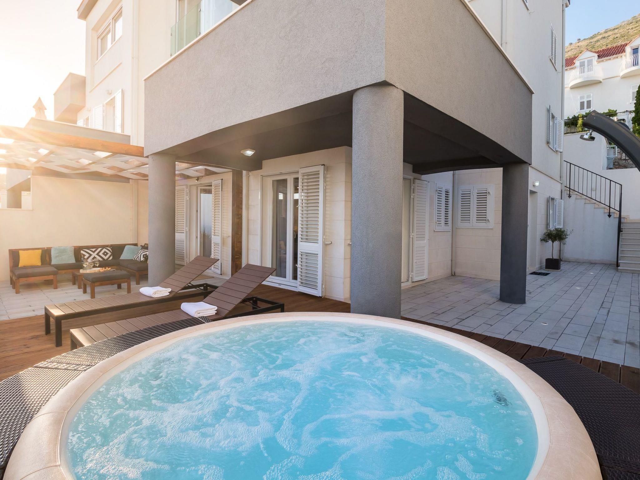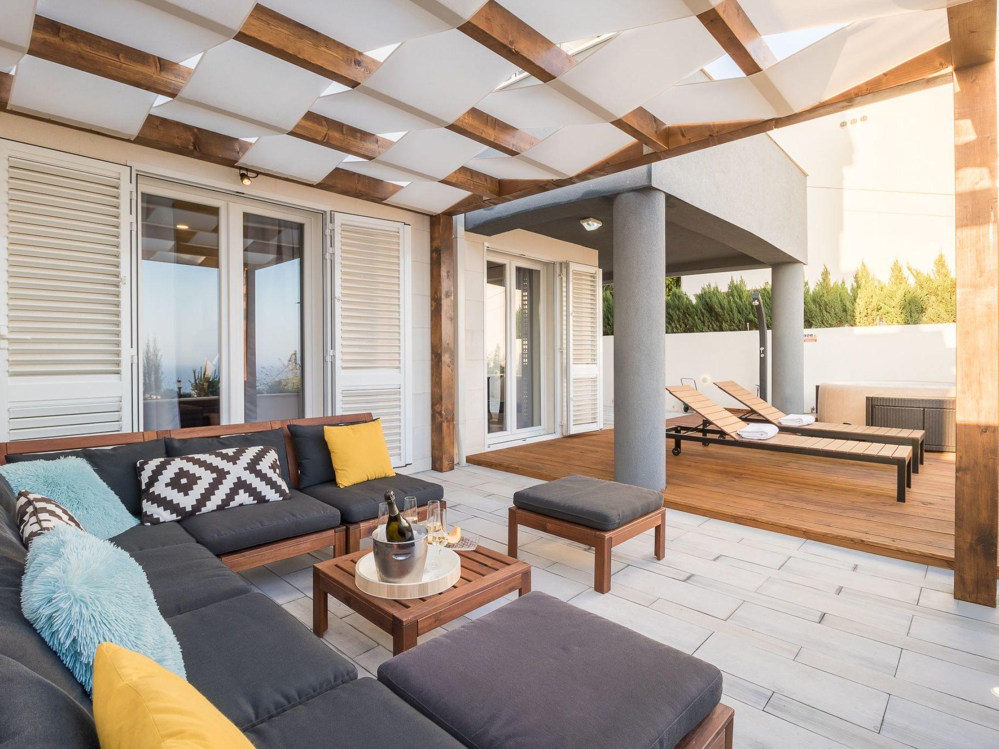 The outdoor area with terrace, comfortable garden furniture and jaccuzi has an area of 120 m².