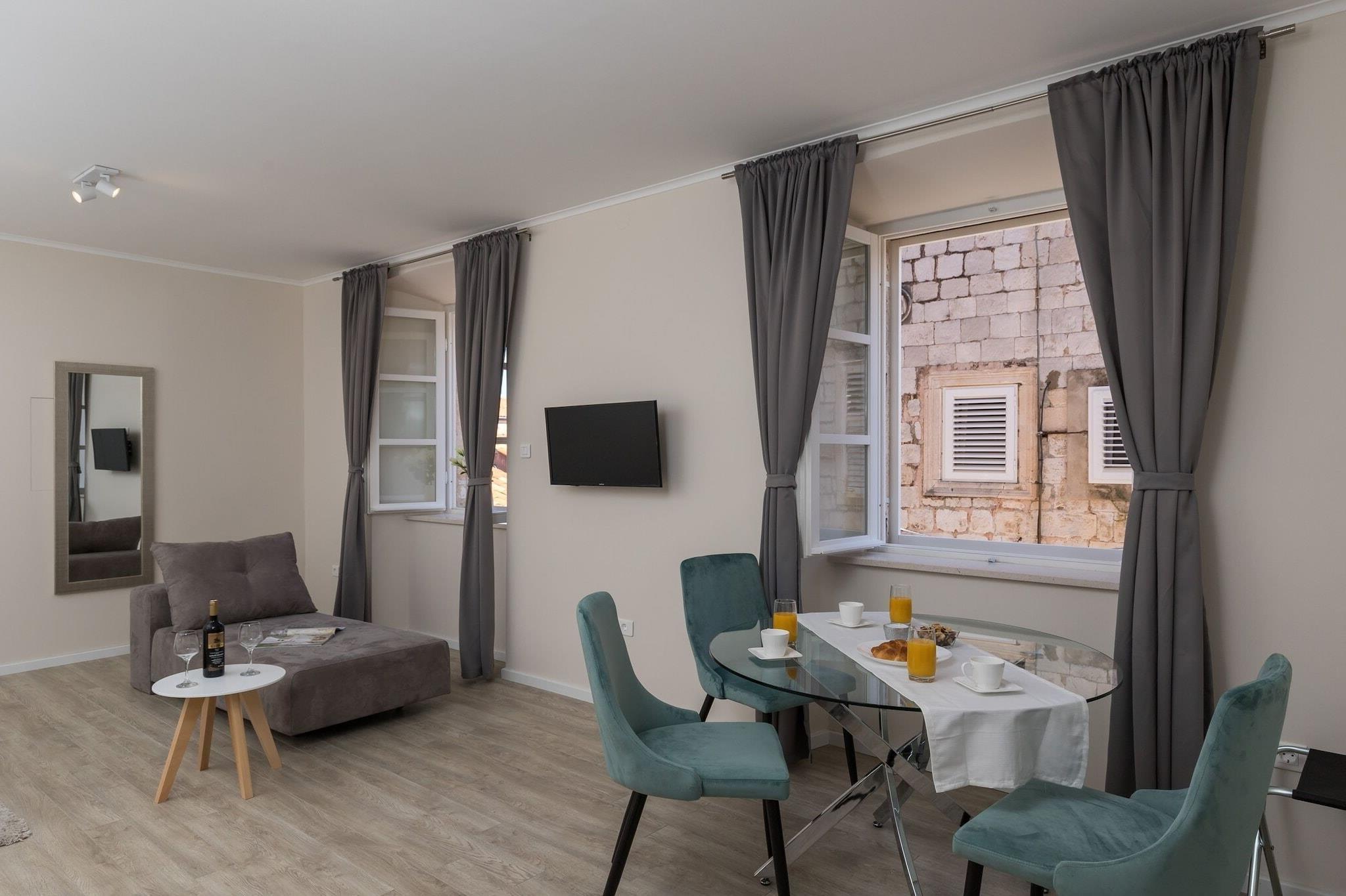 Apartments Urbis tilbyder tre indkvarteringer med egen forplejning beliggende i hjertet af den gamle bydel, omgivet af bymure, brostensbelagte gader og Stradun-promenaden, hvilket gør det til et ideelt sted for at udforske Dubrovnik. Hver enhed har spiseplads, tekøkken og privat badeværelse. Gæsterne vil have ubegrænset adgang til WiFi. Premium studiolejlighed med udsigt over byen har gratis wifi, aircondition, fladskærms-tv og satellit-tv, så som tekøkken udstyret med ovn, køleskab, elkedel, mikroovn og spiseplads, samt opholdsstue område med sofa. Lejligheden består også af badeværelse med bruser og hårtørrer. Den gamle bys centrale gade Stradun ligger kun 2 minutters gang væk. Lejligheden ligger kun 600 meter fra den nærmeste strand, Banje strand, med mange flere af dem i det omkringliggende område og den smukke ø Lokrum kun 15 minutters bådtur væk. Der er et udendørs grøntmarked og andre butikker inden for 190 meters gåafstand, samt et bageri, banker og pengeautomater, caféer, barer og restauranter med lokale og andre retter. Den berømte natklub Revelin, som ligger inde i det gamle fort, ligger kun 280 meter væk. Der er ikke behov for offentlig transport, mens du bor her, men hvis du vil se andre dele af byen, for eksempel den fredelige Lapad-bugt, kan du være der på 10 minutters kørsel. Taxa og busstation er 6 minutters gang fra ejendommen.Dubrovniks busstation og færgehavn, der forbinder fastlandet med forskellige dalmatiske øer, ligger 12 minutters kørsel fra lejligheden, mens Dubrovnik Lufthavn ligger 20,8 km derfra.