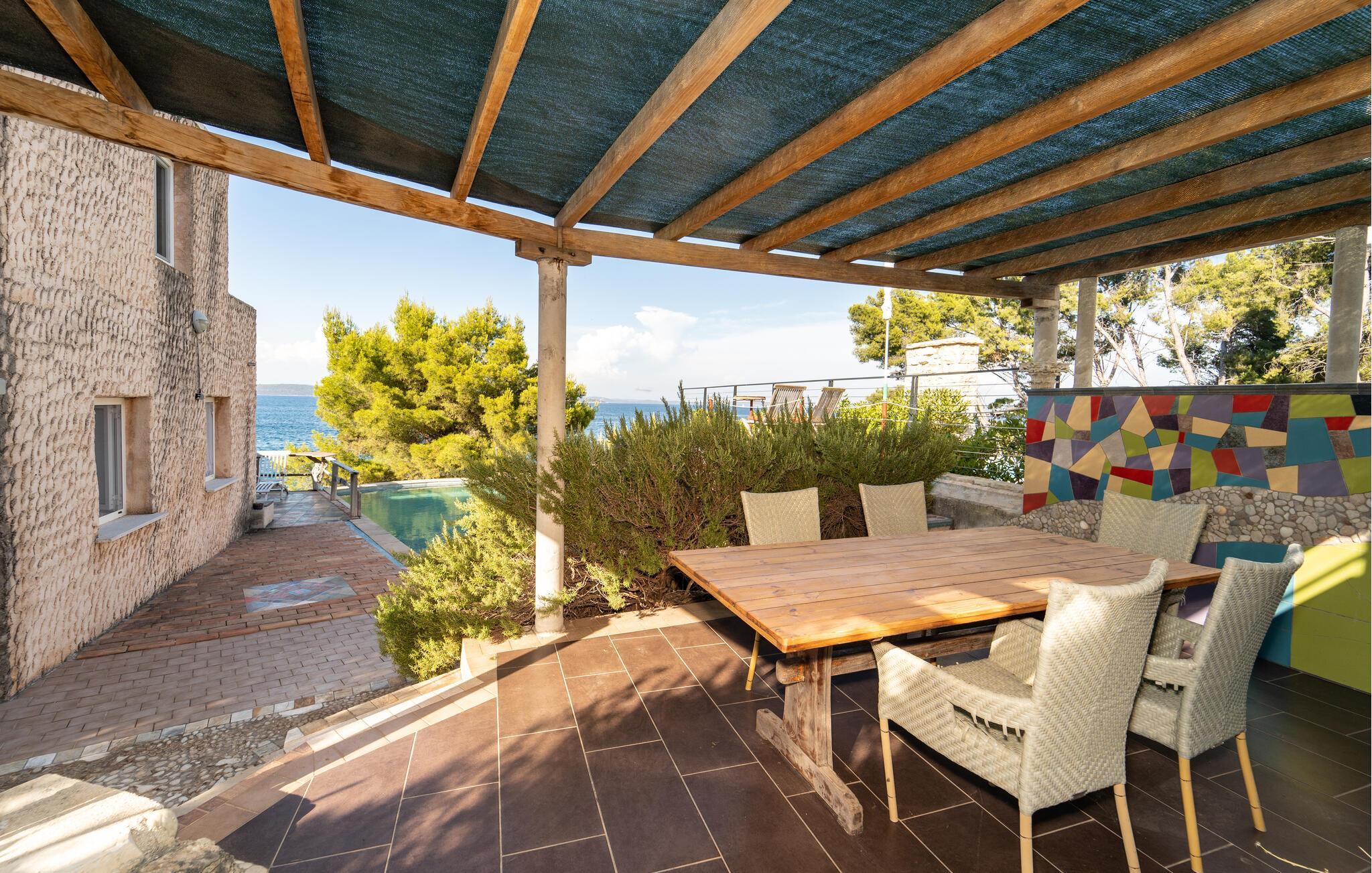 Drøm og slap af i dette store feriehus med saltvandspool lige ved havet.
