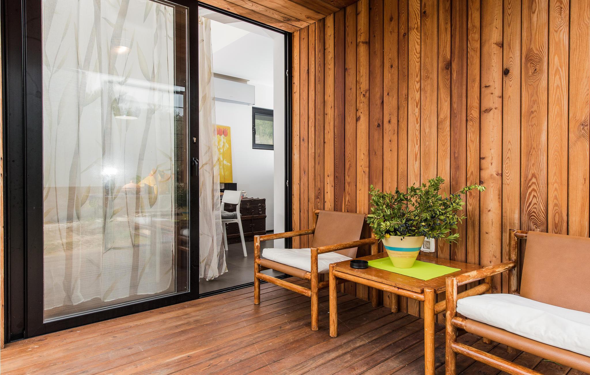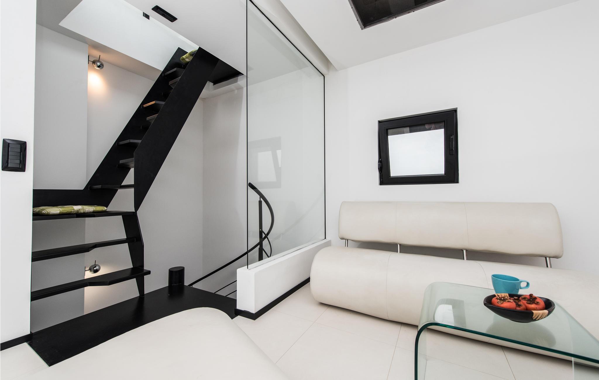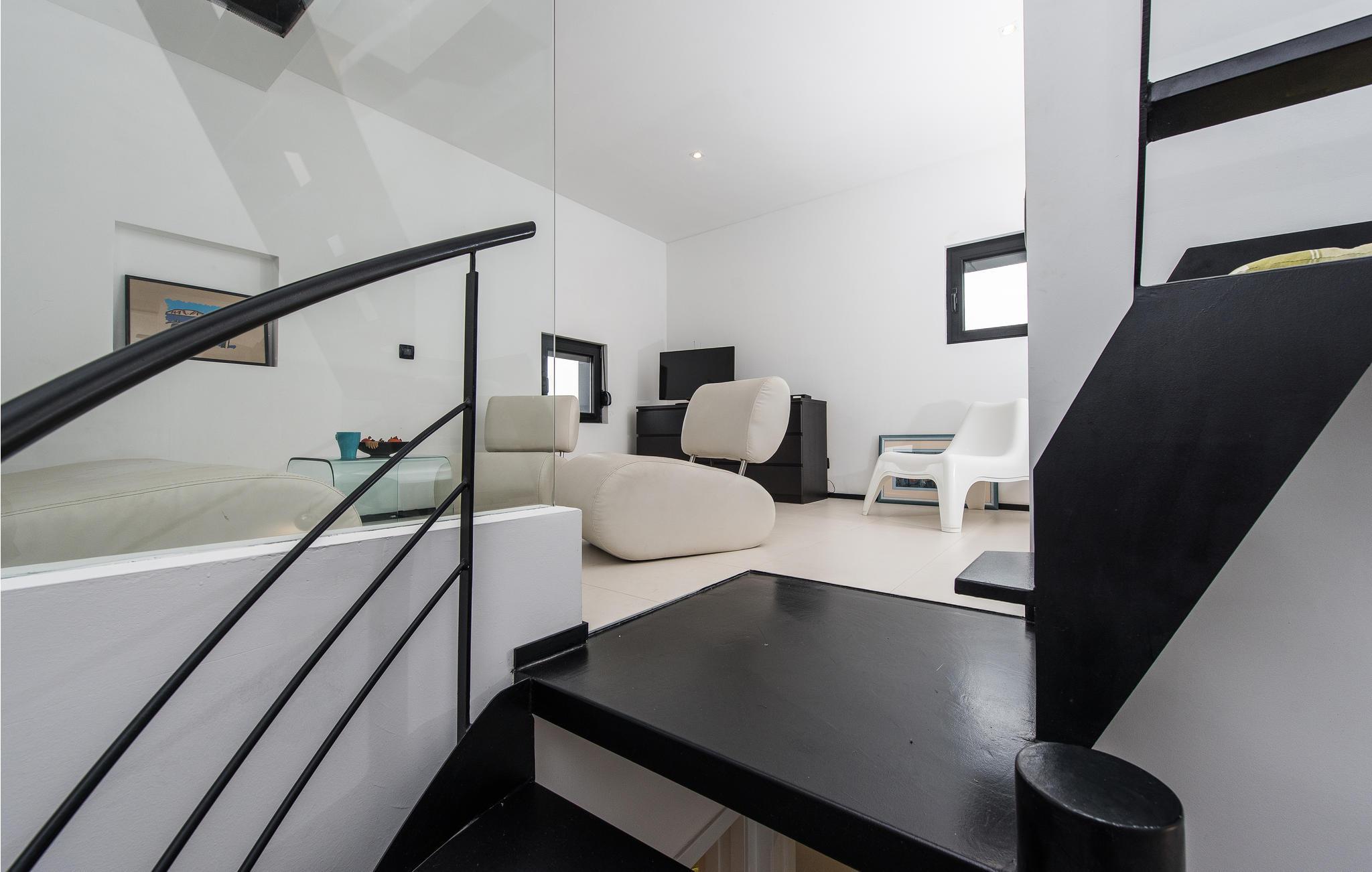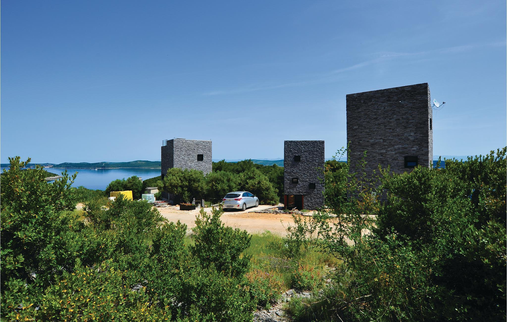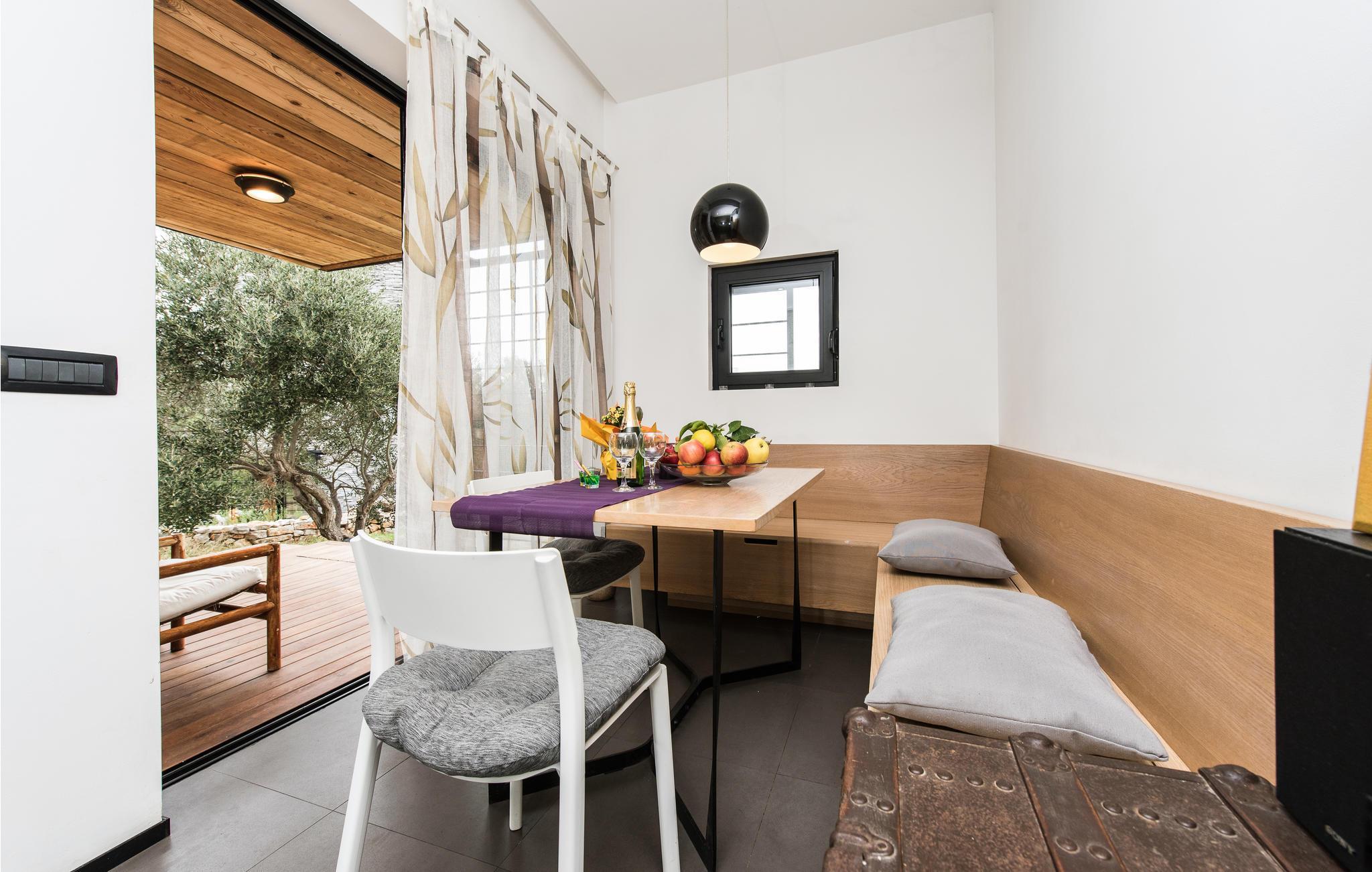 Dette meget specielle feriehus ligger smukt midt i naturen, der er domineret af små bugter med krystalblåt vand. Huset er indrettet med stor smag, og er lyst og indbydende. I stueetagen er køkkenet med spisestuen, på 1. sal finder I et soveværelse og badeværelse, mens på 2. sal en stue med seng inviterer jer til at slappe af. Da der ikke er nogen døre her, kan værelserne nås direkte fra trappen. Alle etager er forbundet med vindeltrapper.